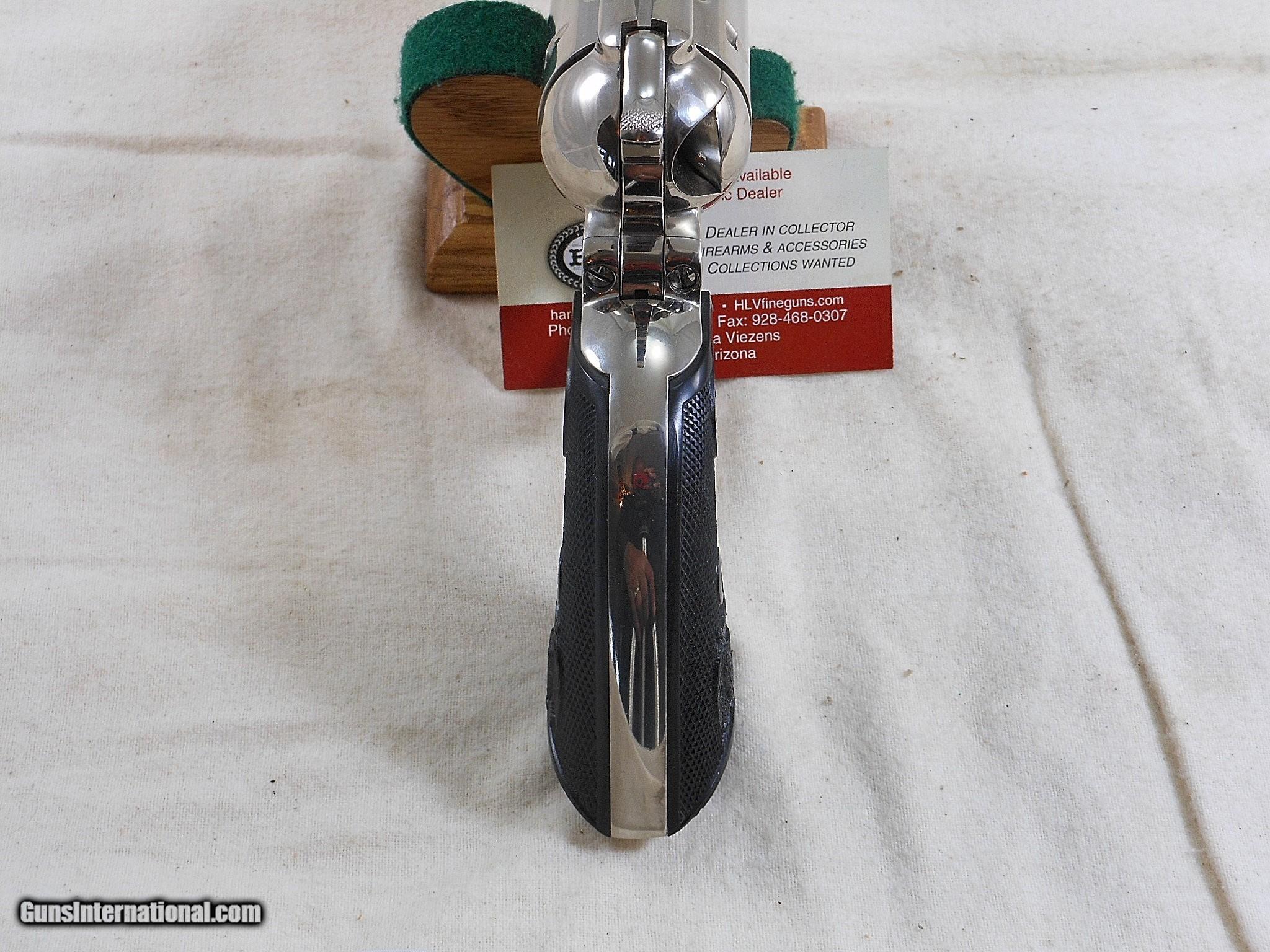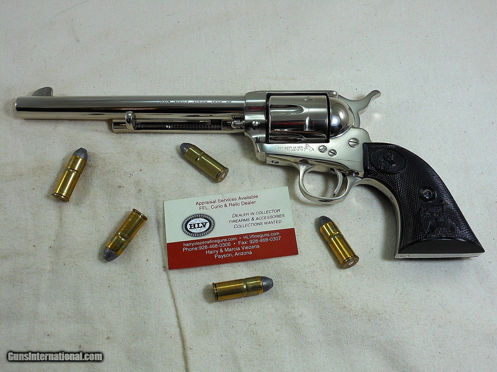 Description: This Colt was produced in 1970. The pistol's serial number is 55621 SA. It has the highly collectable 7 1/2 inch barrel chambered for the 45 Colt cartridge. This pistol has the full nickel finish. The Colt shows some very light working of the action. This pistol does not seem to have been fired. The original nickel finish would rate a 100% condition. The grips are serial numbered to this Colt. The action works perfectly and the timing is right on. For all purposes this Colt is in new condition with no issues. All that is needed is a box! These second generation pistols are not common with the 7 1/2 inch barrel and the full nickel finish. Here is a very stunning looking Colt that would be a show stopper in any collection. Curio&Relic LKAE (11) F. No. 633 -22 SOLD Handgun Caliber: .45 Colt Manufacturer: Colt Model: Single Action Army Serial Number: 55621 SA Barrel Length: 7 1/2 Inch Chambers: AS New Condition: 100% Metal Condition: As New Bore Condition: As New Barrels: 7 1/2 Inch Barrel Type: Round Action: Single Action Finish: Nickel Plated Sights: Standard Manufacture Date: 1970 |