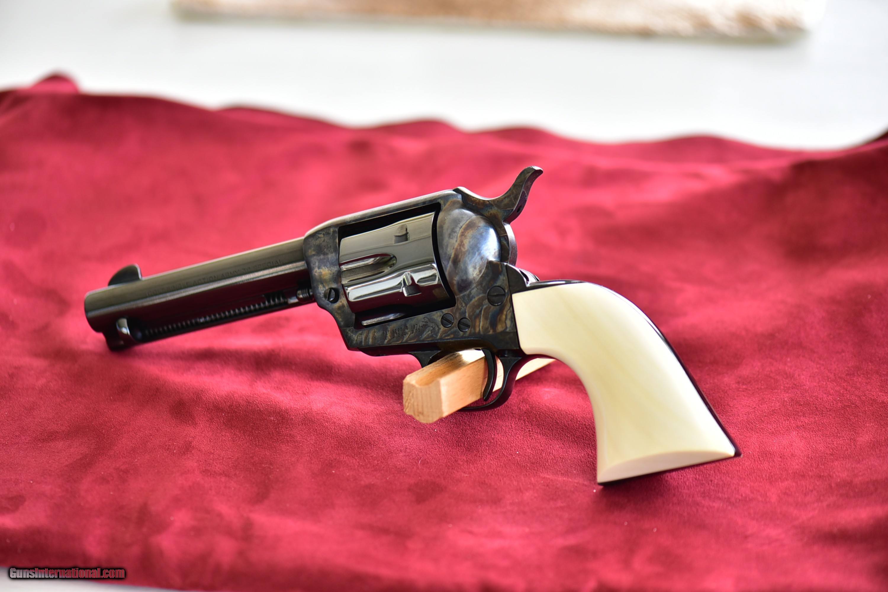 Description: THIS IS A BEAUTIFUL SECOND GENERATION COLT WITH NICELY FIGURED ONE PIECE IVORY GRIPS. THIS COLT HAS OUTSTANDING CASE COLORING AND BLUING. ALONG WITH A 43/4" BARREL IT ALSO INCLUDES THE ORIGINAL 7 1/2 INCH BARREL. THE EARLY 2ND GENERATIONS ONLY CAME WITH EITHER .45 COLT OR 38 SPECIAL WITH 5 1/2" OR 7 1/2" BARRELS. MANY GUNS WERE CONVERTED TO THE SHORTER BARREL FOR QUICK DRAW REASONS. FINDING AN EARLY GUN WITH A LONGER BARREL IS VERY RARE. THE GUN APPEARS TO BE UNFIRED. THE ORIGINAL 7 1/2" BARREL IS LIKE NEW. THE GUN IS PRISTINE, IT HAS NO DINGS, TURN LINE, SCRATCHES OR ANY HANDLING MARKS OF ANY TYPE. UNFORTUNATELY THE BOX IS MISSING BUT IT WILL COME WITH THE PADDED CASE SHOWN IN THE PICTURE. I have noticed other cased guns where the hammer is also cased. These have been identified as Turnbull restorations. I don't know if he restored this gun but I thinkl it's quite possible that he did. SOLD Handgun Caliber: .38 Special Manufacturer: Colt Mfg Co Model: Single Action Army Serial Number: 1847SA Barrel Length: 4 3/4 Bore: Excellent Chambers: Excellent Condition: Excellent Metal Condition: Excellent Bore Condition: Excellent Barrels: Excellent Action: Crisp Finish: Blue and Case Colored Manufacture Date: 1956 Case: Outstanding |