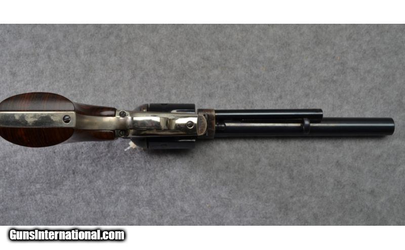 Description: A nice Colt Single Action Army revolver in .357 Magnum. This revolver is a 2nd Generation SAA made in 1973. It has a 7 3/8 inch barrel with front post and rear grooved reciever. This barrel is gloss blue with Hogleg engraved on the left side. The receiver is nicely case color hardened and it has a nickle plated trigger guard and grip strap. It comes with smooth wooden grips with Colt Custom gold medallions. This revolverl comes with a Colt Custom Shop box. A nice addition to your collection. SOLD Manufacturer: 1973 Caliber Info: .357 Mag. Chambers: 6 shot revolver. Metal Condition: Good with some wear on the nickle finish. Wood Condition: Excelllent. Bore Condition: Shiny and bright. Barrels: 7 3/8 inch blued. Triggers: Single - blued. Stock: Colt Custom smooth wood grips with Gold medallions. Weight: 2 Lbs 2 Oz Sights: Front post / rear grooved reciever. Extras: Colt flip up box. Item Location: Woodbury, MN |