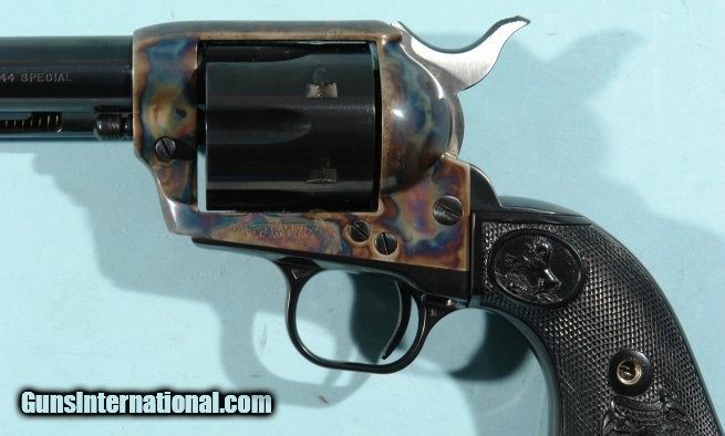 Description: COLT SINGLE ACTION ARMY .44 SPECIAL CAL. 5 ½” BLUE & CASE HARDENED REVOLVER CA. 1979 IN ORIG. BOX. All original and may have been fired a few rounds but looks unfired and new with 100% blue and beautiful color case hardening. Mint bore and as new working order. Original box numbered to the gun with all the original papers and Instructions Manual. SOLD |