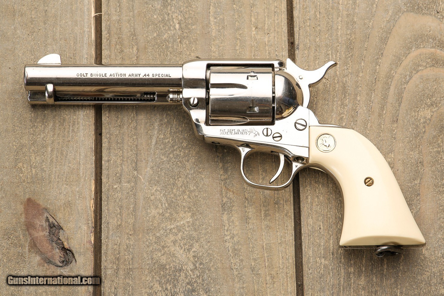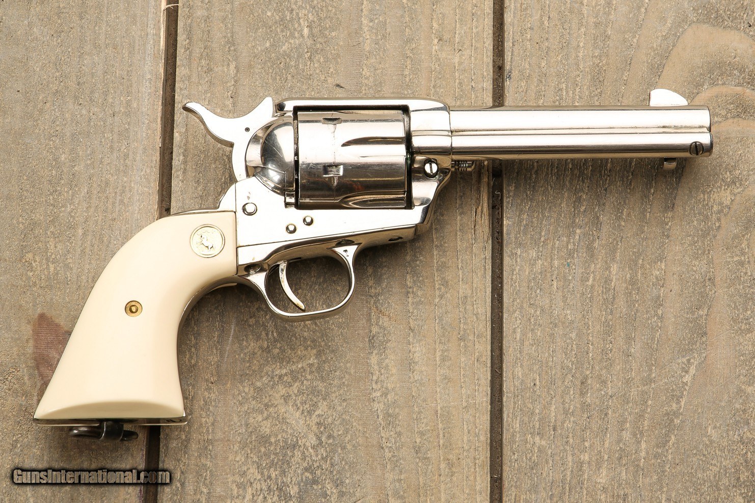 This is a 1979 Production. It is in very good condition with slight muzzle wear. White plastic grips with colt medallion. Someone added a small lawyand ring.