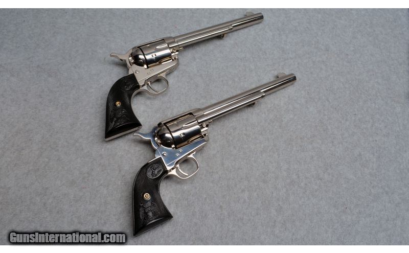 Description: This is a pair of Colt Single Action Army revolvers in .45 Colt. Both of the revolvers are in excellent condition and have never been fired, There is no cylinder ring on either gun.. These Colt revolvers come in a hard wood case lined with red velvet with Colt logo inside and outside. These revolvers would make a nice addition for a Colt collector. These will be sold as a set only! SOLD Curio/Relic: Yes Manufacturer: Circa 1960. Caliber Info: .45 Colt. Chambers: Revolver. Metal Condition: Excellent with very little signs of use. Wood Condition: Grips are in excellent condition. Bore Condition: Very good, bright and shiny. Barrels: 8 inch highly polished nickel with blade front sight. Triggers: Highly polished nickel in single action only. Stock: Black plastic Colt grips with eagle. Weight: 39 ozs. Sights: Groove rear and blade front. Extras: Comes in hard wooden display case. Item Location: Hazelwood, MO |