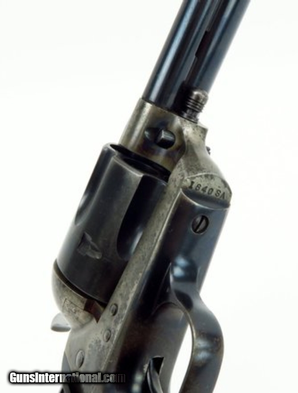 Description: Colt Single Action Army .45 LC caliber revolver. Early 2nd Gen Colt Single Action. First year of production with serial â„– 1640SA. Barrel length is 51½”. The bore is excellent and action works perfectly. Gun has approximately 20% case colors and 75% blue. Grips are numbered to the gun, but do not fit perfectly and are later Colt eagle grips. Dark spots on the frame are not pits. Very neat low serial Single Action Army. SOLD |