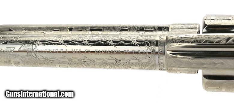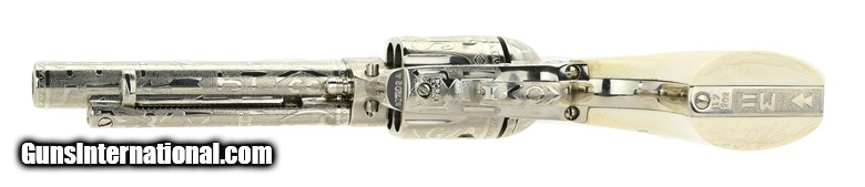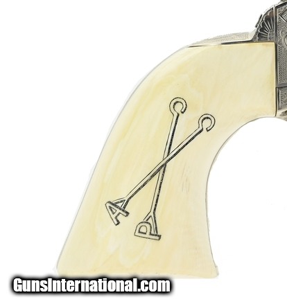 Description: Colt Single Action Army Engraved .45 caliber revolver. Custom cattle brand engraved 3rd Gen model. Has a 5 ½” barrel, nickel finish and one piece ivory grips with cattle brands scrimshawed on them. A beautiful piece.