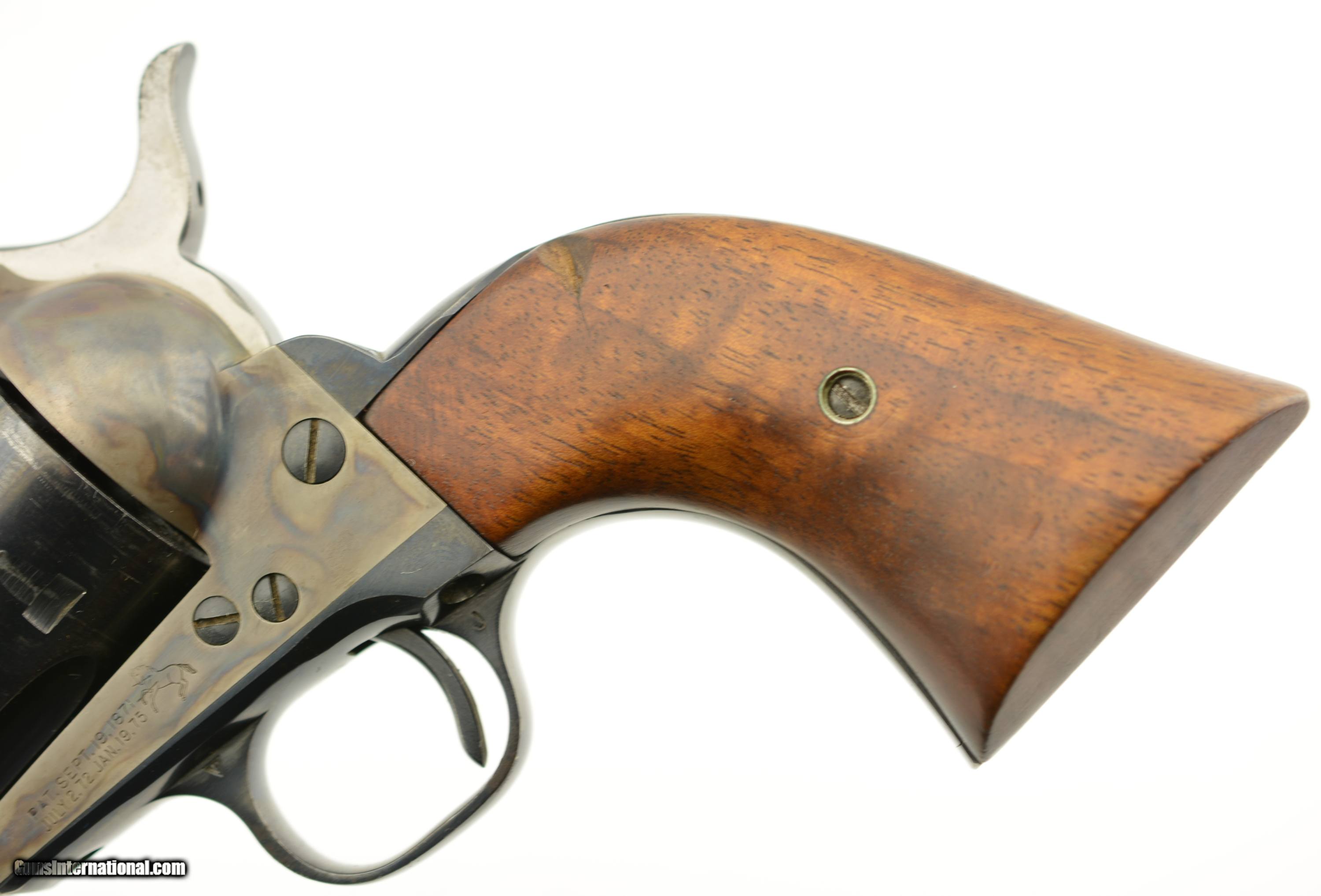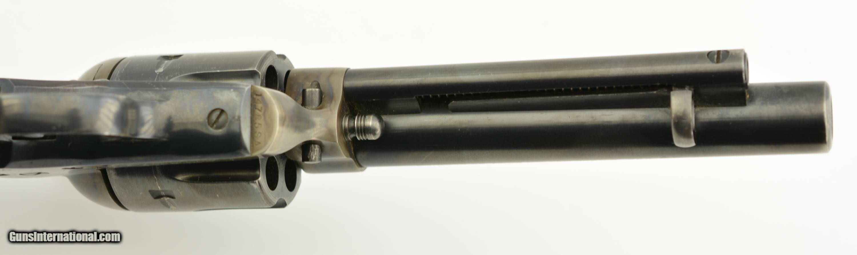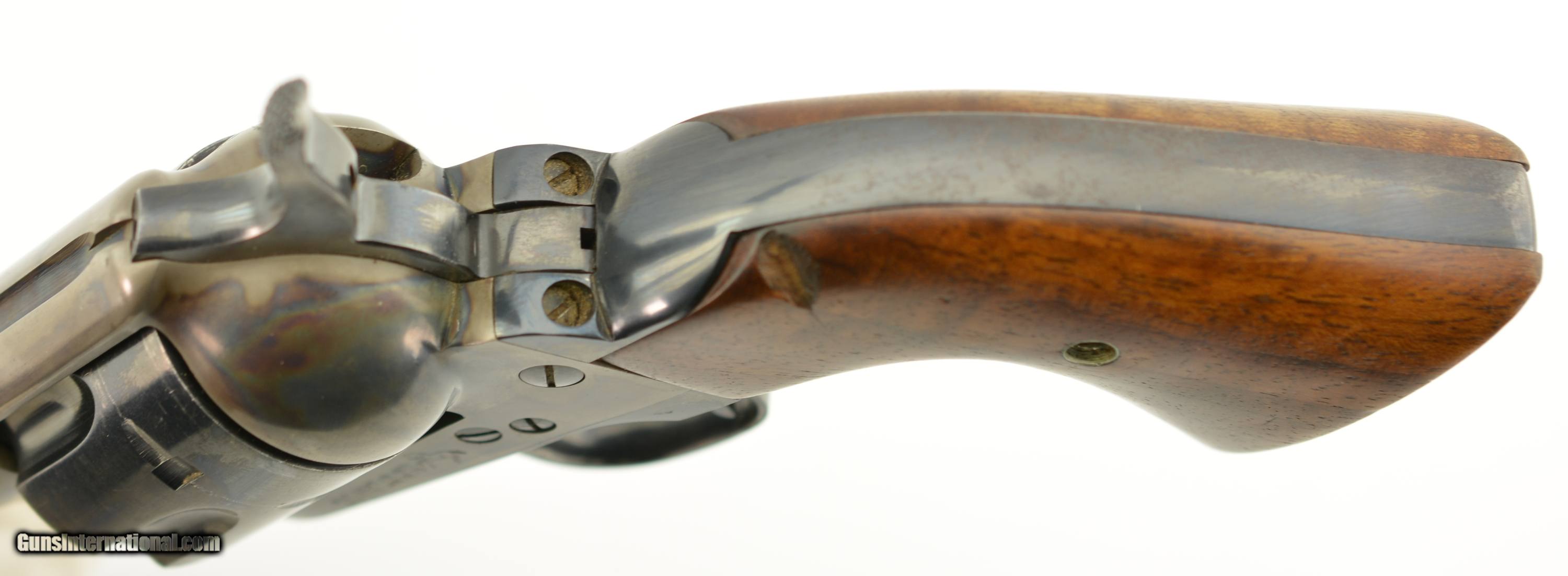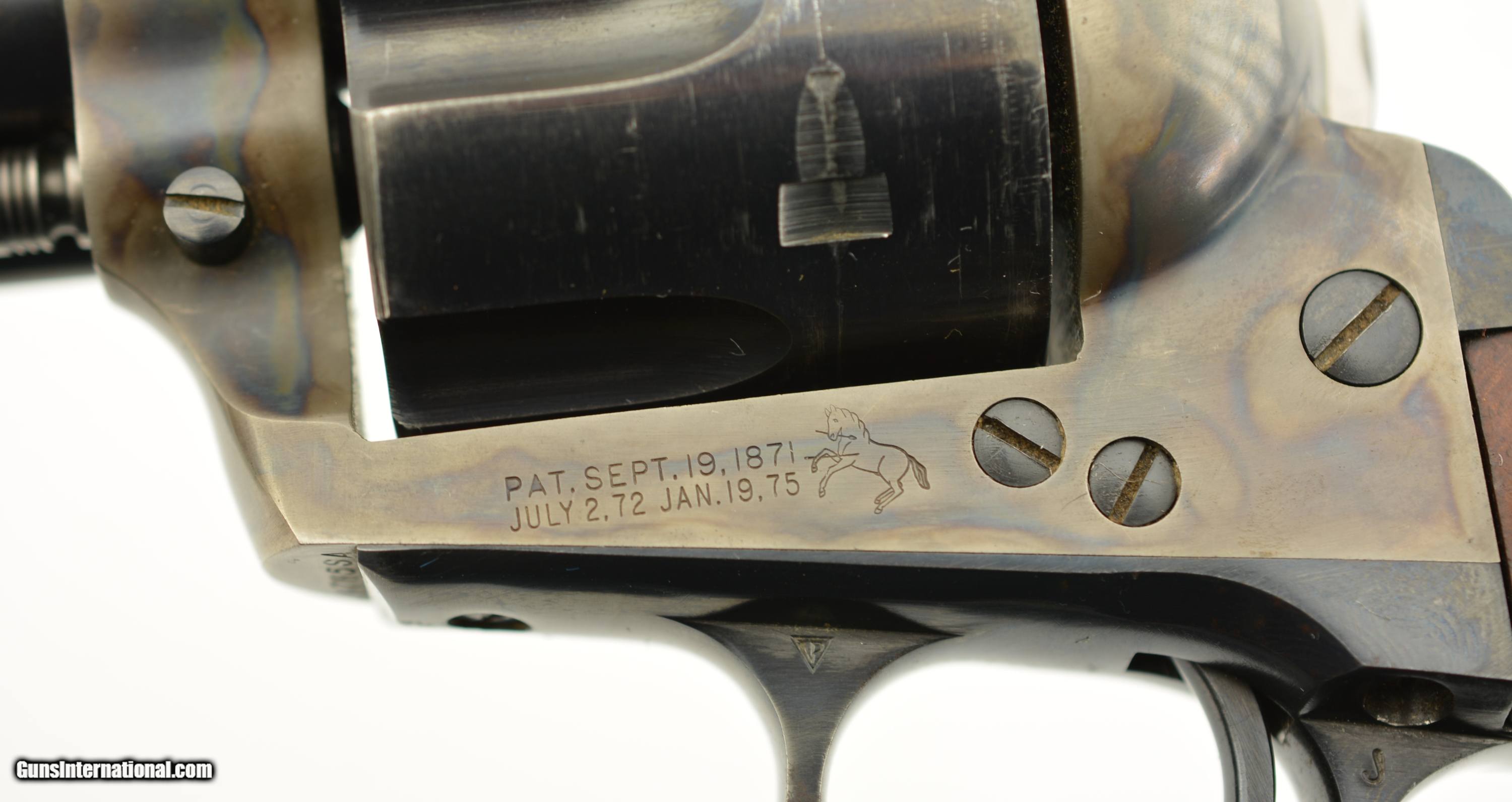 Description: Serial #14785SA, .38 Special, 5 1/2" barrel with an excellent, bright bore. This is a very nice, 1957-made revolver that has 95-97% of the original blue remaining with some minor silvering at the muzzle, tip of the ejector rod housing, and along the high edges and projections. There is a bright turn-ring on the cylinder, and the frame retains nearly all of the lovely and bright original color case-hardening. The smooth walnut grips are in excellent shape with only some minor handling marks in the otherwise excellent oil finish. This is a very handsome 2nd "Genny" Colt, in fine plus condition, and chambered in a great competition cartridge. FFL or C&R SOLD Curio/Relic: Yes Manufacturer: Colt Model: SAA Serial Number: 11666SA Caliber Info: .38 Spl Gauge Info: .38 Spl |