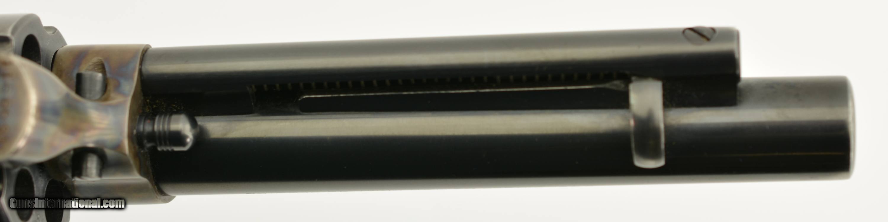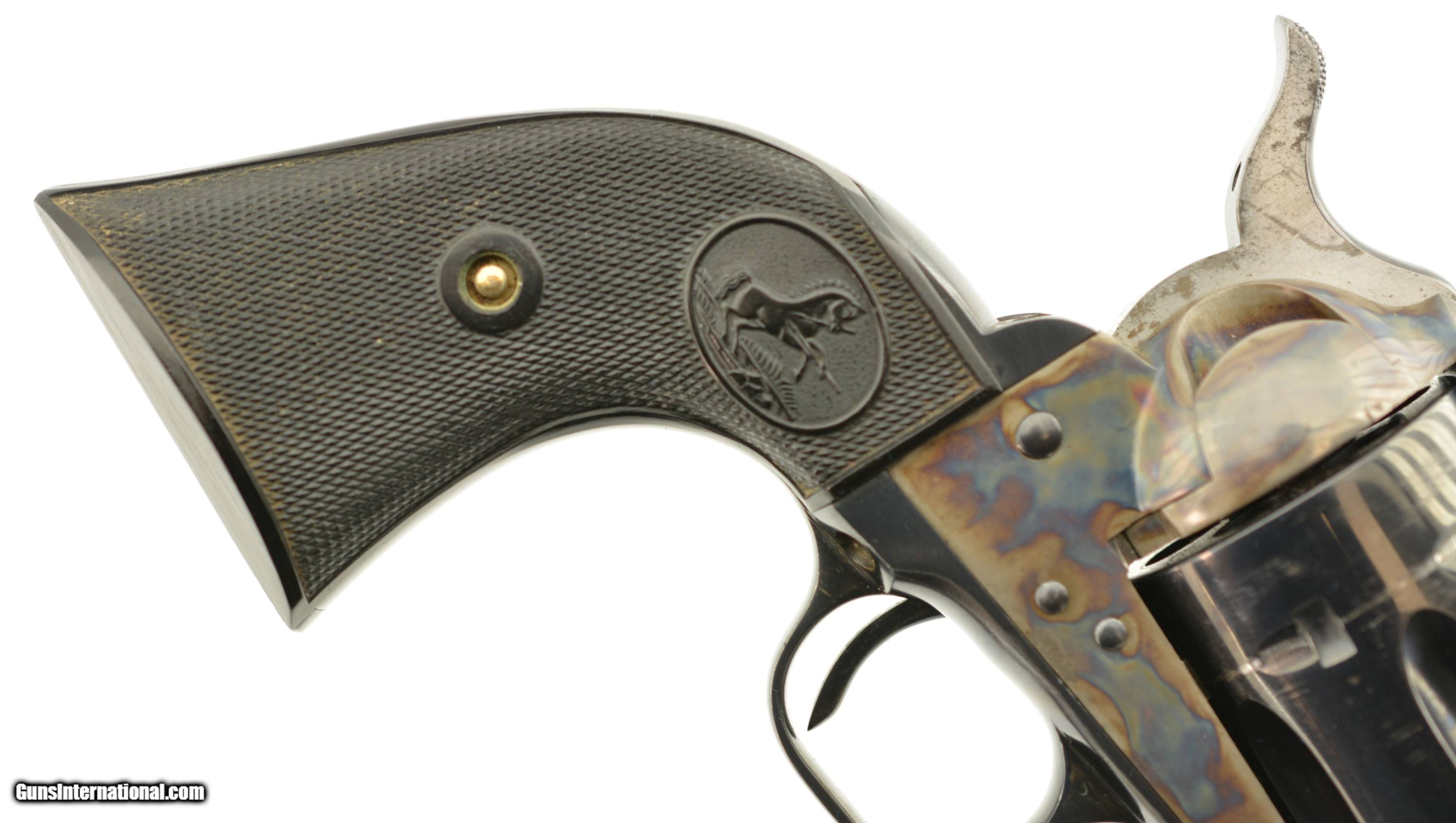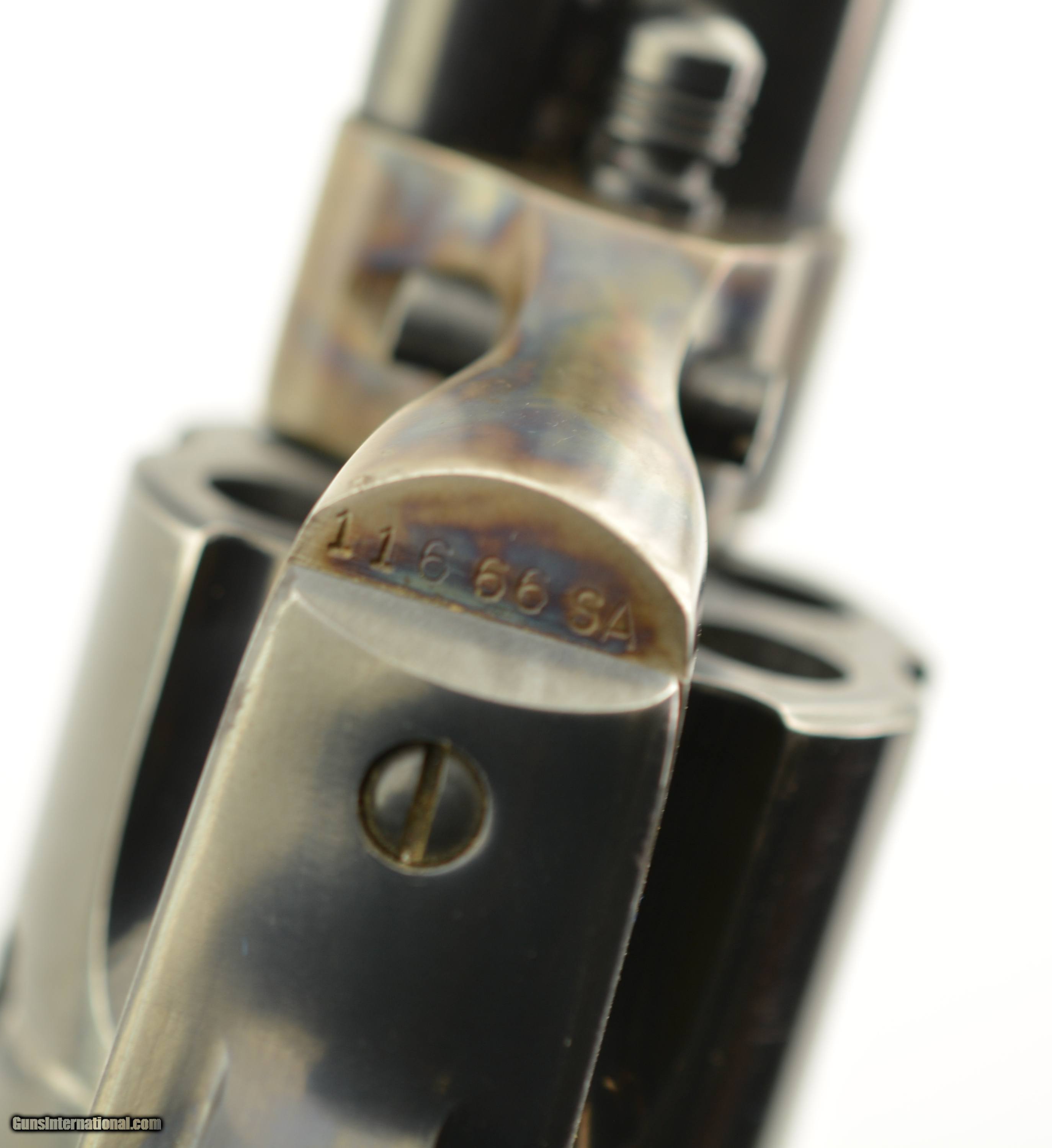 Description: Serial #11666SA, .38 Special, 5 1/2" barrel with an excellent, bright bore. This is a beautiful, 1957-made revolver that has 95-97% of the original blue remaining with only some minor silvering at the muzzle, tip of the ejector rod housing, and along the high edges and projections. There is a bright turn-ring on the cylinder, and the frame retains nearly all of the lovely and bright original color case-hardening. The grips are the original checkered black resin with Rampant Colts and are in fine condition with some very mild flattening of the points, some minor surface wear along the edge of the butt on both sides, and some ingrained dirt within the checkering. This is a very handsome 2nd "Genny" Colt, in fine-near excellent overall condition, and chambered in a comparatively easy to get cartridge. FFL or C&R SOLD Curio/Relic: Yes Manufacturer: Colt Model: SAA Serial Number: 11666SA Caliber Info: .38 Spl Gauge Info: .38 Spl |
