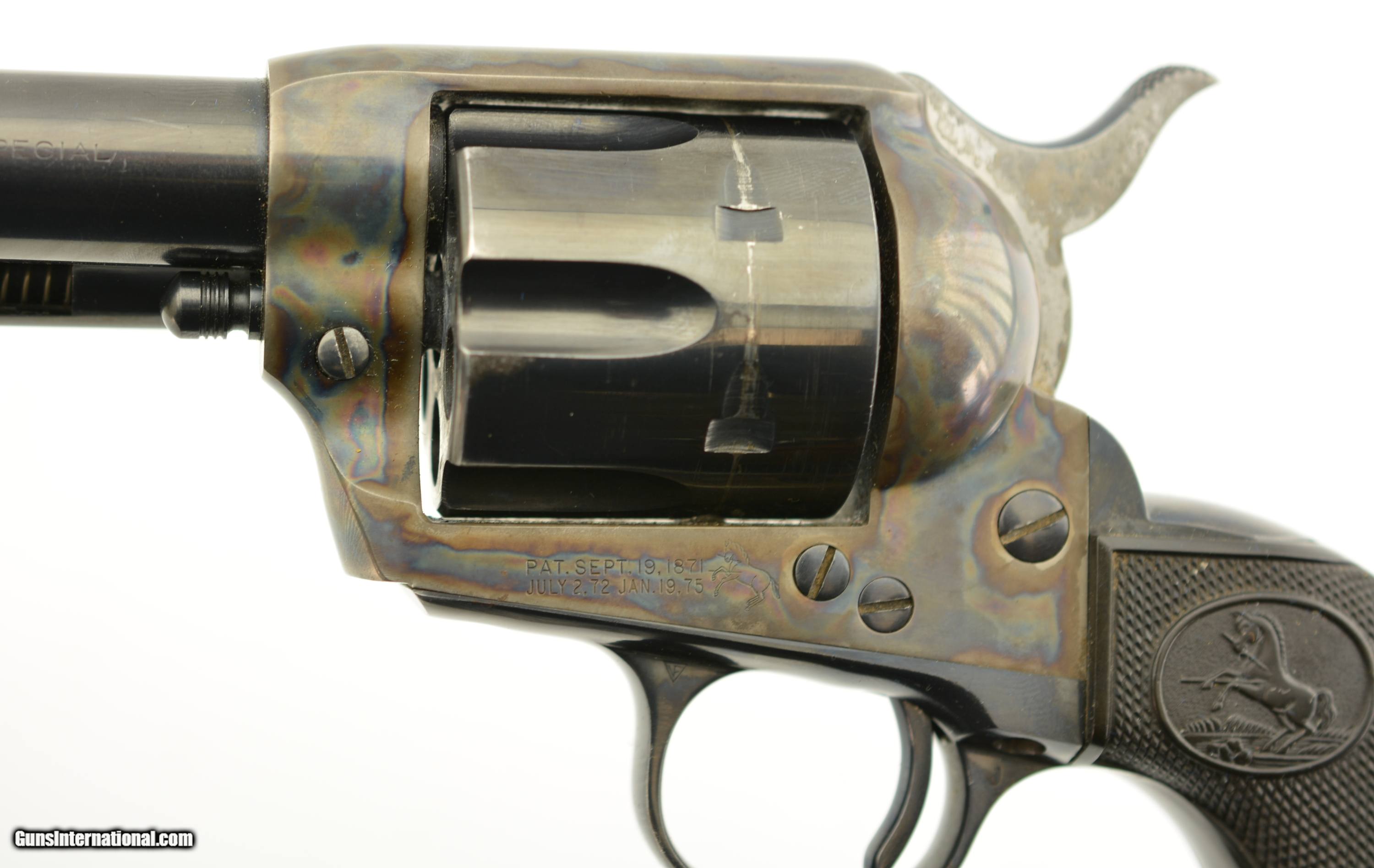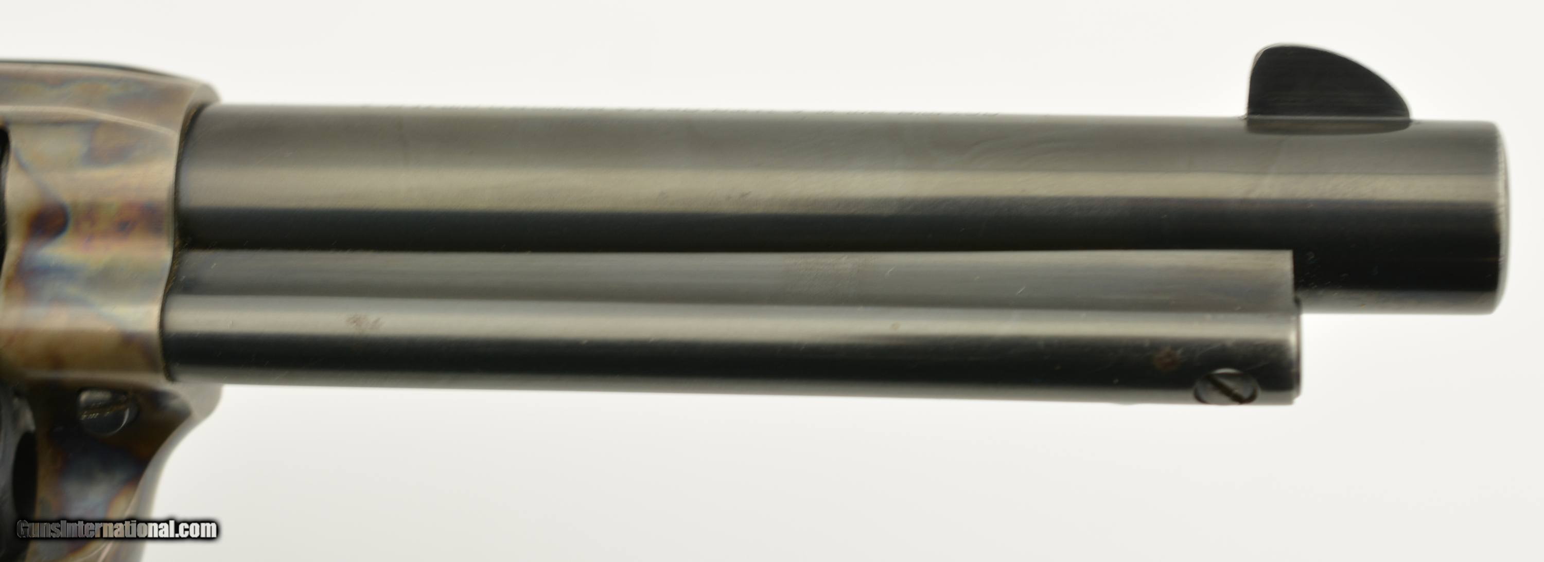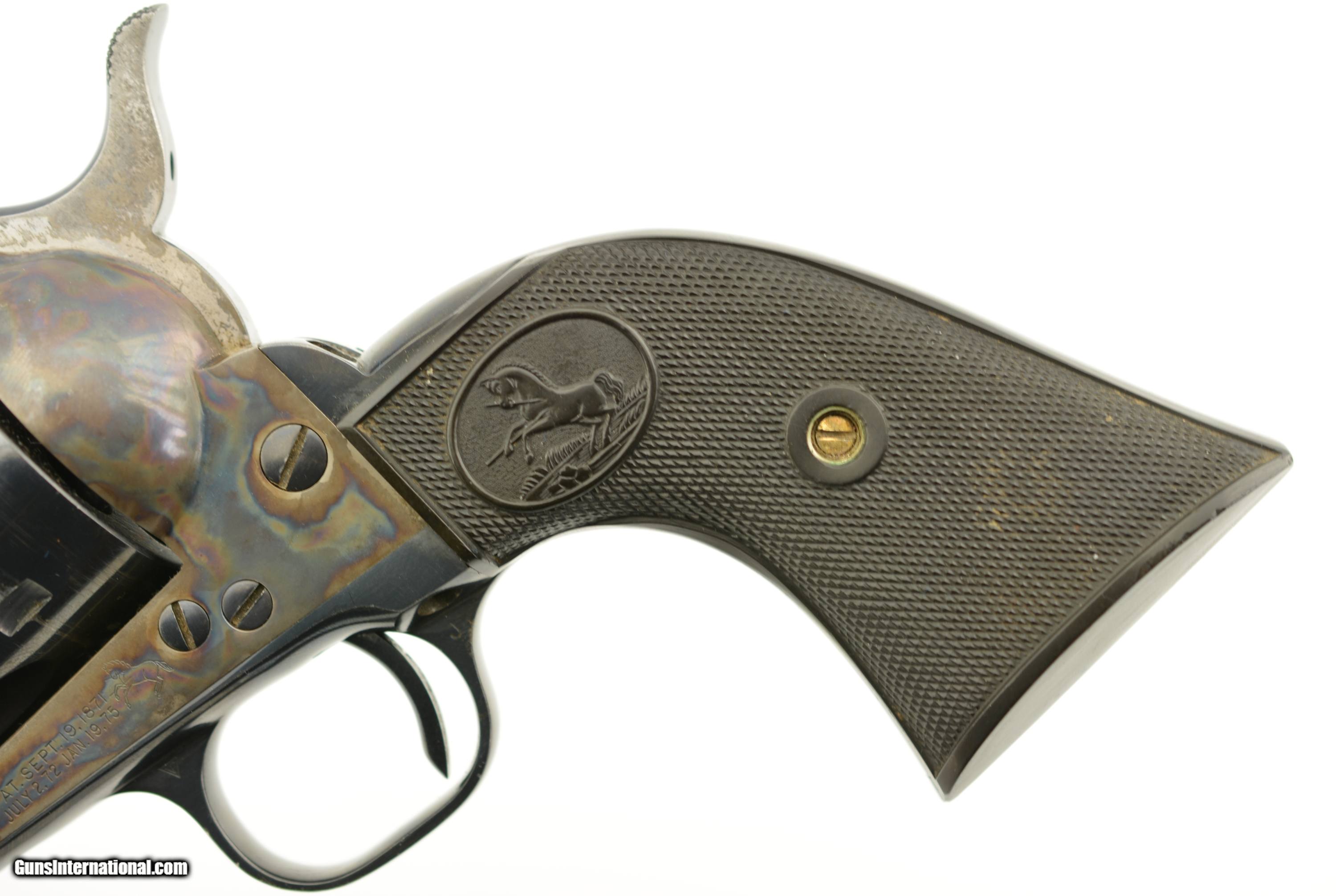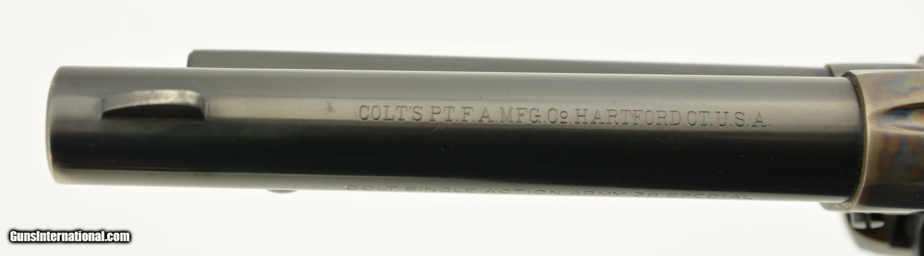 Description: Serial #11666SA, .38 Special, 5 1/2" barrel with an excellent, bright bore. This is a beautiful, 1957-made revolver that has 95-97% of the original blue remaining with only some minor silvering at the muzzle, tip of the ejector rod housing, and along the high edges and projections. There is a bright turn-ring on the cylinder, and the frame retains nearly all of the lovely and bright original color case-hardening. The grips are the original checkered black resin with Rampant Colts and are in fine condition with some very mild flattening of the points, some minor surface wear along the edge of the butt on both sides, and some ingrained dirt within the checkering. This is a very handsome 2nd "Genny" Colt, in fine-near excellent overall condition, and chambered in a comparatively easy to get cartridge. FFL or C&R SOLD Curio/Relic: Yes Manufacturer: Colt Model: SAA Serial Number: 11666SA Caliber Info: .38 Spl Gauge Info: .38 Spl |