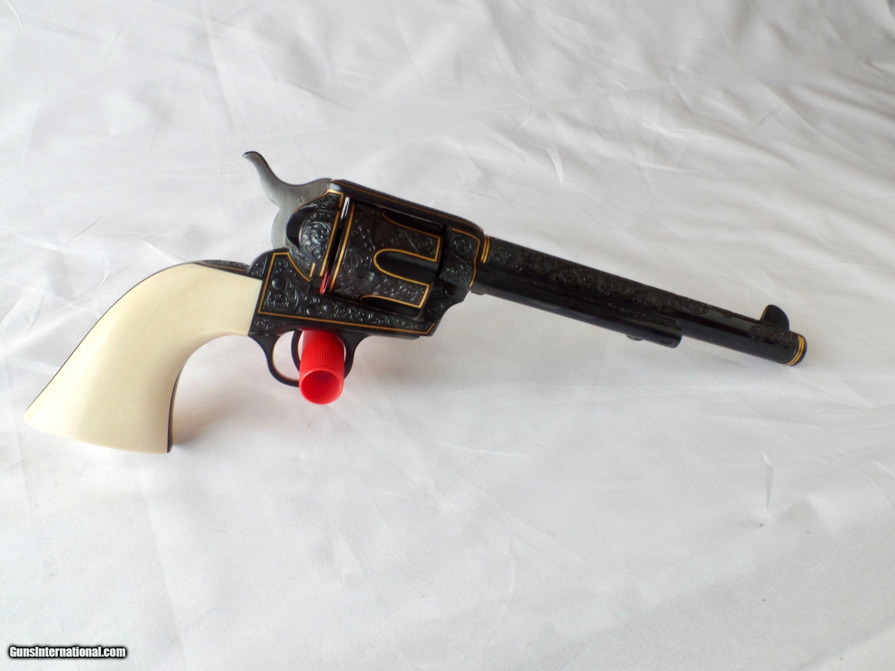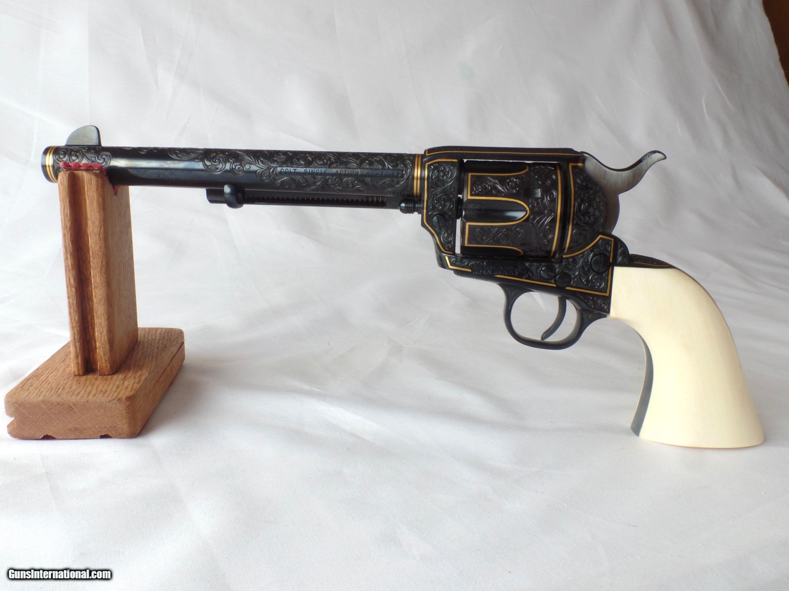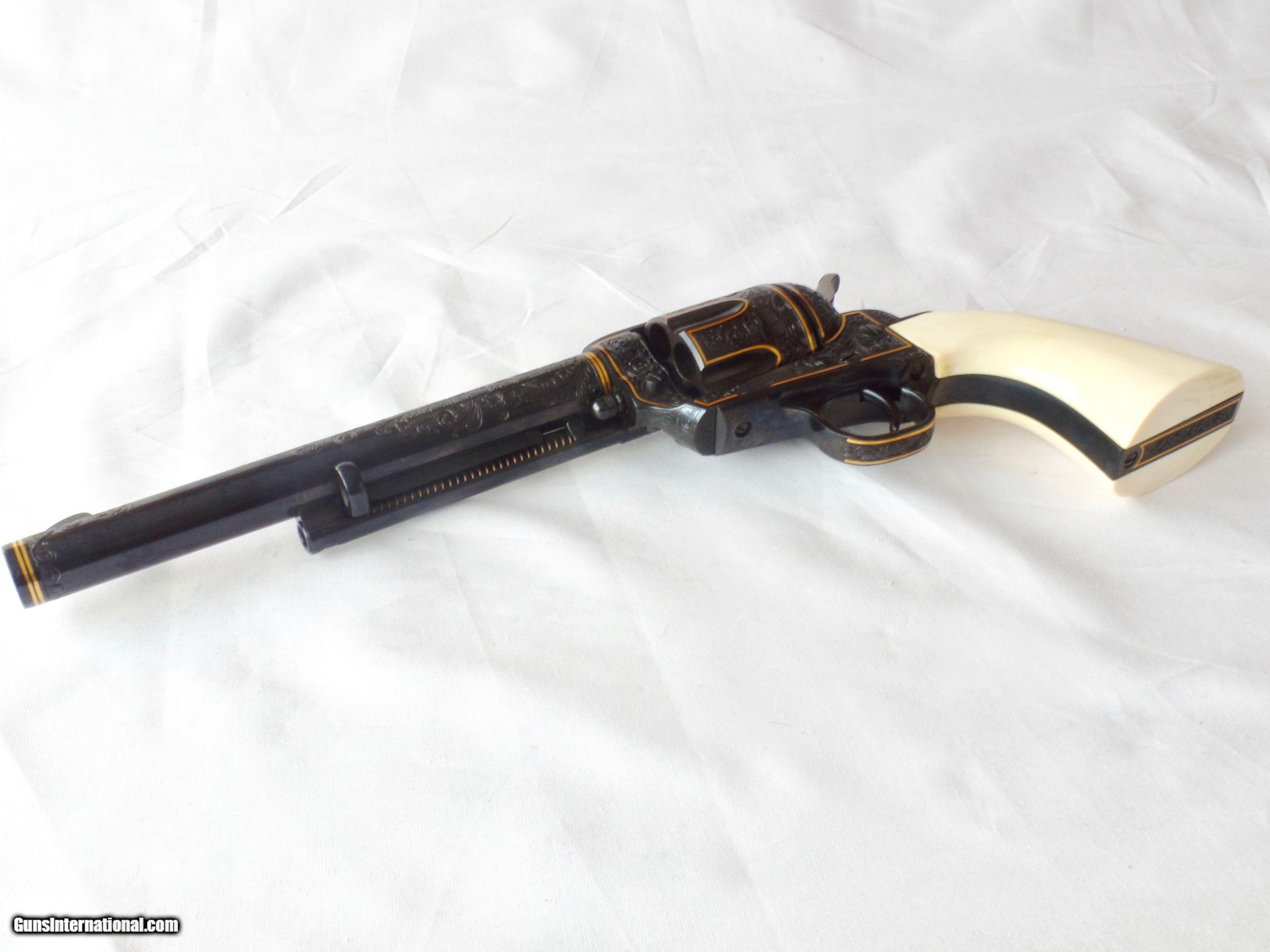 Description: Fully Engraved Colt 2nd. Gen. SAA with gold inlays. Serial #55378SA makes this a 1970 Colt. 7 1/2" barrel chambered for .45 L.C. One peice ivory grips. Almost full coverage with deeply chiselled scroll engraving accented with gold wire inlays. Master engraver signed by Hans A. Pfeiffer. It has 2 gold bands at either end of barrel, gold borders on front of cylinder as well as the flutes. Gold inlaid borders on the frame, grip straps and trigger guard. Expertly embellished with a nice deep Colt type blue. Action is tight and bore is shiny. Unfired and no drag lines. Matching numbers. A nice 2nd. gen. Colt for the serious collector . *****SOLD***** SOLD Curio/Relic: Yes Manufacturer: Colt Model: SAA Serial Number: 55378SA Caliber Info: .45 Condition: Excellent Manufacture Date: 1957 Engraving: full cov. |