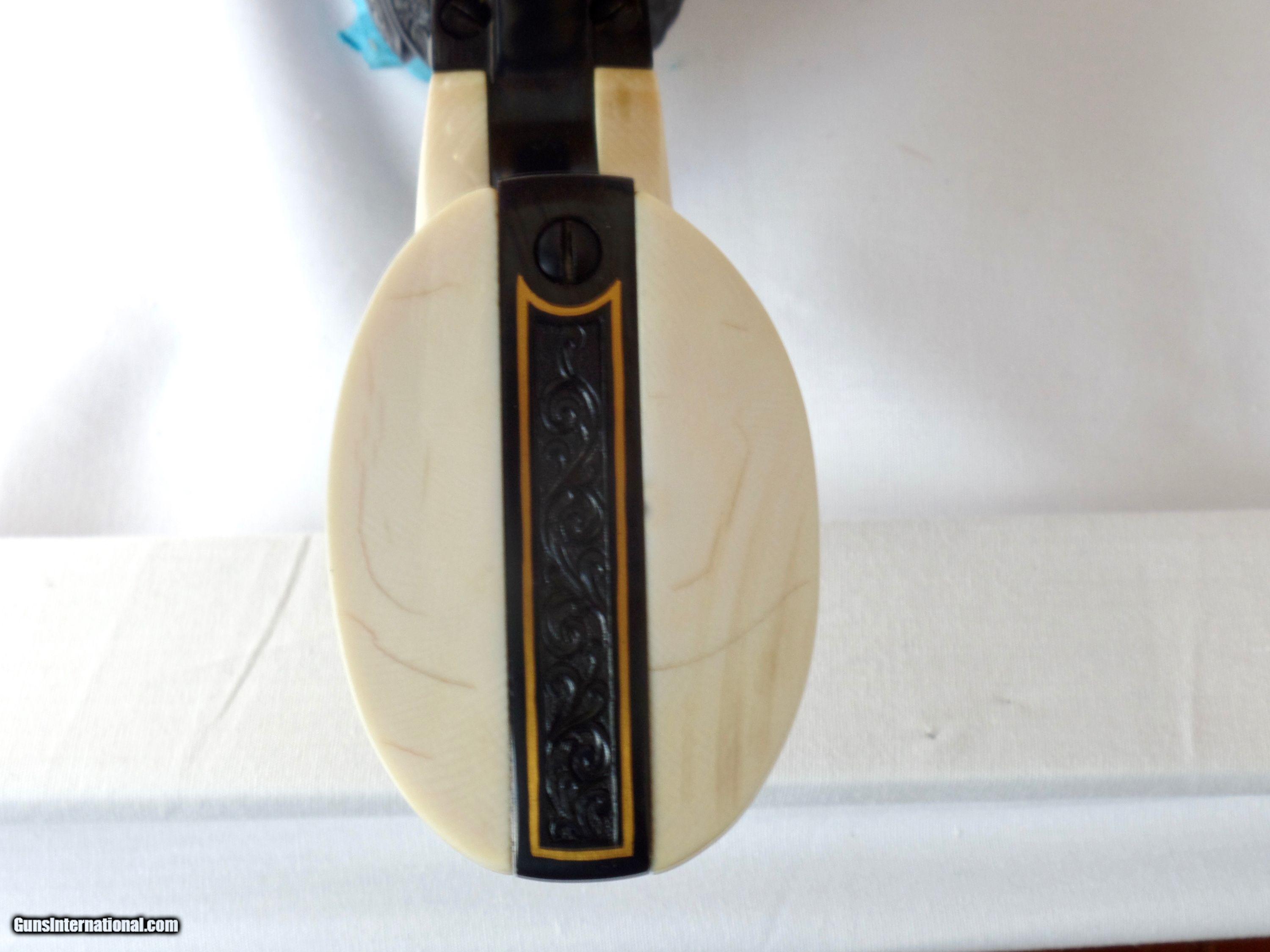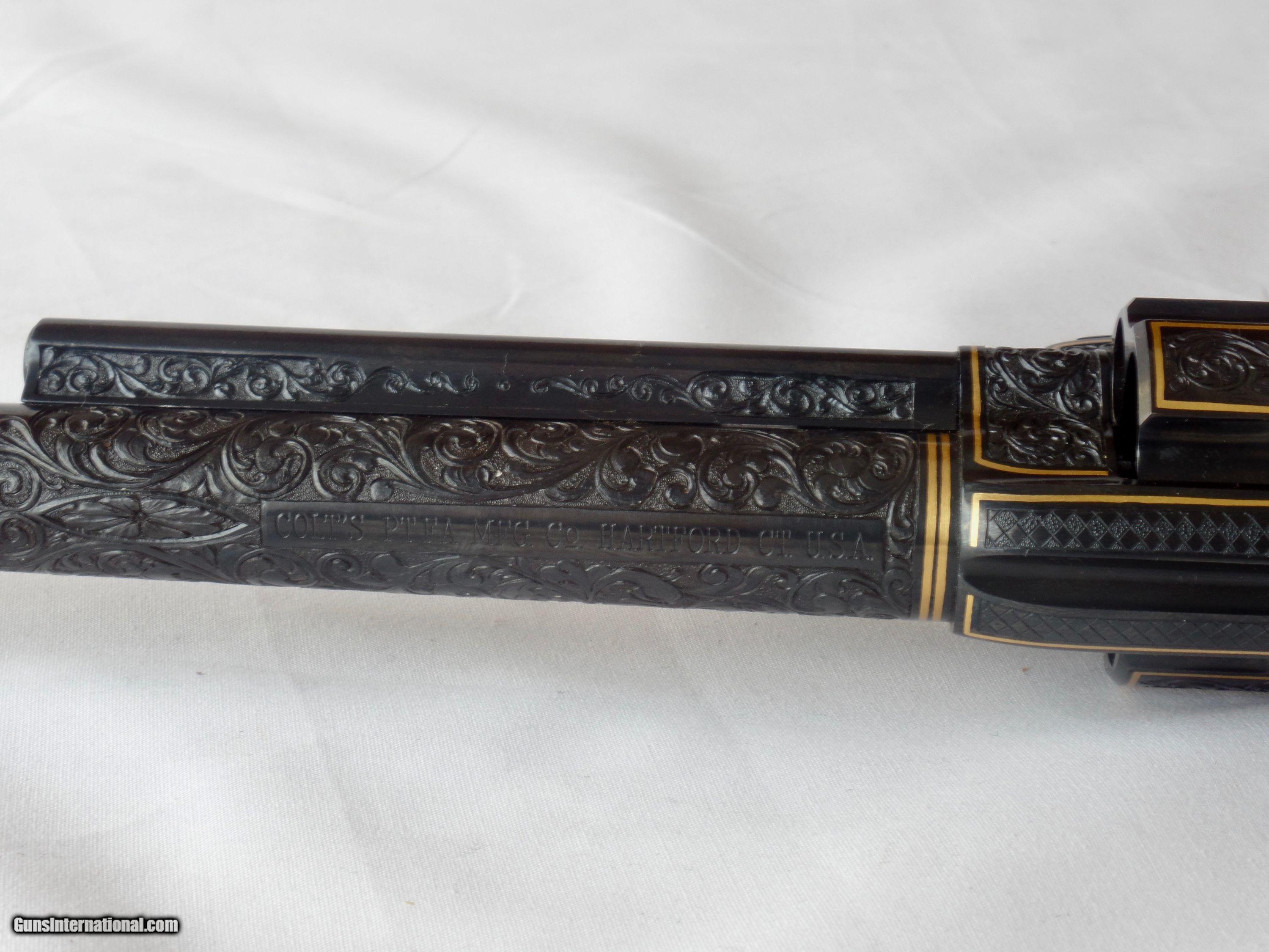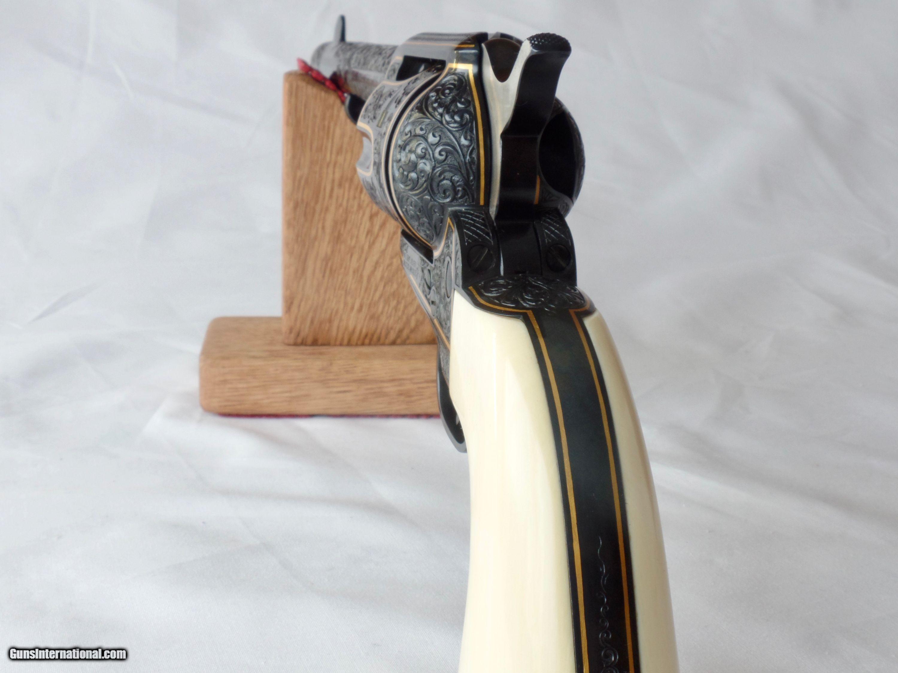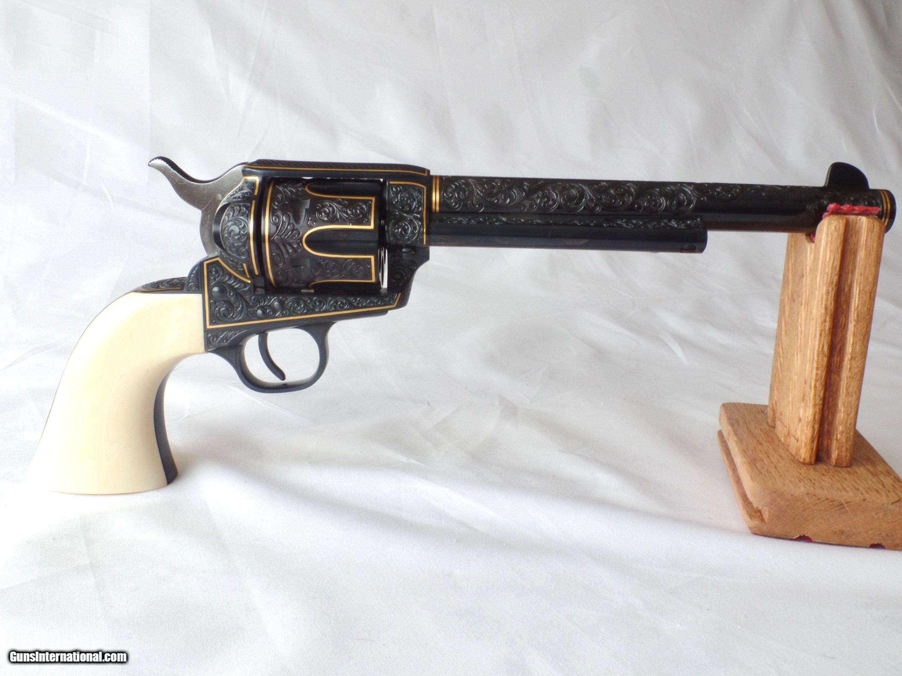 Description: Fully Engraved Colt 2nd. Gen. SAA with gold inlays. Serial #55378SA makes this a 1970 Colt. 7 1/2" barrel chambered for .45 L.C. One peice ivory grips. Almost full coverage with deeply chiselled scroll engraving accented with gold wire inlays. Master engraver signed by Hans A. Pfeiffer. It has 2 gold bands at either end of barrel, gold borders on front of cylinder as well as the flutes. Gold inlaid borders on the frame, grip straps and trigger guard. Expertly embellished with a nice deep Colt type blue. Action is tight and bore is shiny. Unfired and no drag lines. Matching numbers. A nice 2nd. gen. Colt for the serious collector . *****SOLD***** SOLD Curio/Relic: Yes Manufacturer: Colt Model: SAA Serial Number: 55378SA Caliber Info: .45 Condition: Excellent Manufacture Date: 1957 Engraving: full cov. |