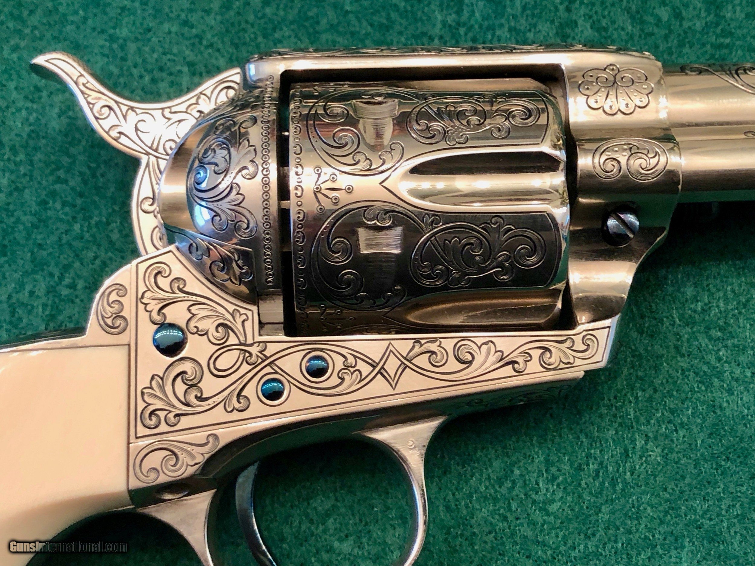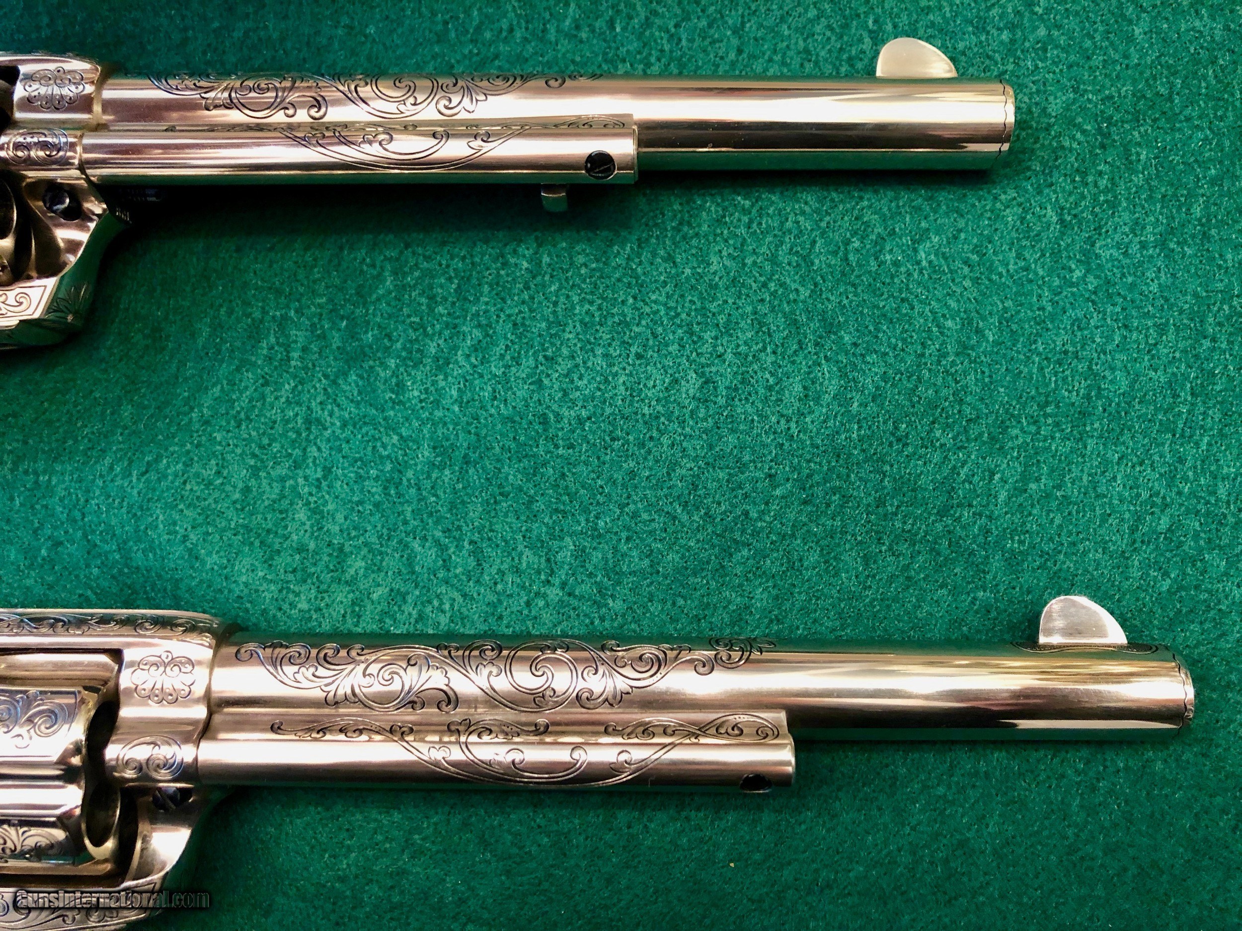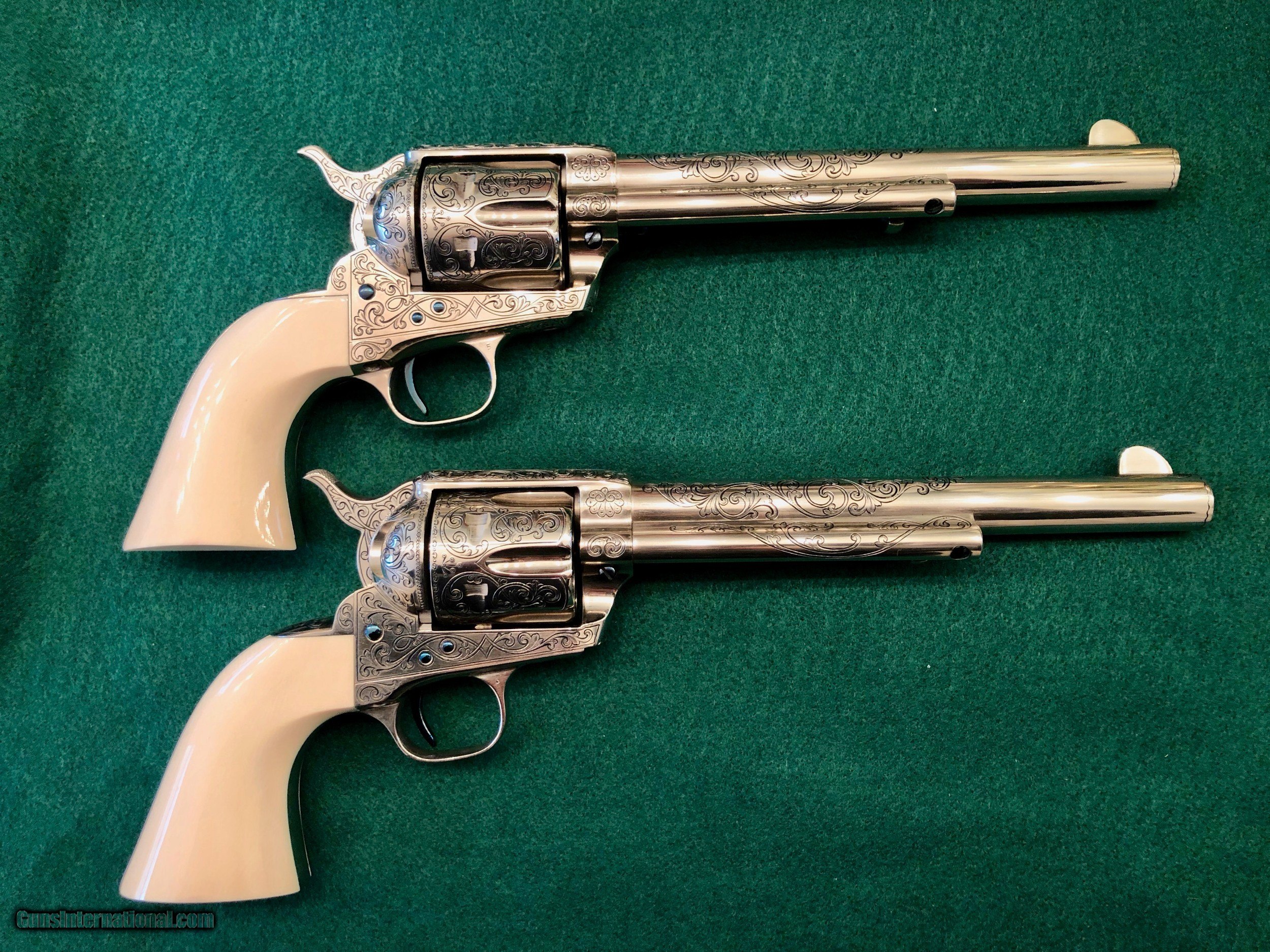 Description: This consecutively numbered pair of Colt Single Action Army 45's are Anniversary Models, 2nd Generation guns manufactured in 1961 that have been engraved in the late vine scroll pattern by Colt Master Engraver, Ben Lane, circa 1990. They have been beautifully fitted with one piece ivory grips and are nickel plated with fire blue screws. They are unfired and unturned and come in a Colt French fitted mahogany case with bullet block. This is a beautiful pair of engraved Peacemakers by one of the most respected and acclaimed contemporary artists in the field. • Please Contact Borderview International for Shipping and Handling as thier information is located in my listing. PRICE WAS REDUCED - TUES APRIL 21, 2020. FROM $ 8,495.00 USD. - TO $ 8,095.00 - USD FIRM PRICE. SOLD Curio/Relic: Yes |