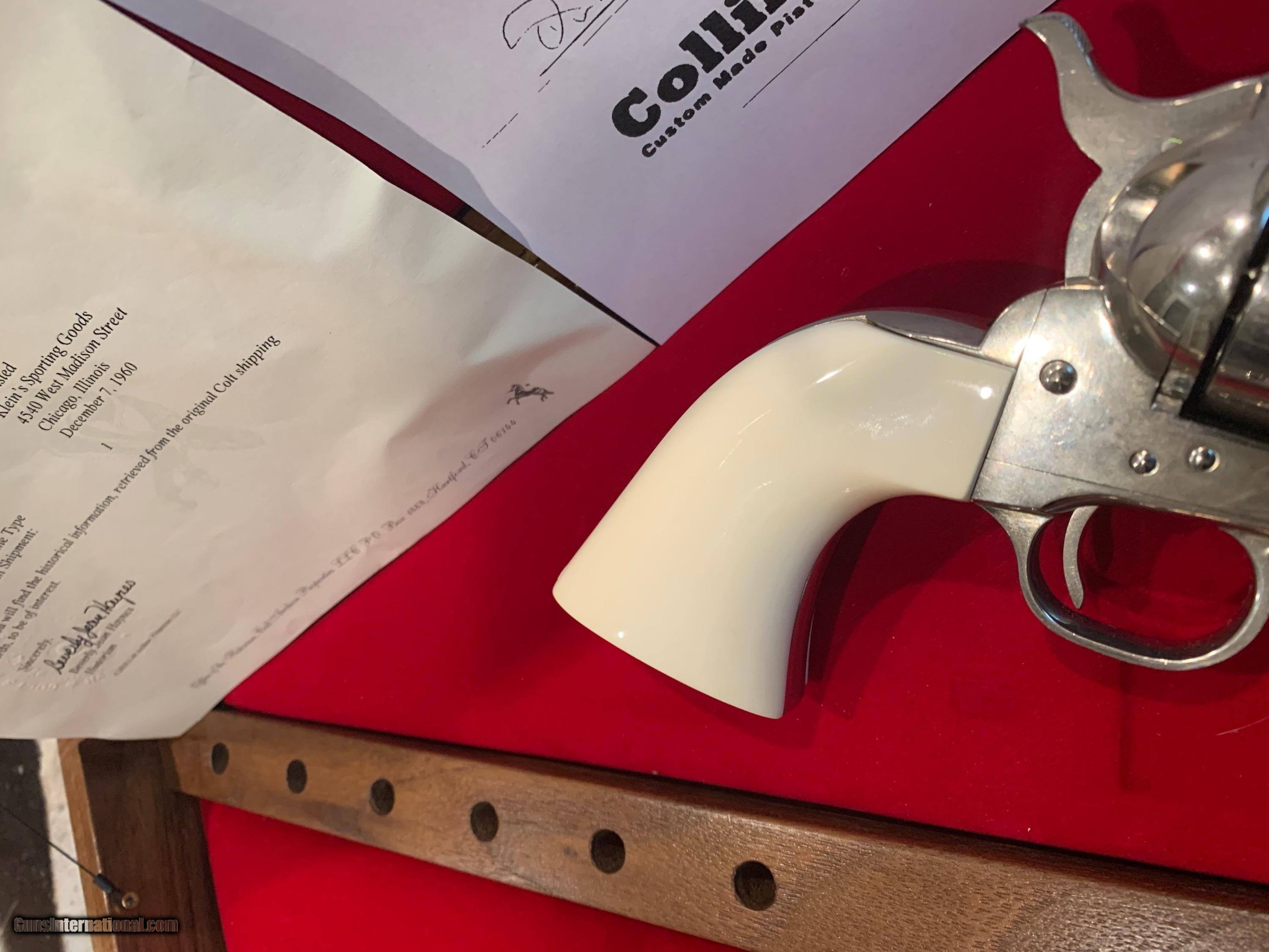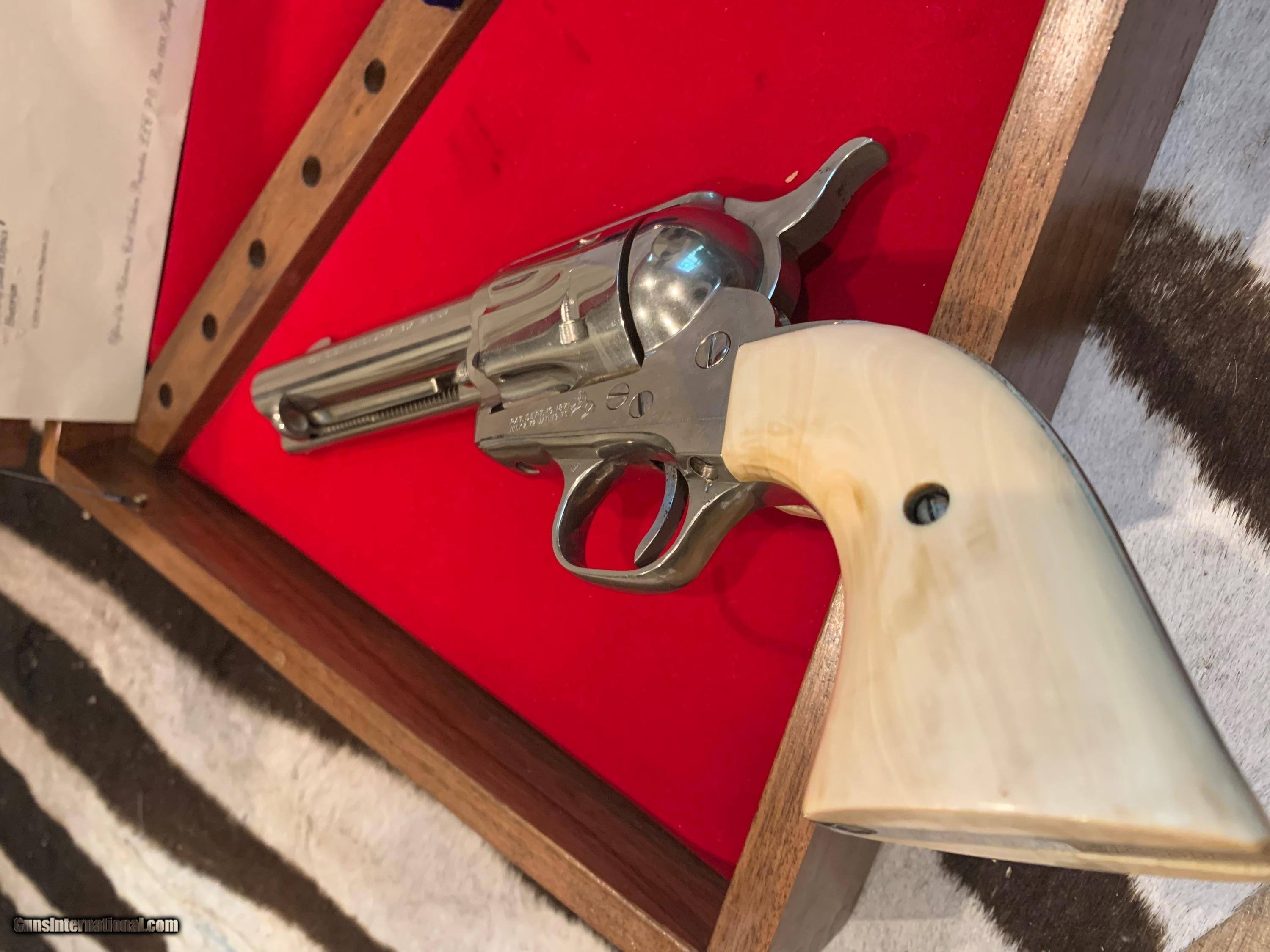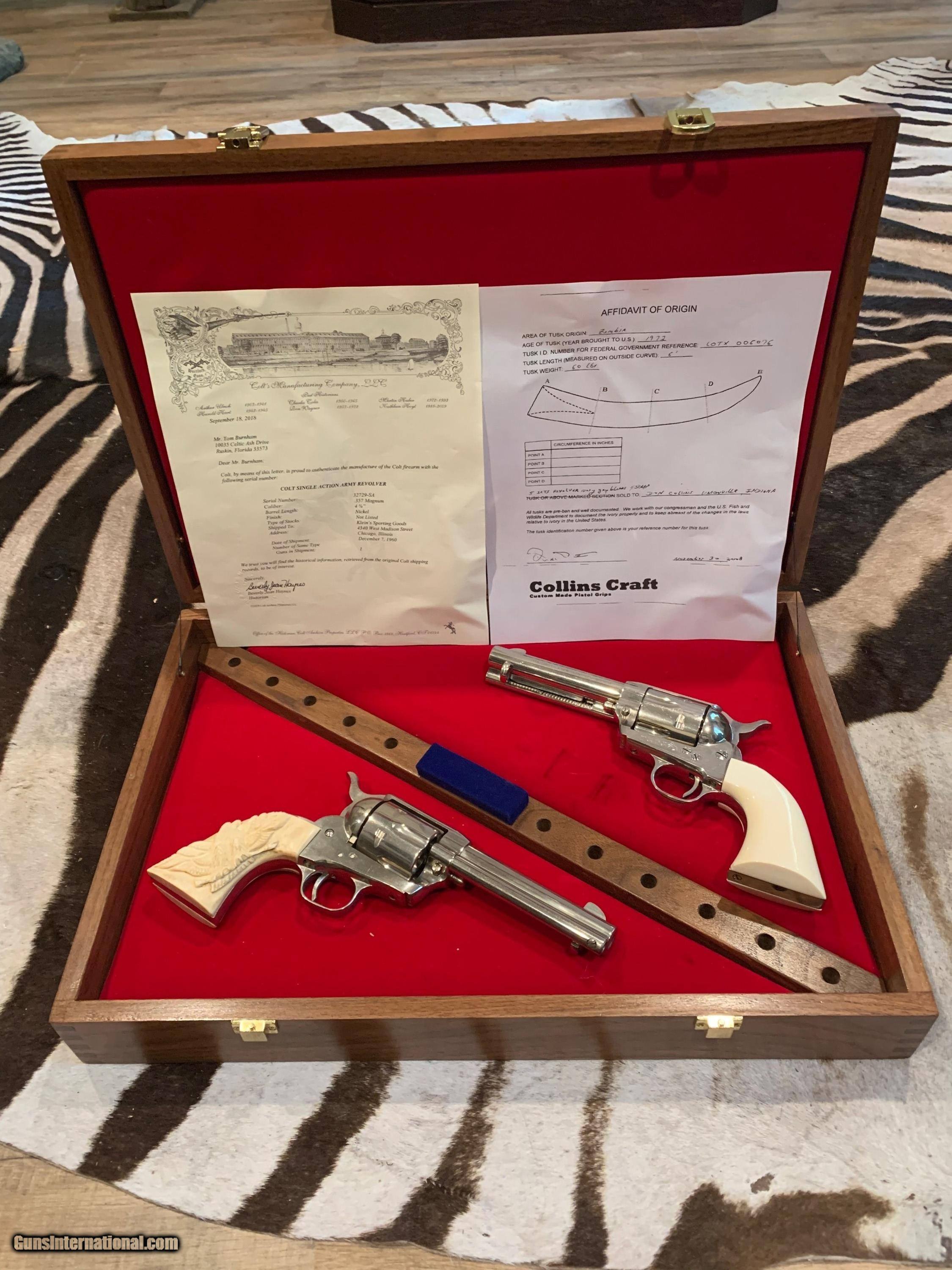 Description: 1960 SAA in 357 Mag with factory carved grips (so marked on the inside) 4-3/4" barrel in 99% condition with only minor handling marks (unfired ?) with factory letter. 1965 SAA nickel 357 mag 4-3/4" barrel with genuine Ivory grips (with certificate of importation) 100% condition unfired. Cased in custom rosewood presentation case We will consider selling separately. SOLD SOLD Manufacturer: Colt Model: SAA Barrel Length: 4-3/4” Case: Yes Item Location: N Carolina |