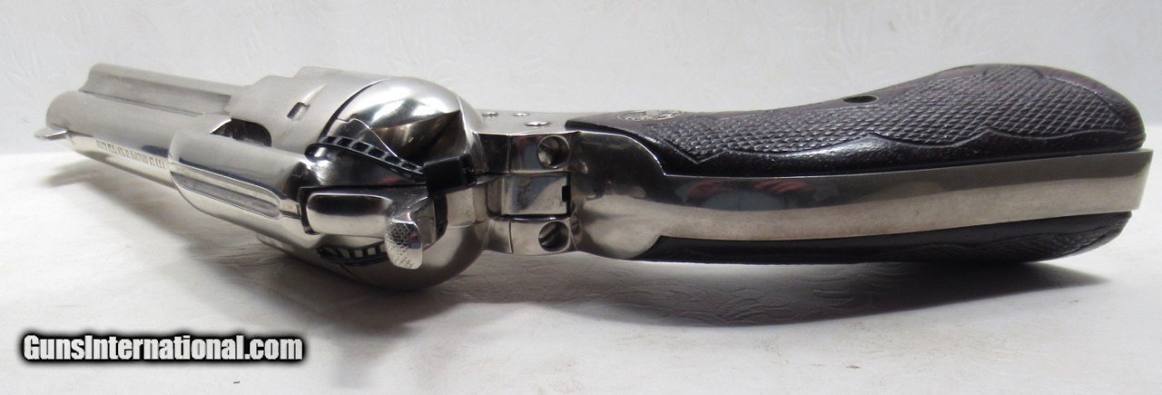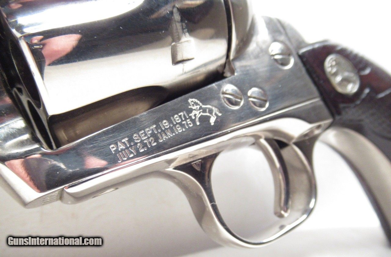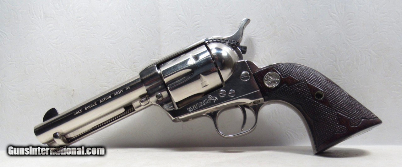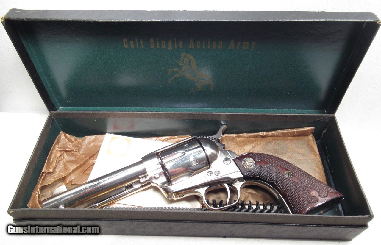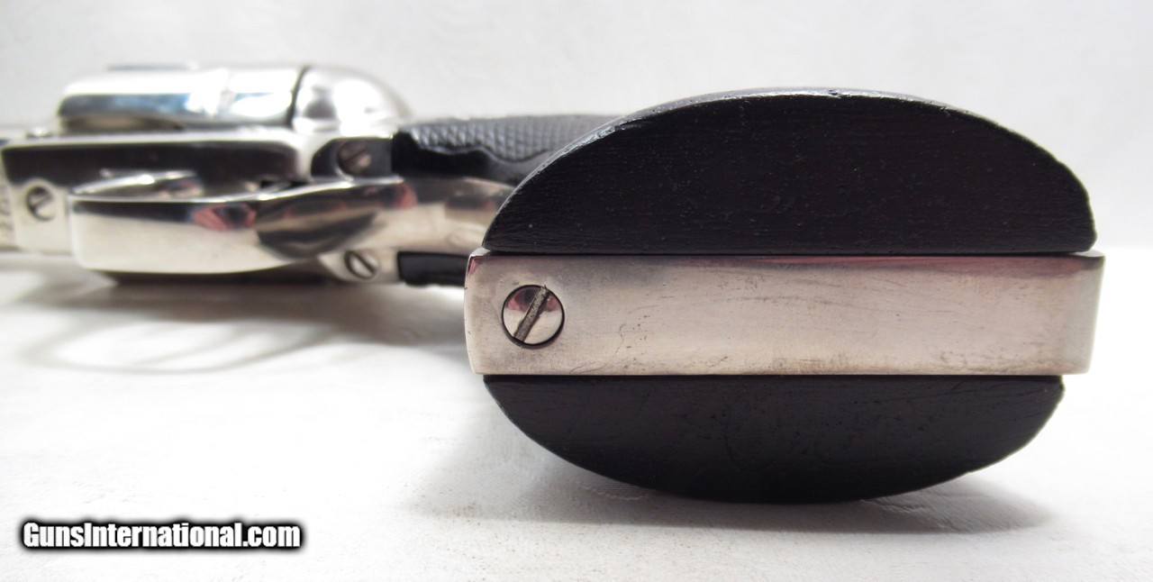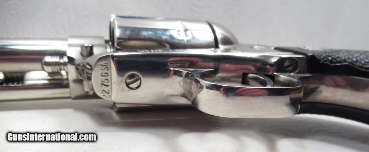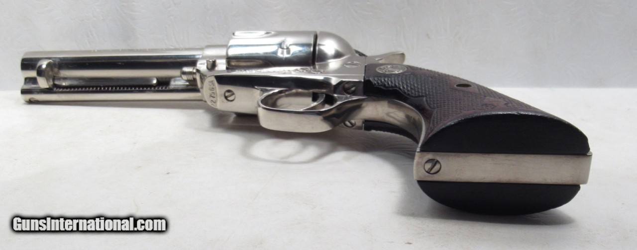 Description: Colt Single Action Army Revolver; Rare Second Generation Nickel; Serial No. 22756; Made 1958; .45 Caliber; 4 ¾” Barrel; Factory Nickel Finish in Black Box with All Papers and Tools; Gun Appears to be New; Great Non-Original Fleur-de-lis Medallion Grips; Very Hard to Find Limited Produced 2nd Gen Colt 45 Revolver; See All Photos for Condition; No Texts; Call (254)541-5765 or Email Only; PERSONAL PROPERTY of Harold Wieser; NOTICE: We Do Not Do Any Consignments - All Items Listed are Owned by Us - NO SALES to New Jersey or New York City - Antiques Only to Massachusetts and California; Price: $8,975 + $45 S&H Via USPS PRIORITY MAIL; Payment Address: Harold Wieser - 1466 U.S. Hwy 77 - Rosebud, TX 76570; SEND PAYMENTS VIA USPS PRIORITY MAIL; BEWARE of SCAMS!!! – DO NOT SEND MONEY or CORRESPONDENTS ELECTRONICALLY UNLESS YOU HAVE SPOKEN to HAROLD WIESER FIRST! 254-541-5765 SOLD |
