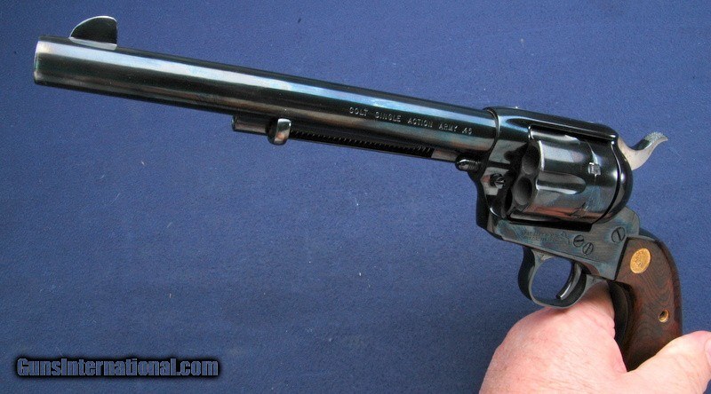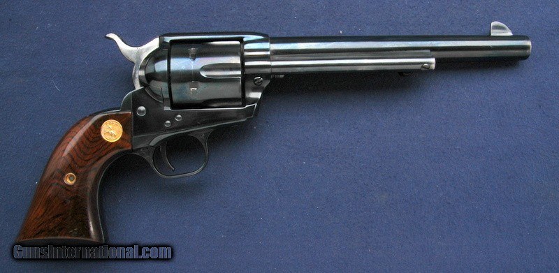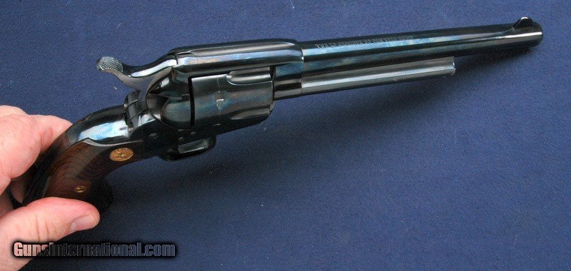 Description: This one is as you see it in the pictures. They accurately reflect color and condition. This one has been reblued, but really a pretty good job. There is some high edge wear at the muzzle and the ejector rod housing. You can see though under the reblue that a few of the screws have been touched with the wrong sized screwdriver. You know what I mean. Good looking hogleg, nice bright bore, tight lock up. $50 shipping to the lower 48, 3% surcharge for using a CC. If you choose to pay with a personal check, we will hold the item for up to 10 days to make sure that it clears. Please expedite such pymts as we will hold an item on your word for 5 days. SOLD Handgun Caliber: .45 Colt |