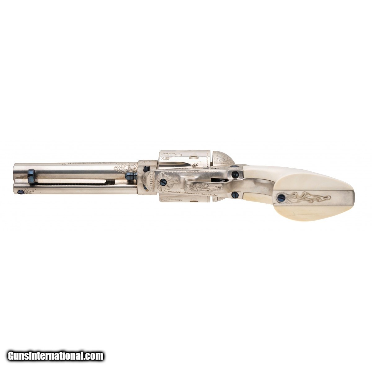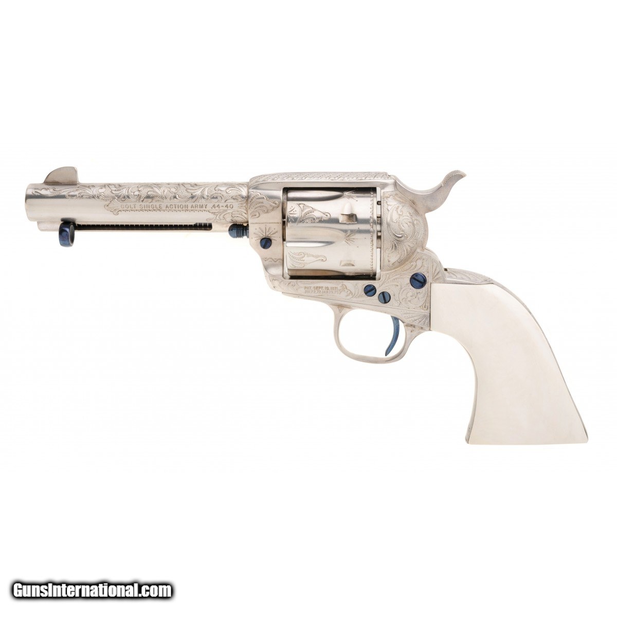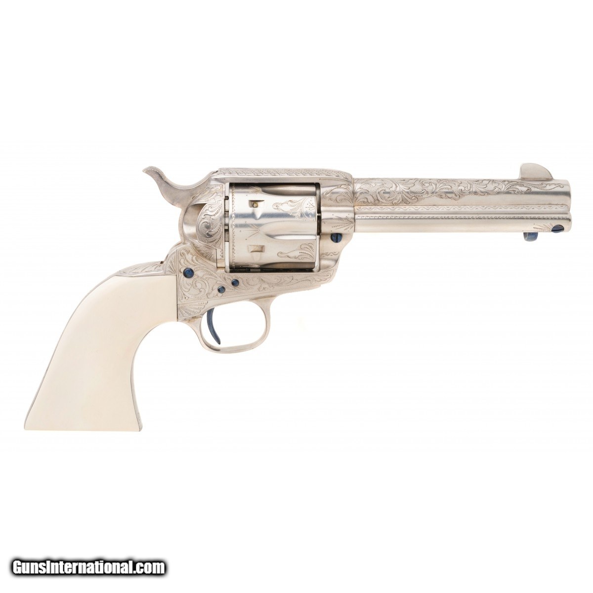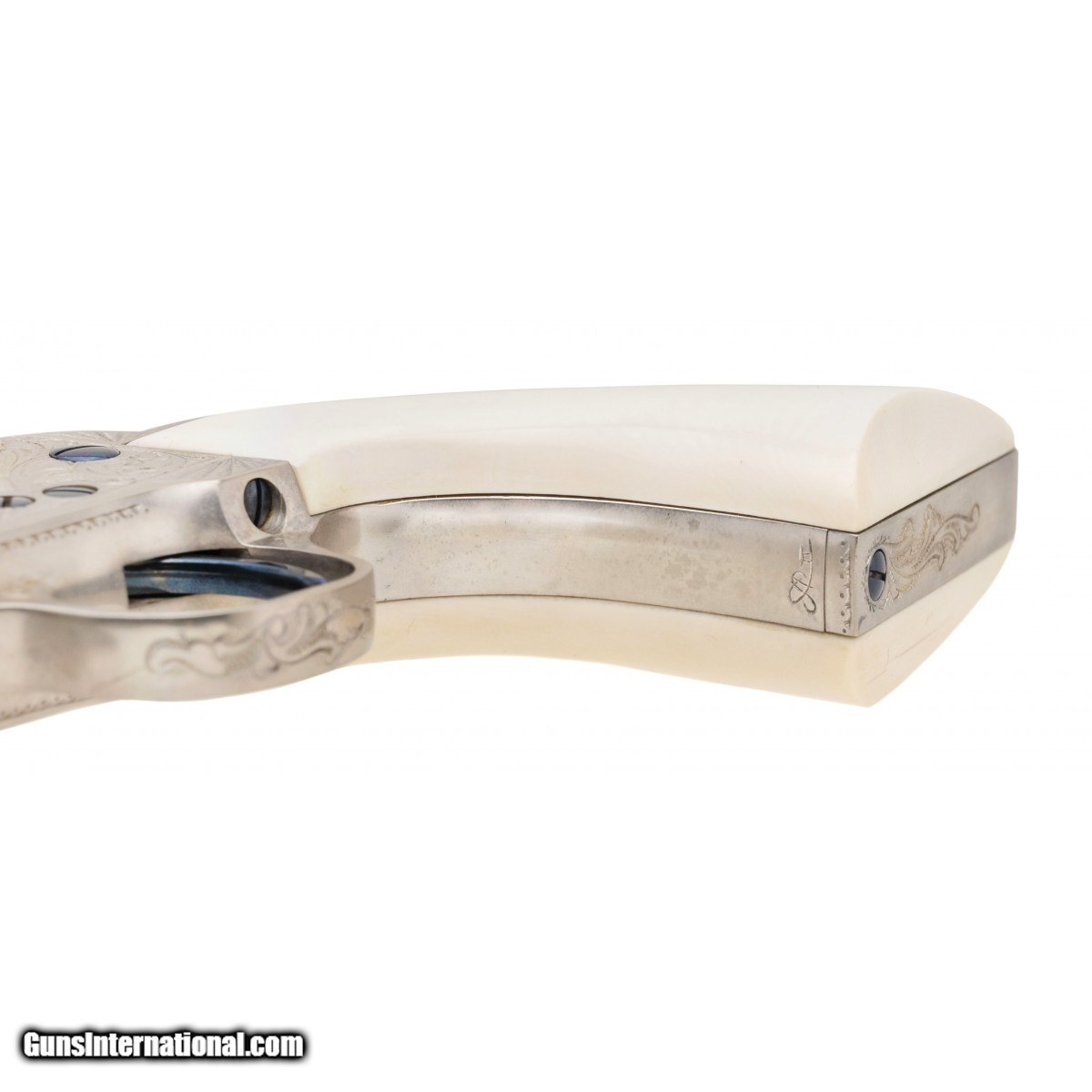 Description: " SN: S13392A. Made in 1996, .44-40 caliber with a 4.75"" barrel. A custom engraved single action with scroll engraving, silver plating and fire blued screws. The grips are one piece ivory. Comes in a wooden presentation case. A beautiful piece. SOLD |