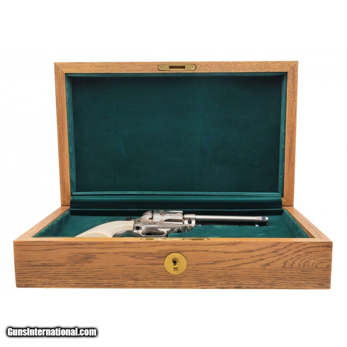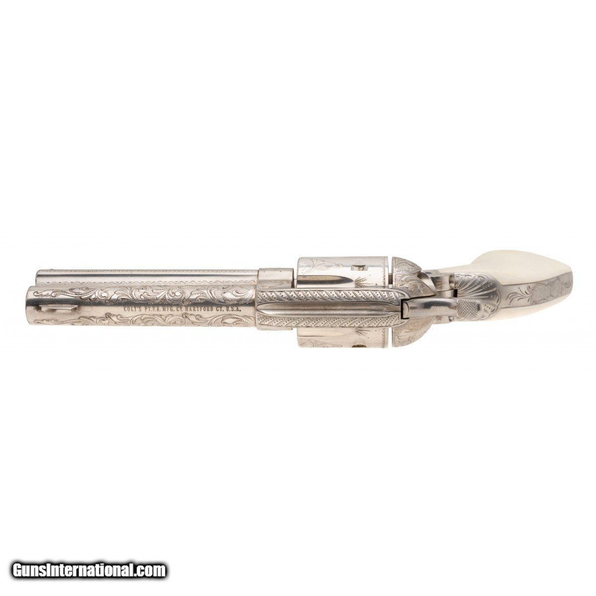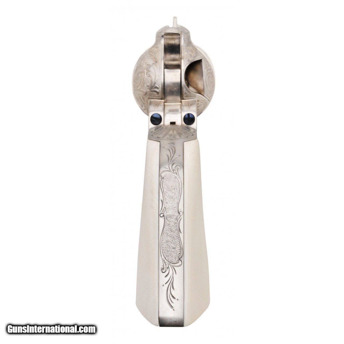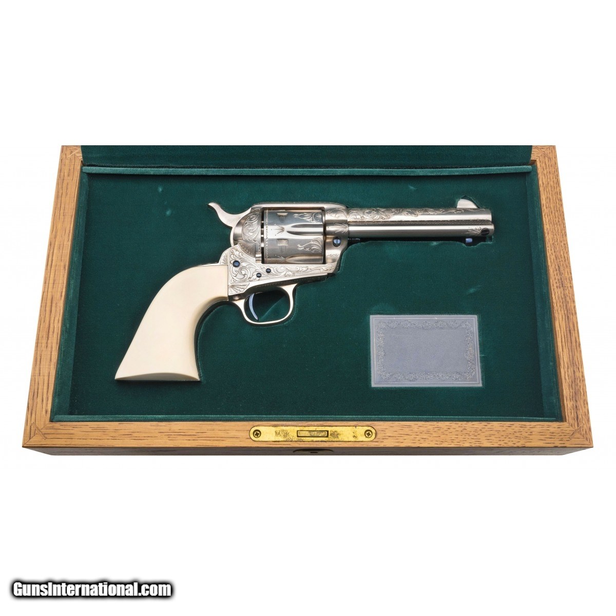 Description: " SN: S13392A. Made in 1996, .44-40 caliber with a 4.75"" barrel. A custom engraved single action with scroll engraving, silver plating and fire blued screws. The grips are one piece ivory. Comes in a wooden presentation case. A beautiful piece. SOLD |
