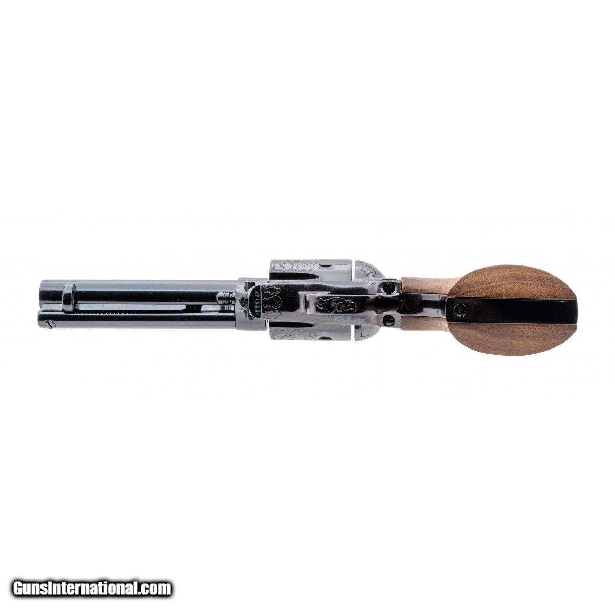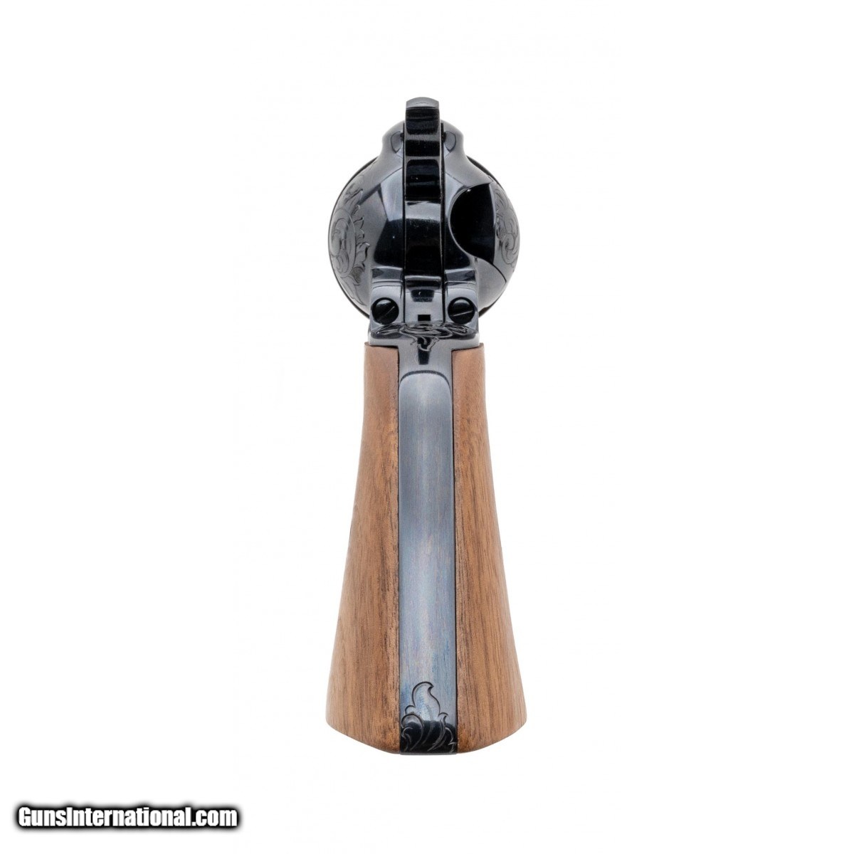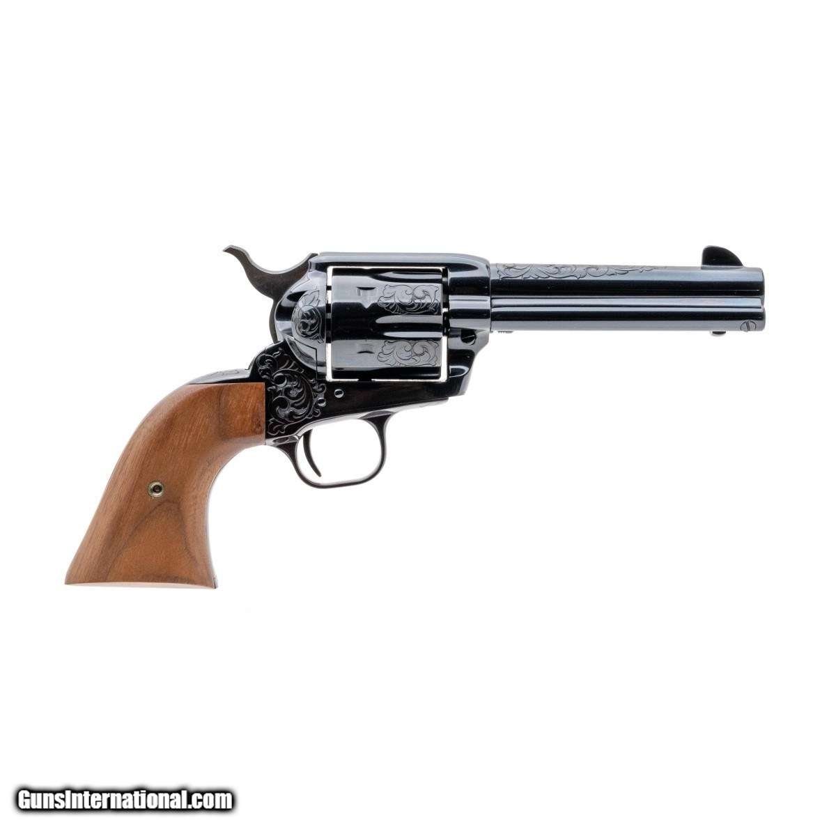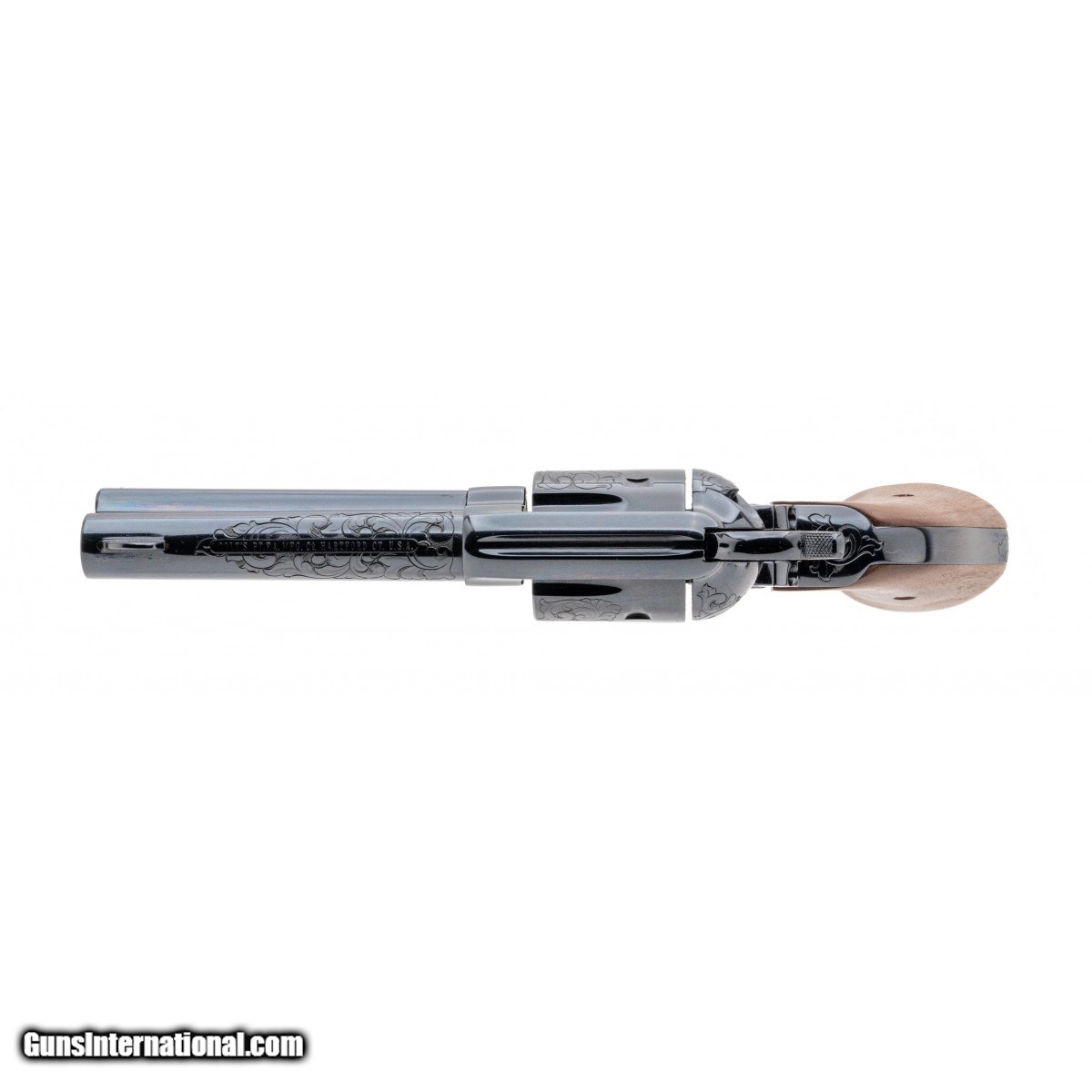 Description: " SN: SA94742. Made in 1991, 45 ACP caliber with a 4.75"" barrel. Factory ""A"" engraved Single Action with Royal Blue finish and walnut grips, in scarce .45 ACP caliber. Excellent condition with wooden presentation case. SOLD |