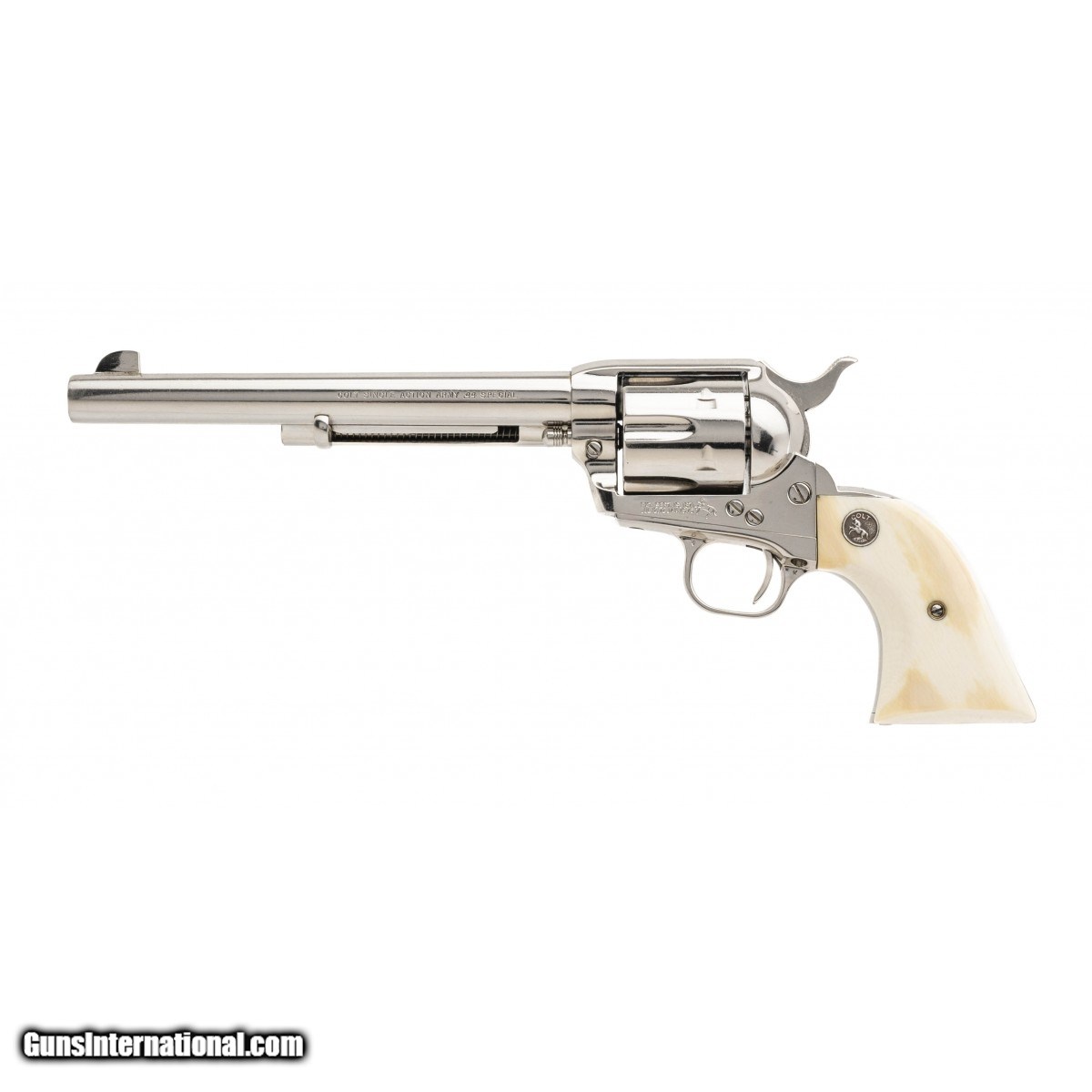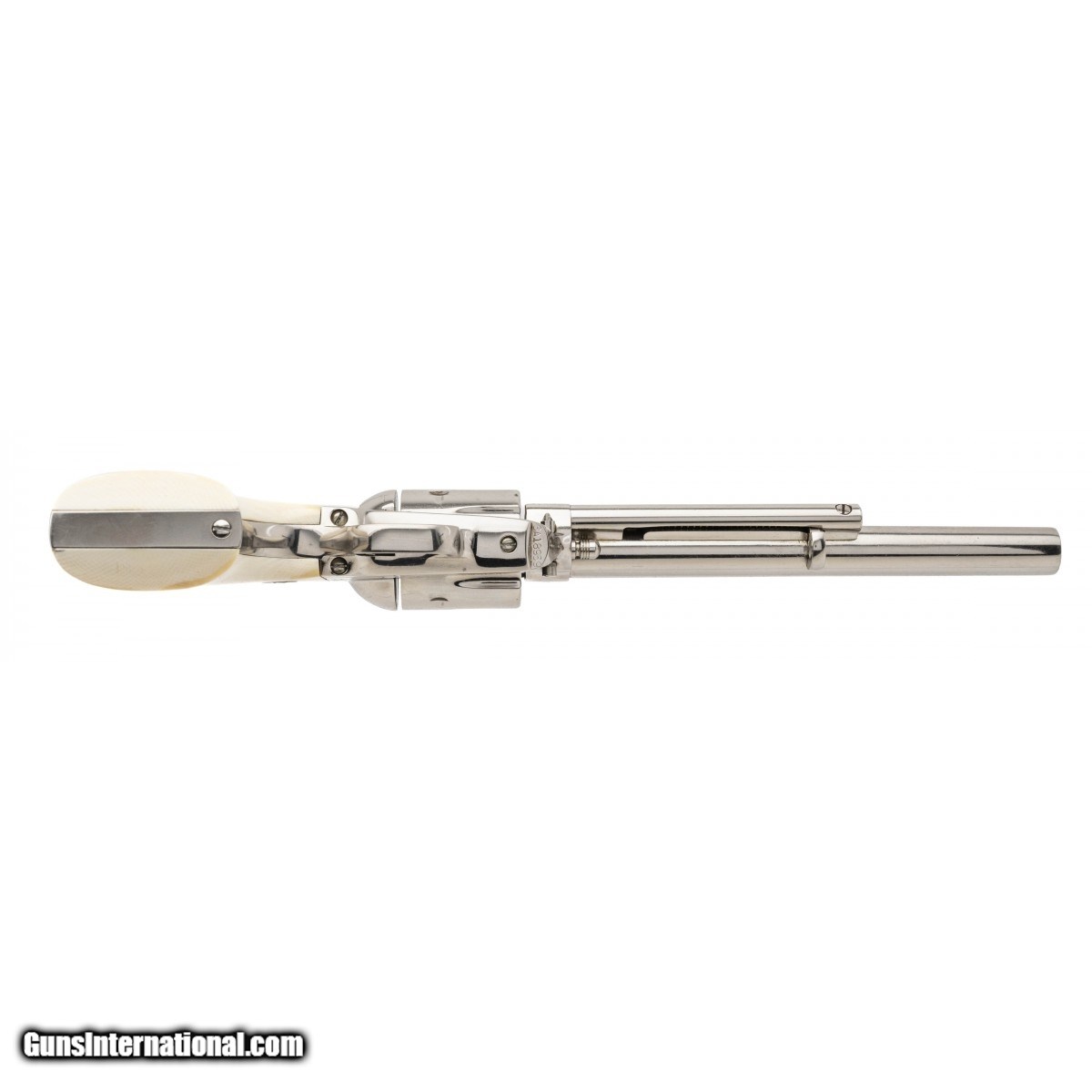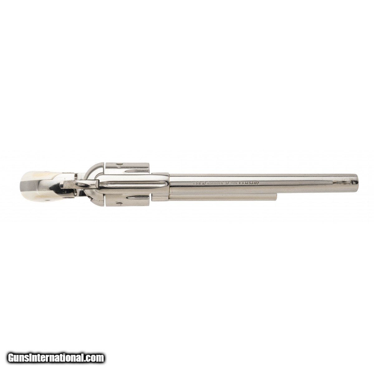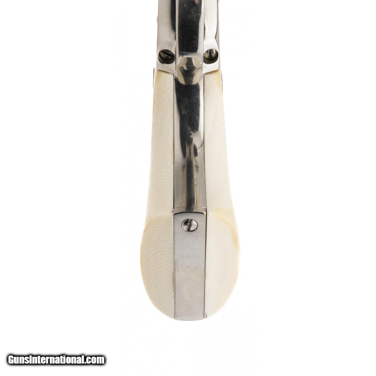 Description: "SN: SA18959. Made in 1979, .44 Special with a 7.5"" barrel. 3rd Gen Single Action with nickel finish, medallion ivory grips and an extra .44-40 cylinder. A beautiful set, with a slick action. Excellent condition with box. SOLD |