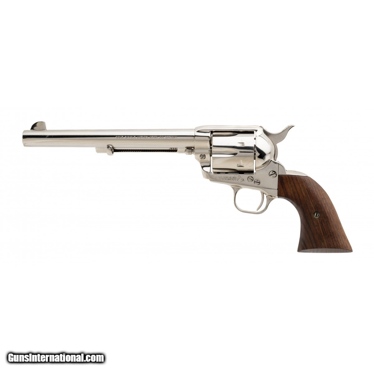 Description: " SN: SA31979. Circa 1980. Nickel plated single action revolver chambered in scarce .44 Special with a 7.5"" barrel and wood grips, bore is excellent. Overall excellent condition. Comes with factory box and paperwork. (Consignment) SOLD |