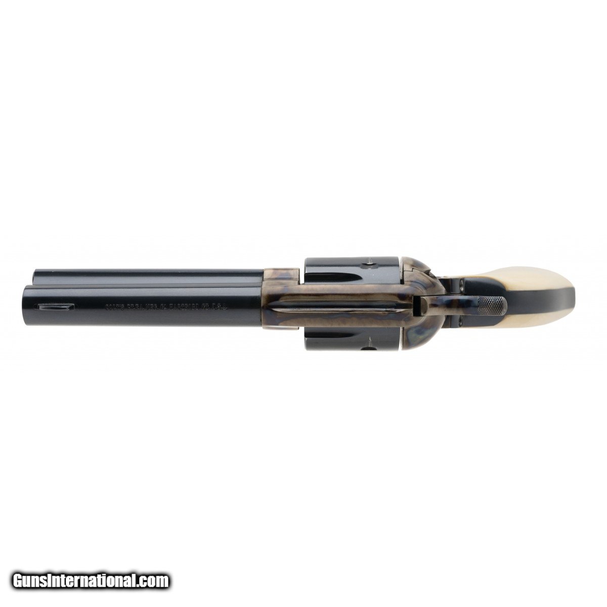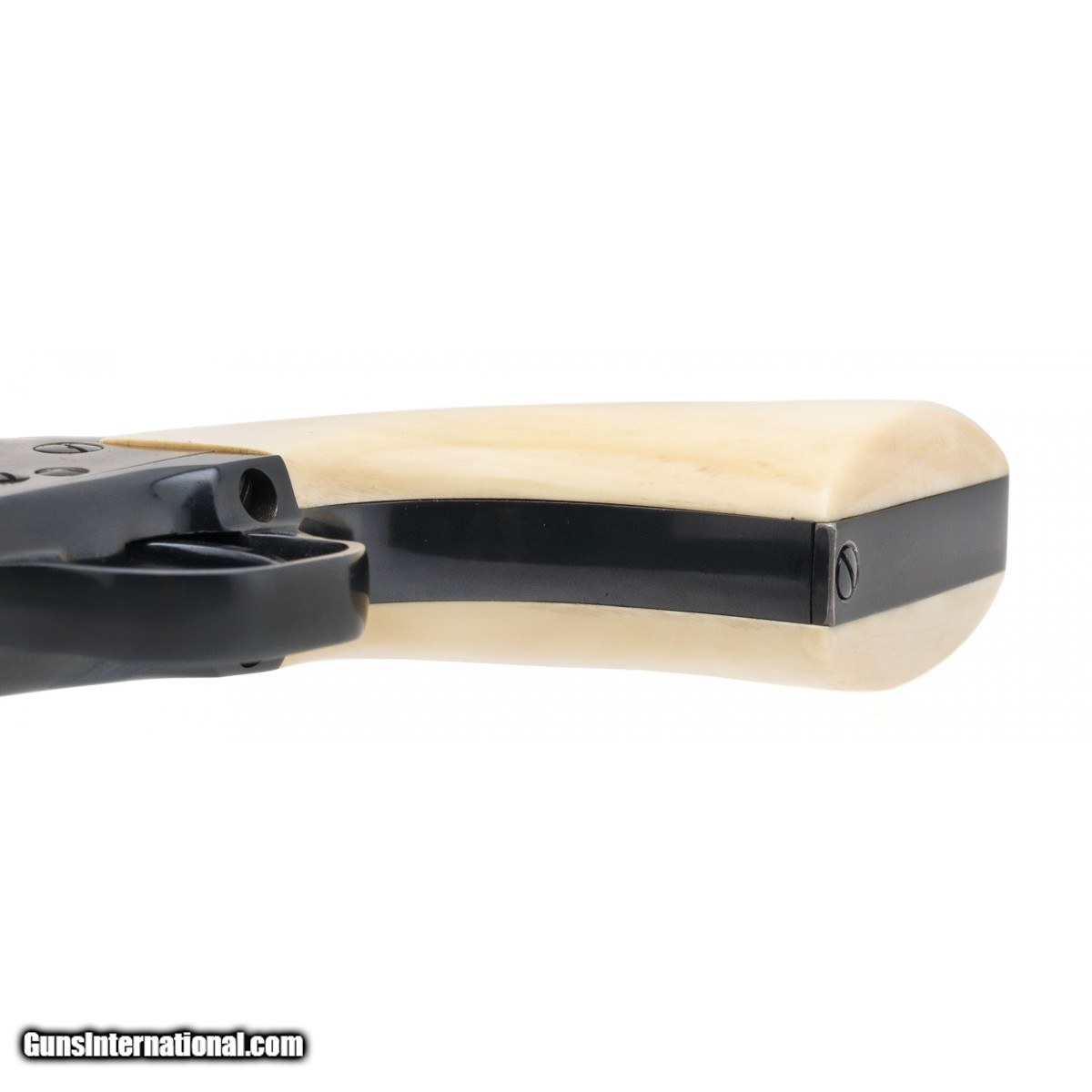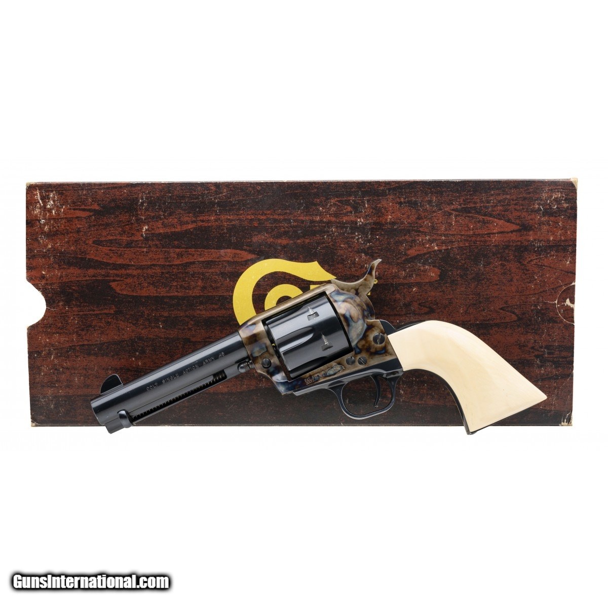 Description: " SN: 86254SA. Made in 1977, .45LC with a 4.75"" barrel. Custom 3rd Gen Single Action. Has gorgeous case colors by John Schultz at Frontier Classics, slick action job by Bob James and one piece ivory grips by Nutmeg Sports. An outstanding piece, in excellent condition. The box has no end label. (Consignment) SOLD |
