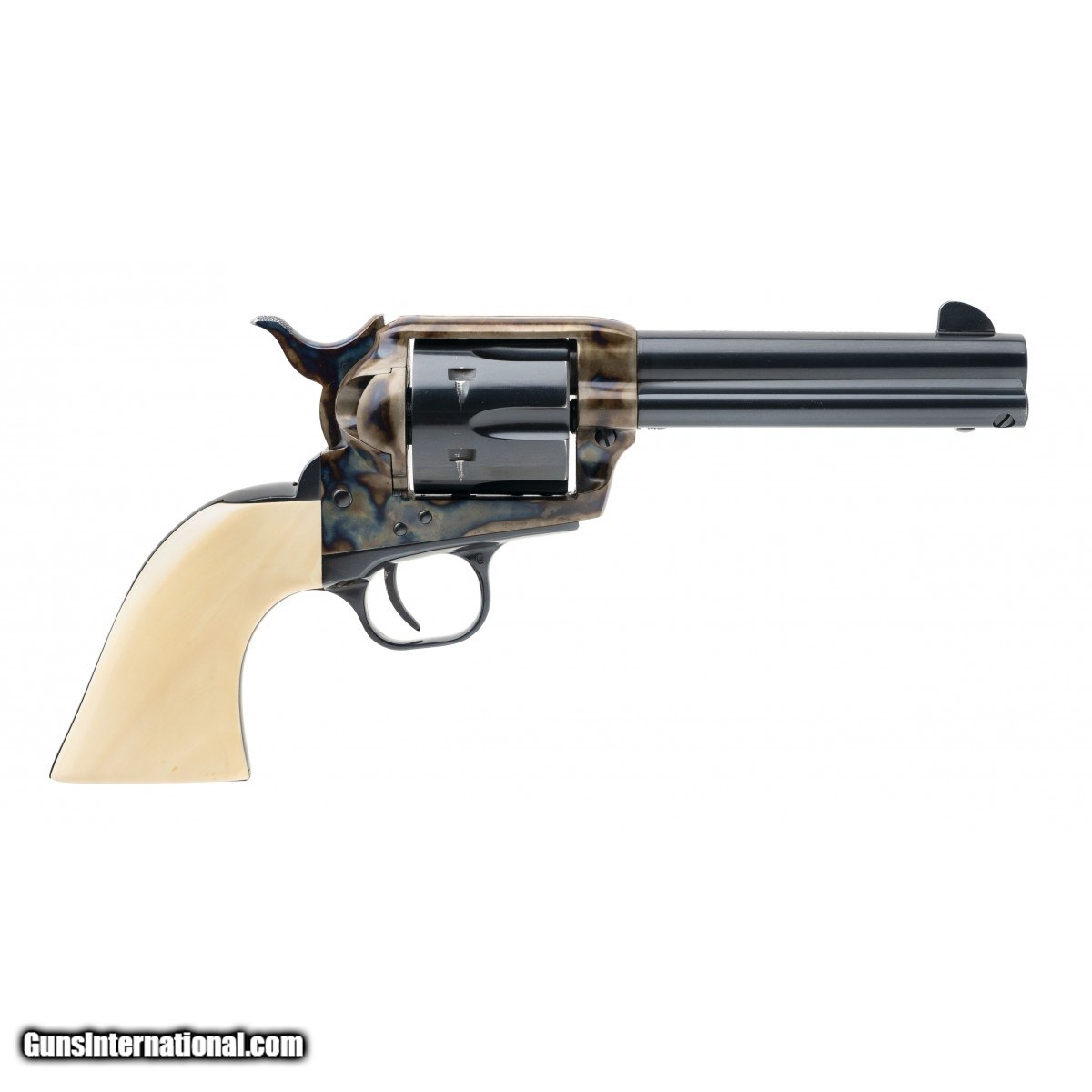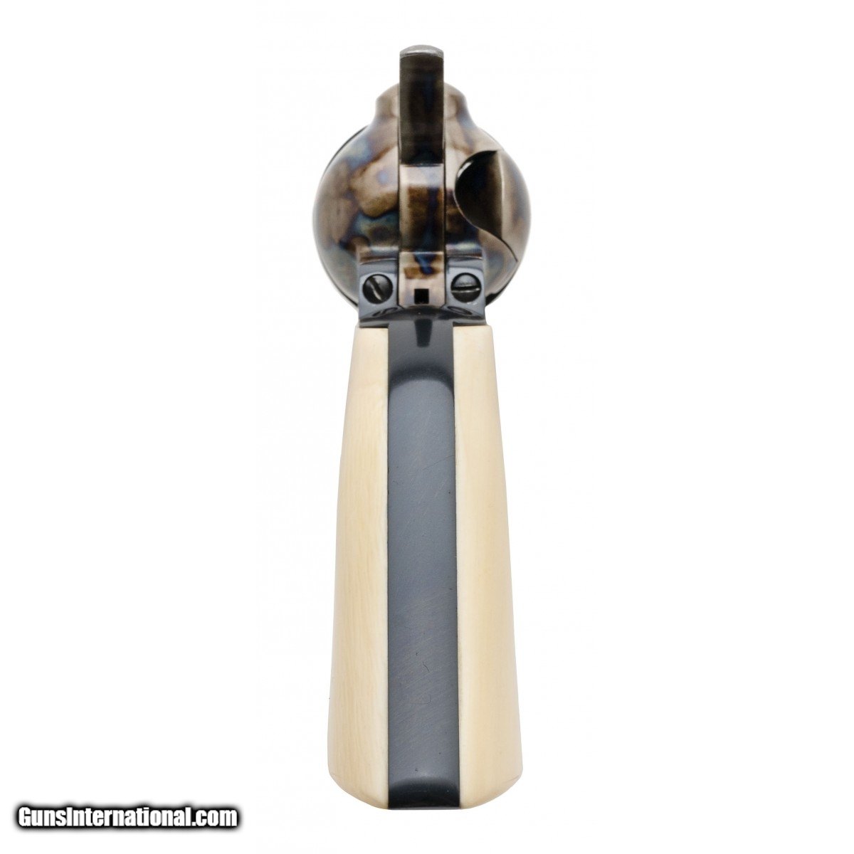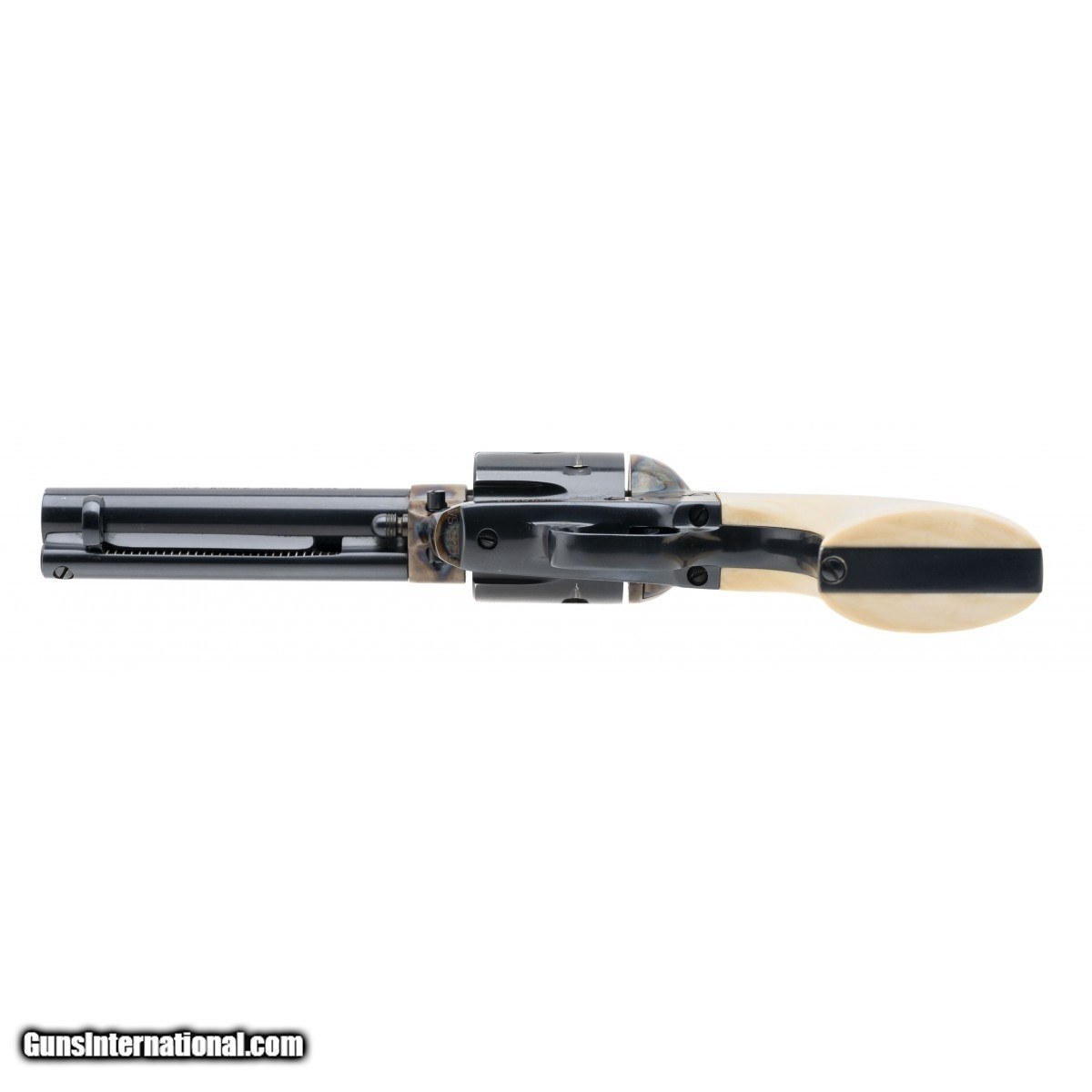 Description: " SN: 86254SA. Made in 1977, .45LC with a 4.75"" barrel. Custom 3rd Gen Single Action. Has gorgeous case colors by John Schultz at Frontier Classics, slick action job by Bob James and one piece ivory grips by Nutmeg Sports. An outstanding piece, in excellent condition. The box has no end label. (Consignment) SOLD |