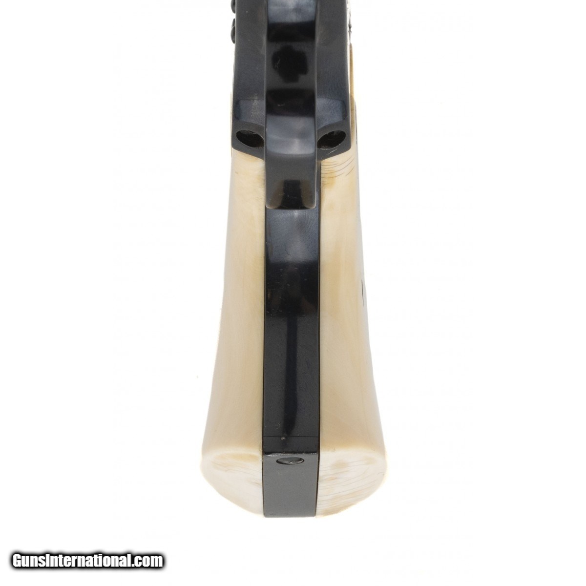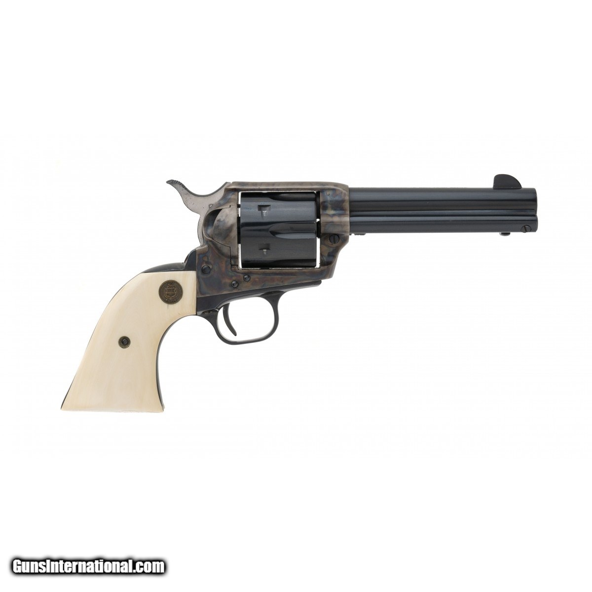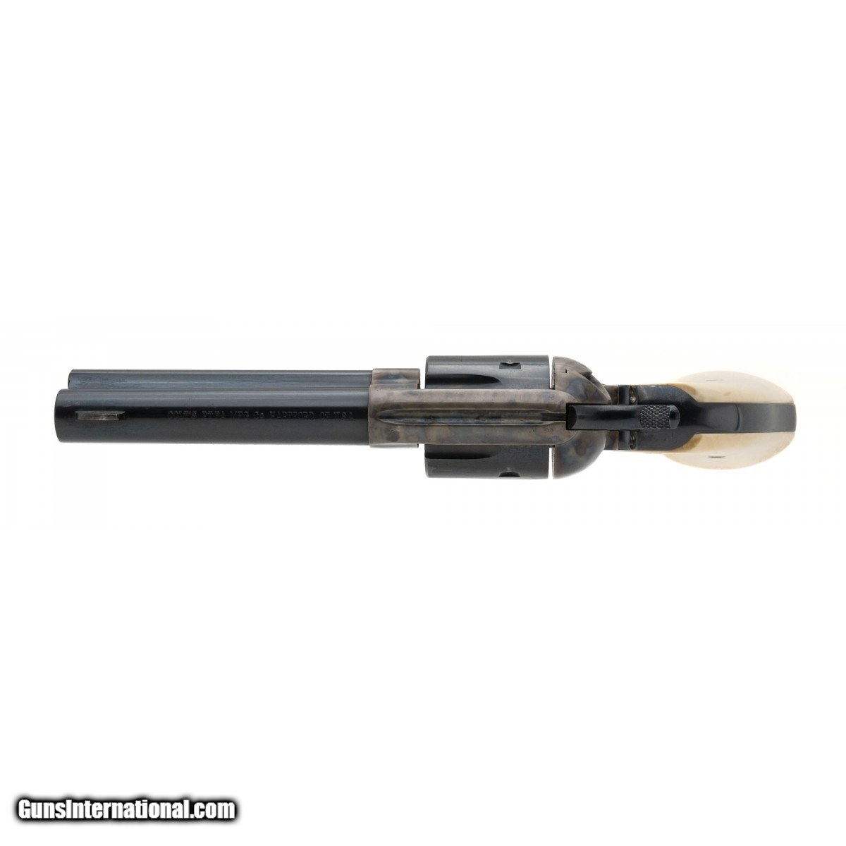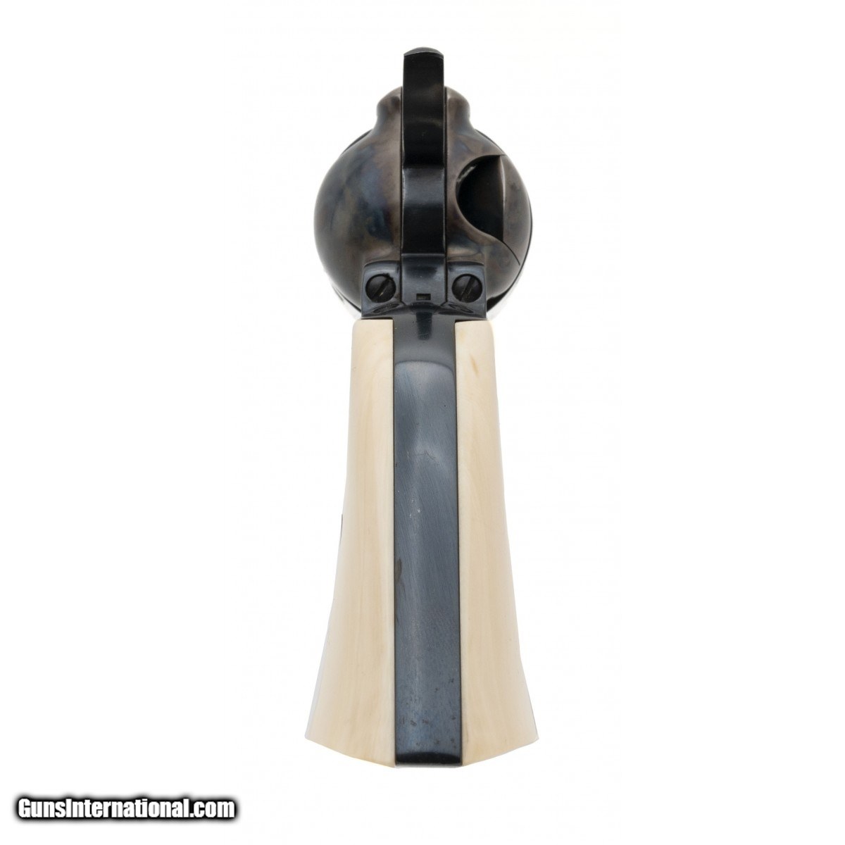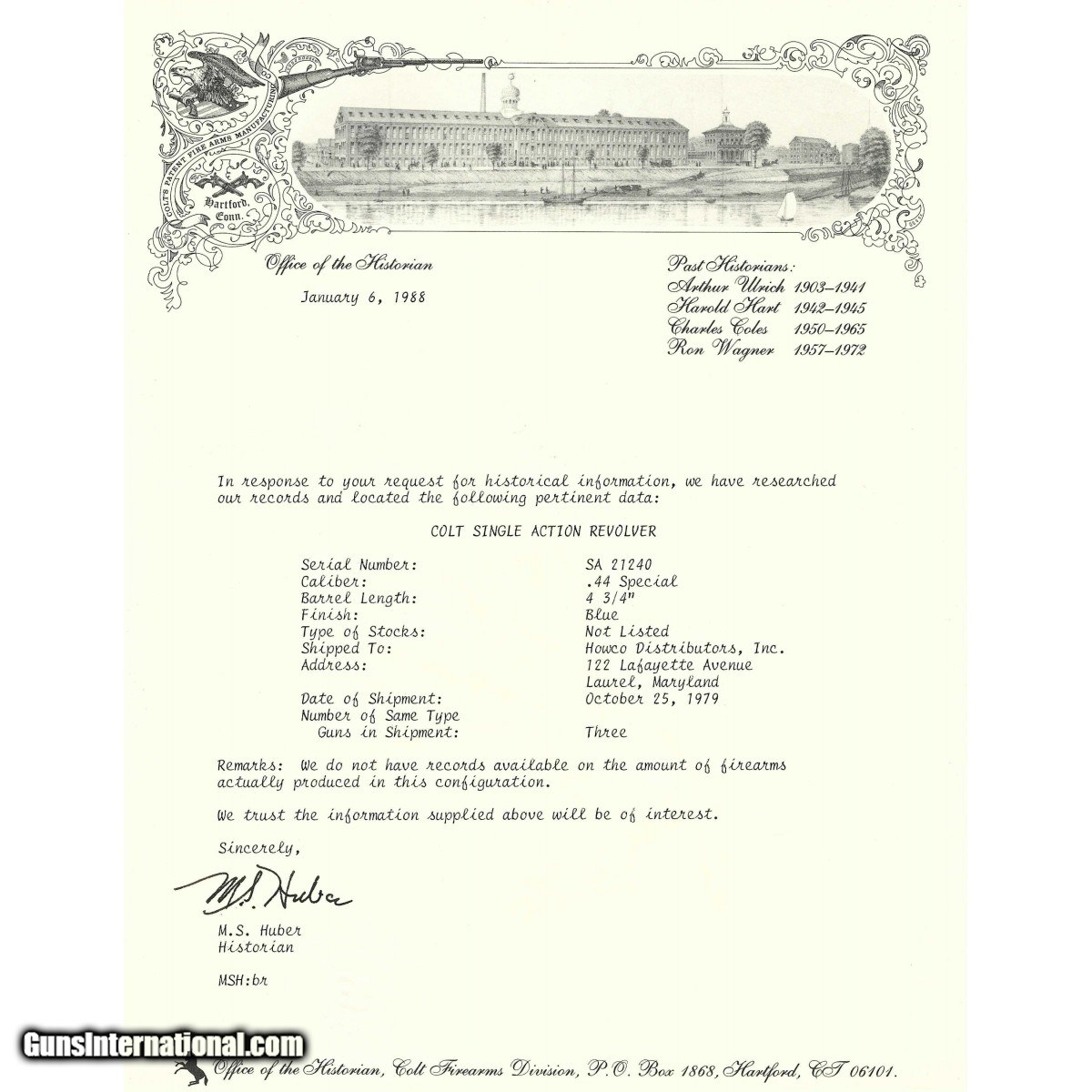 Third Generation blued Single Action Army revolver with 4.75"" barrel. This model was shipped to Howco Distributors in Laurell, Maryland on October 25, 1979. The bore is perfect and the actions work perfectly. Has 100% of its original factory blue and all of its vivid case colors on the frame. The grips are beautiful ivory with Colt Custom medallions. Overall an excellent model with a factory letter!