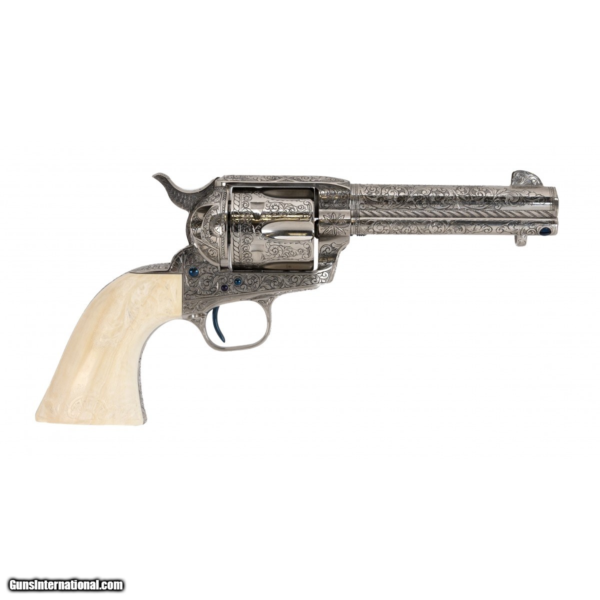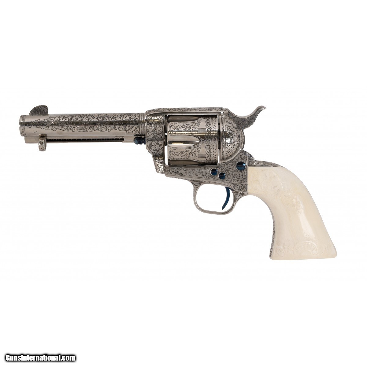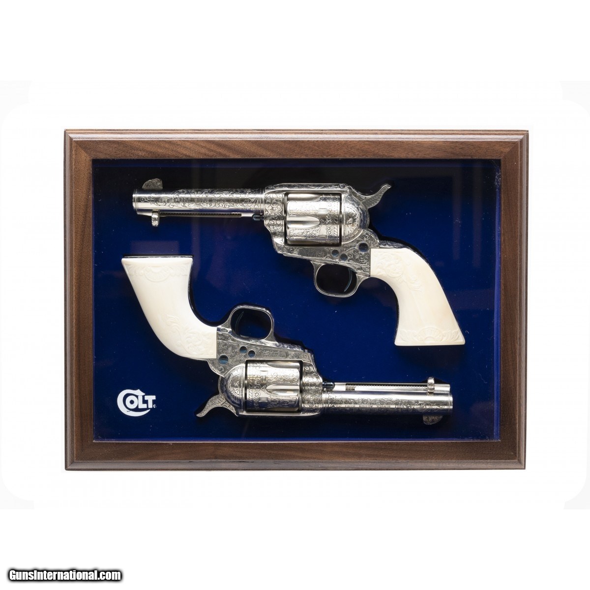 Beautiful engraved consecutive numbered pair of 3rd Gen 4.75"" Single Actions. The guns are nickel plated with full coverage scroll engraving and fire blued small parts. The grips are ornately carved one piece ivories. This is a stunning pair, in mint condition and comes in a glass top presentation case.