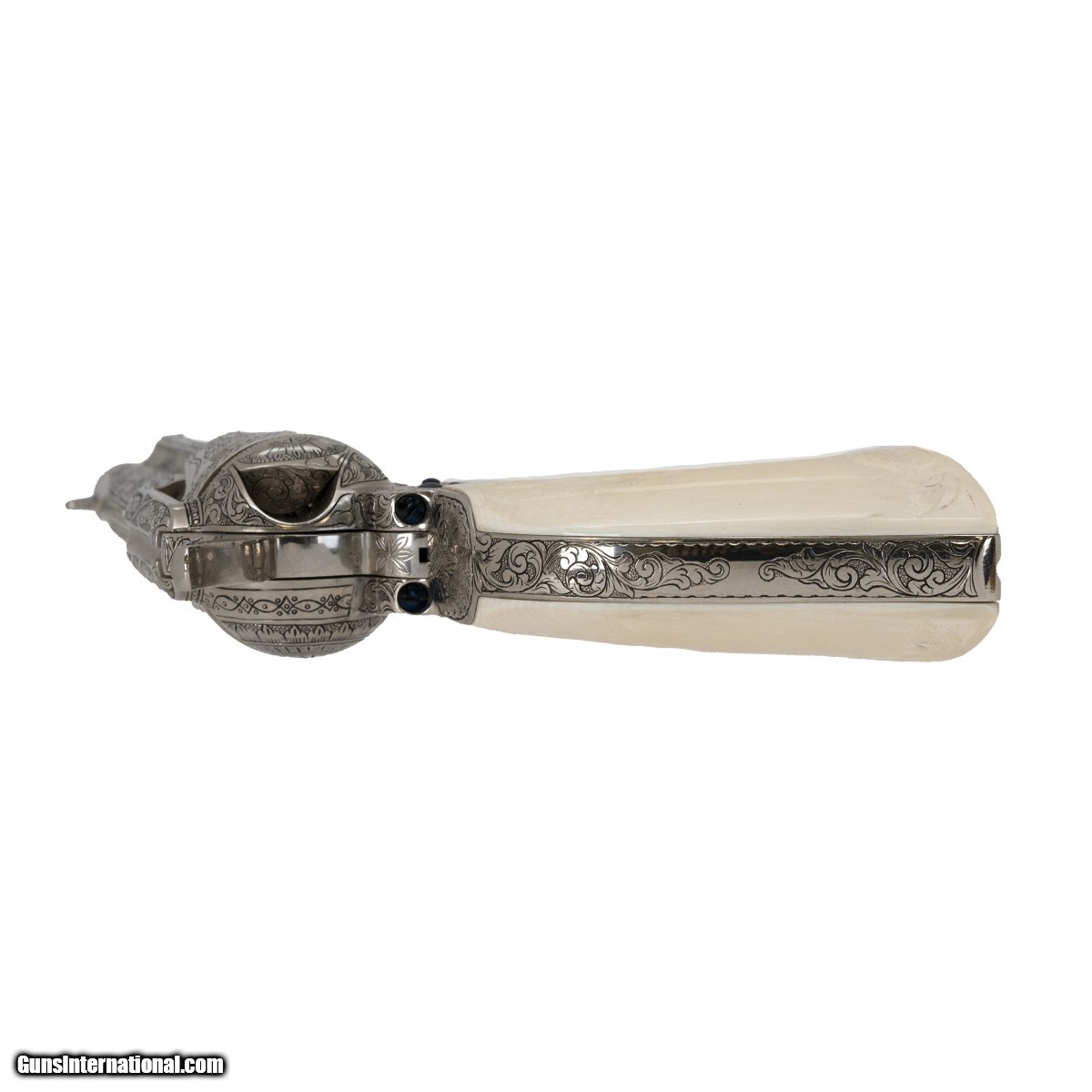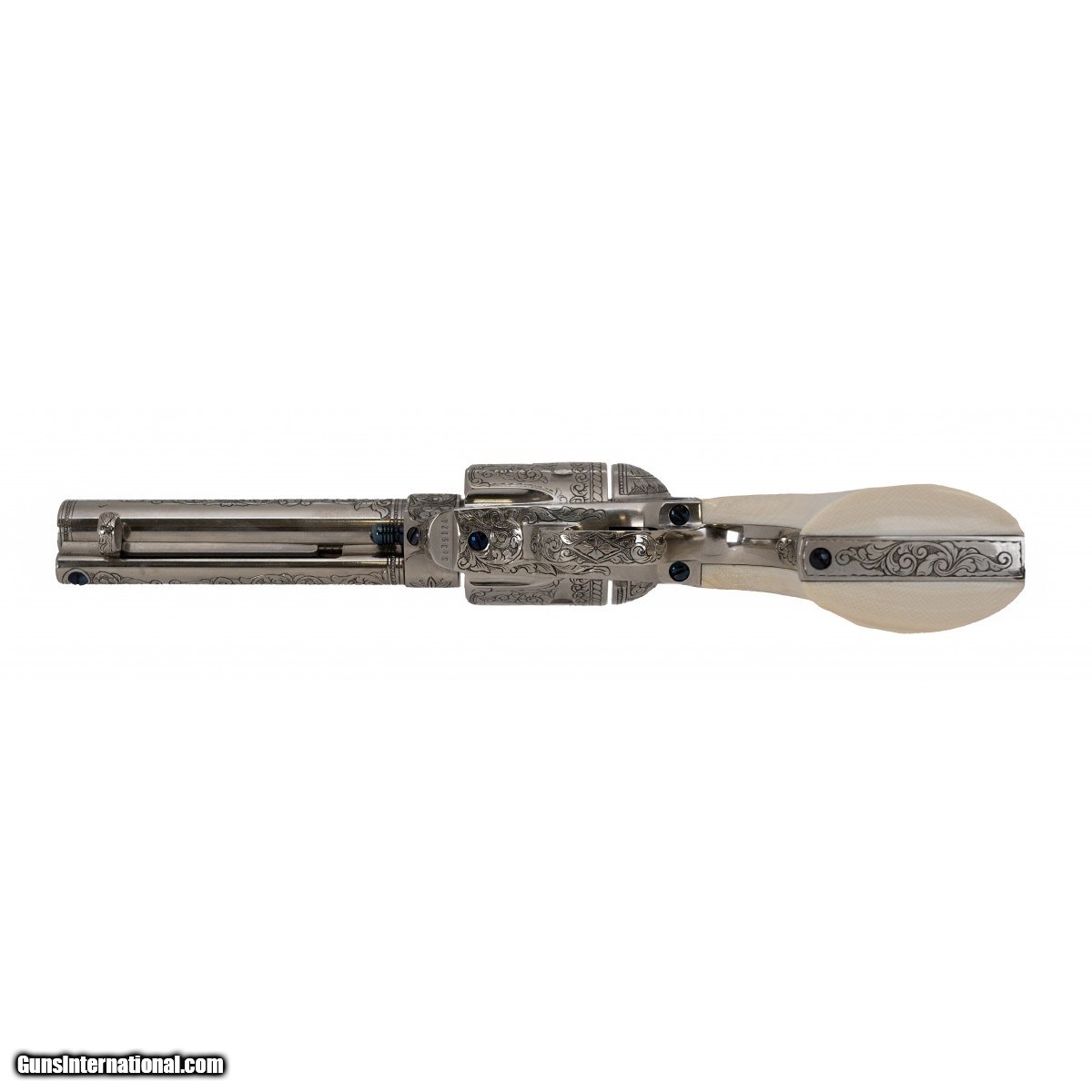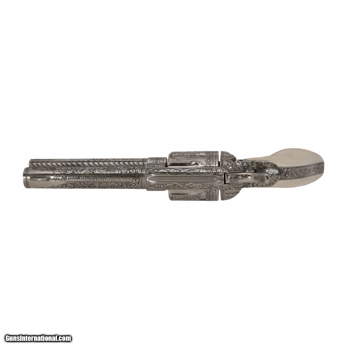 Beautiful engraved consecutive numbered pair of 3rd Gen 4.75"" Single Actions. The guns are nickel plated with full coverage scroll engraving and fire blued small parts. The grips are ornately carved one piece ivories. This is a stunning pair, in mint condition and comes in a glass top presentation case.