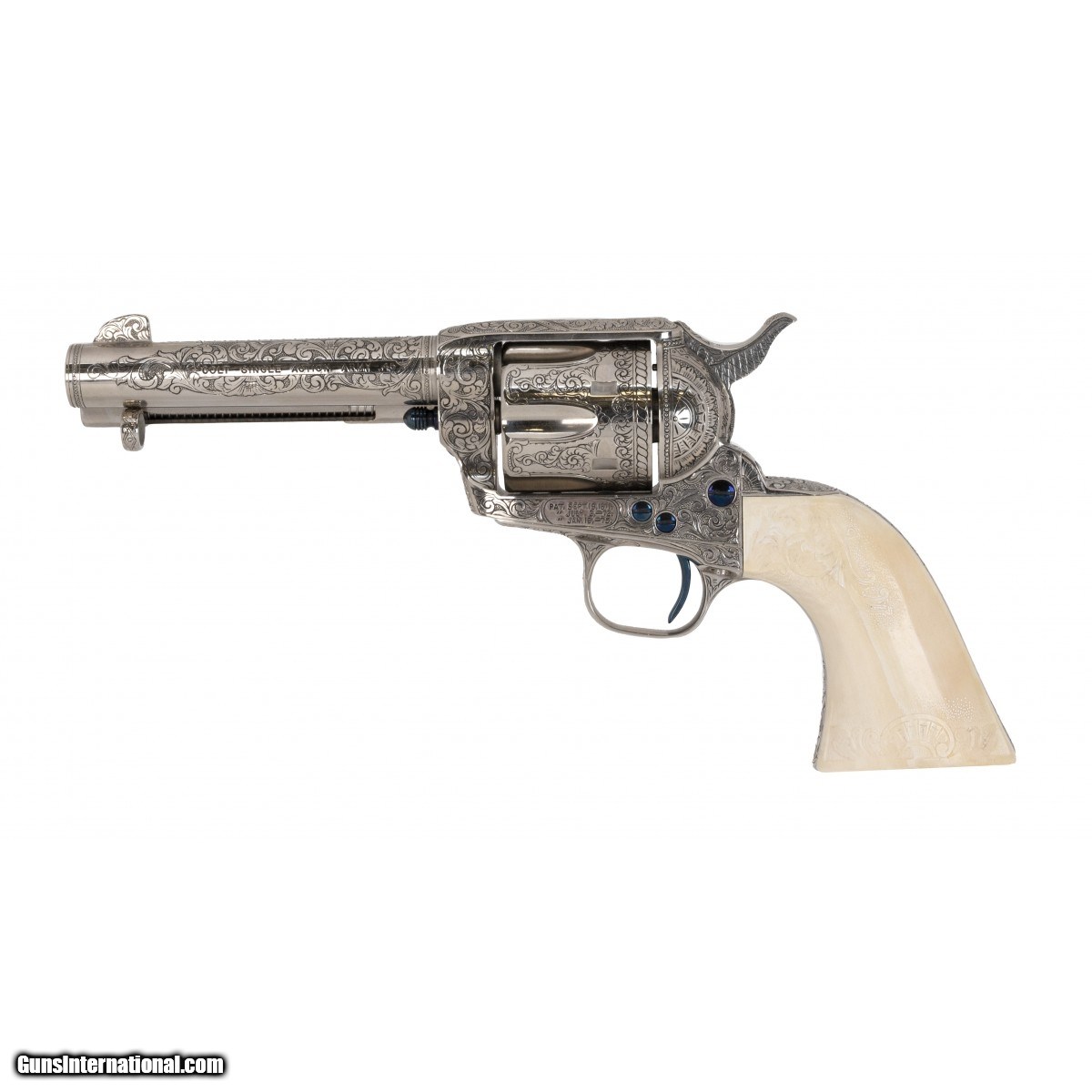 Description: " Beautiful engraved consecutive numbered pair of 3rd Gen 4.75"" Single Actions. The guns are nickel plated with full coverage scroll engraving and fire blued small parts. The grips are ornately carved one piece ivories. This is a stunning pair, in mint condition and comes in a glass top presentation case. SOLD |