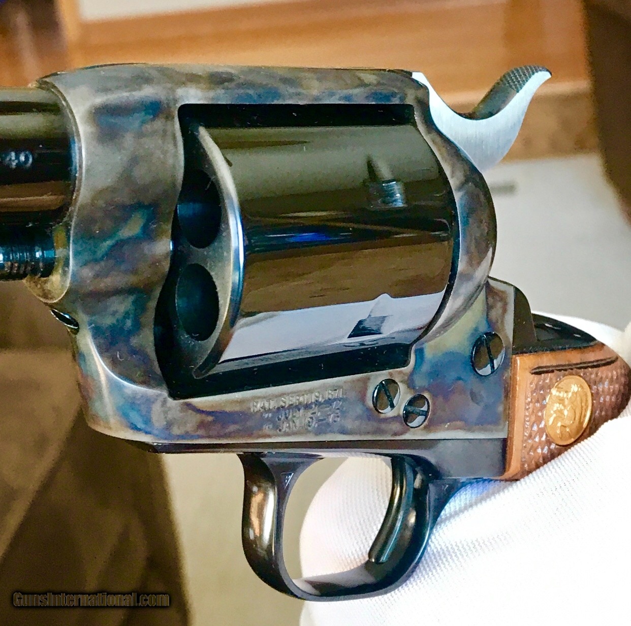 Description: This “CONSECUTIVE” 3 Gun set of Custom Colt SAA’s were shipped to Southern Ohio Gun Distributers in 1988. OHGD special ordered 200 Colt SAA’s with unfluted cylinders, checkerd wood grips and barrel lengths of 4, 5 1/2 and 6 inch barrels. Factory letter, ordered, states the break down of each barrel length. Of the 200 guns shipped there were 12 3 gun sets. The remaining guns with the 3 barrel lengths mentioned were sold individually. I believe there were between 50-60 of each barrel length. All this information will be on the letter. A very limited run none the less. There is no room for improvement on this set. All 3 guns are unfired, unturned and come in their original boxes, that are numbered to the gun, with all the original paperwork. The boxes are good condition with light storage wear as shown and they are fully intact. The fit and finish on these guns is amazing. The unfluted barrels are very attractive and the checkered wood grips are custom fit, flawless and give these Colt’s a very special look. Please keep in mind that it is very difficult to photograph Case Colors. They always look better when they are in your hand. Investment grade Colt’s that will compliment any SAA Collection!! Buyer pays $50 insured shipping to FFL We will “not” seperate the set. $7,975 or best offer. TRADES WELCOME! SOLD |