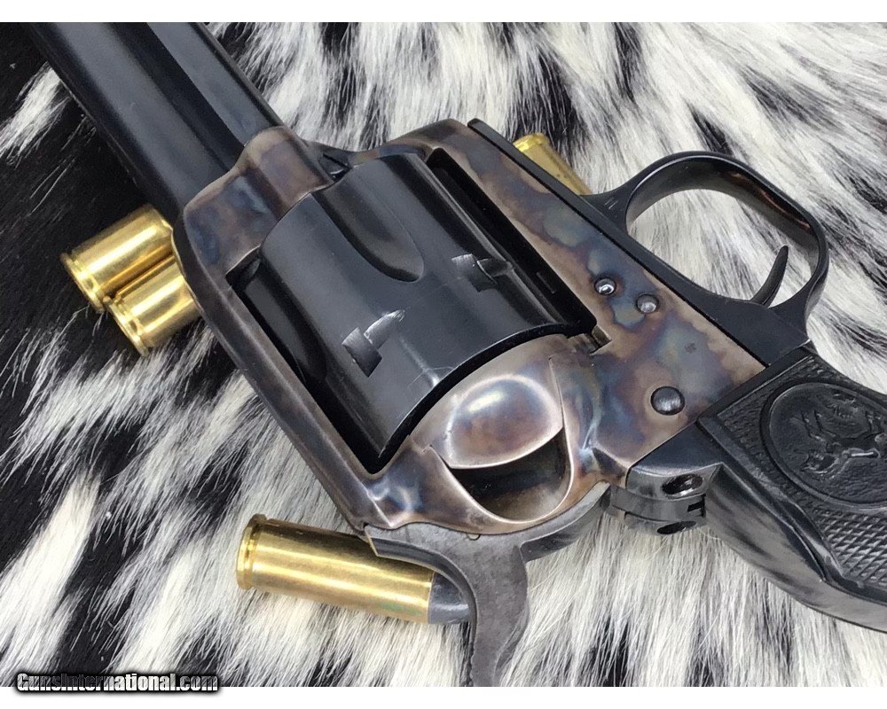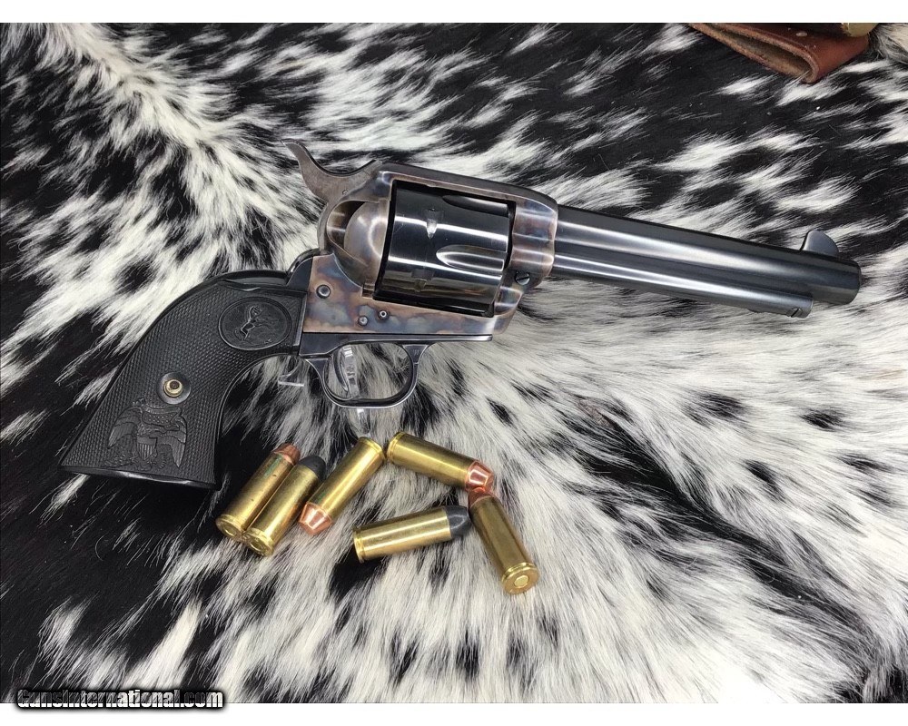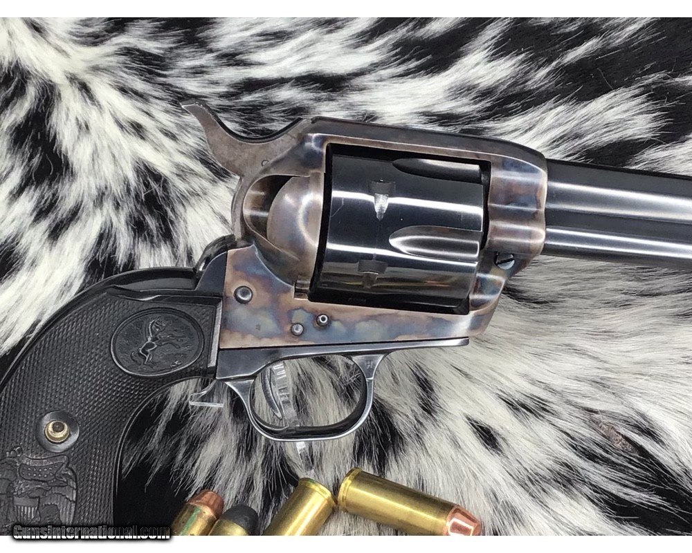Description: Very clean 1979 Colt SAA wearing a 5.5 inch barrel and chambered in .45 Colt. Beautiful case colored frame, and factory eagle grips. Gun shows very little use with only a small area of holster wear on muzzle. Tight four click action with rock solid lockup. Comes with old Colt box with inserts in decent condition. Add 3% if paying with credit card. God Bless America from a proud American, and a Viet Nam Vet , thankful for our freedoms.. paid for by the Blood ,Sweat and Tears of our brave men and women in uniform. Ten Below Firearms is a Veteran owned and operated business. We specialize in out of production models of high quality firearms. We love to ship! If you are out of state or can't make it to our store, just give us a call! Handguns normally ship for $30 and Long guns for $40 to $65 for extra length long guns. That's 2-3 day USPS Priority shipping, Delivery conformation and with tracking number. Optional Postal insurance is additional $1.70 per $100 and highly recommended. We are OPEN BY APPOINTMENT ONLY FOR IN PERSON VISITS We are cash buyers for your guns. SOLD Handgun Caliber: .45 Colt Manufacturer: Colt Model: SAA Serial Number: SA13024 Barrel Length: 5.5 inch Condition: Very good Metal Condition: Very good Bore Condition: Very good Action: SA Finish: Blued/Case colored Sights: Fixed Manufacture Date: 1979 Case: Box Item Location: Mn |