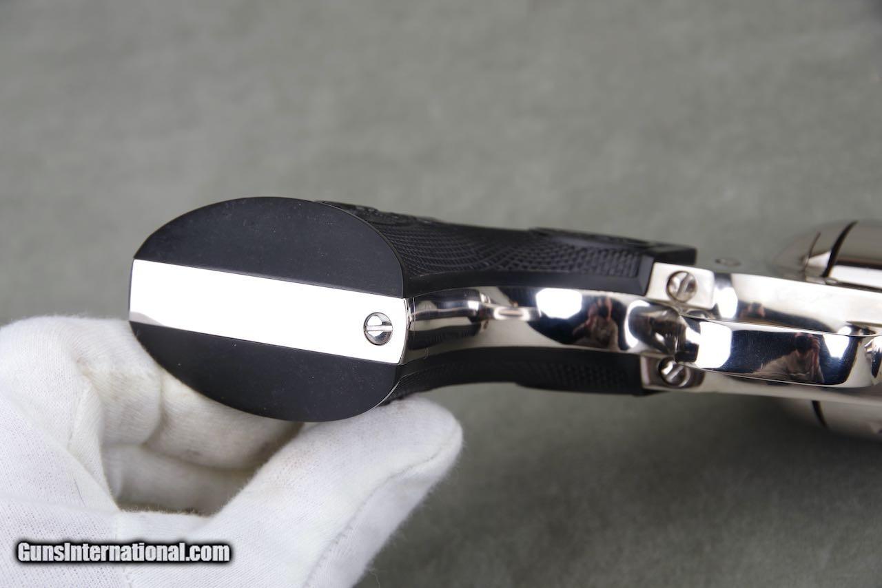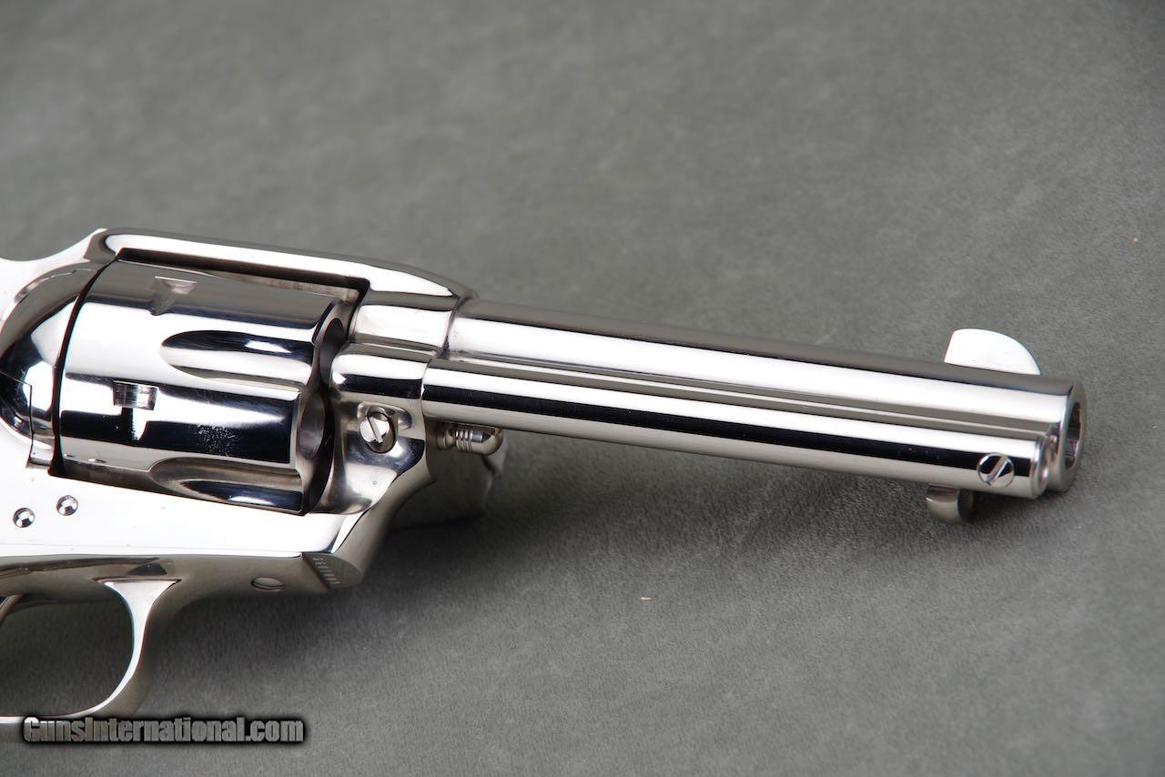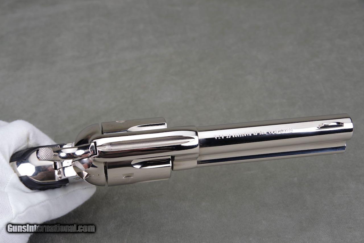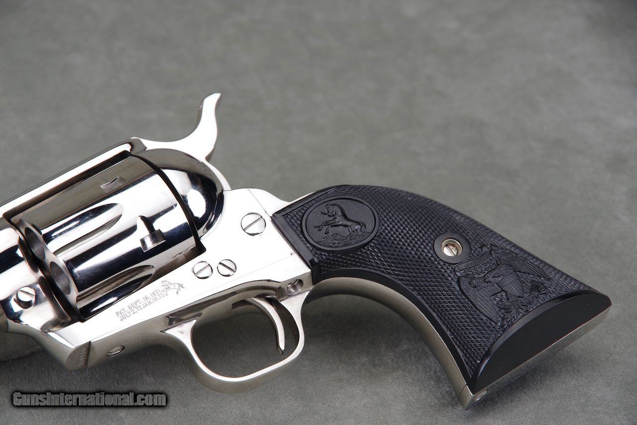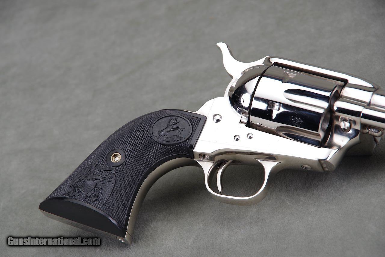 Description: 2010 Colt Custom Shop Single Action Armay chambered in 44–40 with a 4.75 inch barrel and factory nickel finish. This revolver is new in the original box numbered to the gun with all of the paperwork shown. The nickel remains brilliant and mirror like throughout. As seen in the photos it only shows the slightest of superficial handling and overall the finish rates 99%. The factory black eagle grips remain in perfect condition with sharp checkers throughout. This is a very nice and complete example of a difficult to find single action. SOLD Handgun Caliber: .44-40 Winchester (.44 WCF) Manufacturer: Colt Model: SAA Barrel Length: 4.75 |