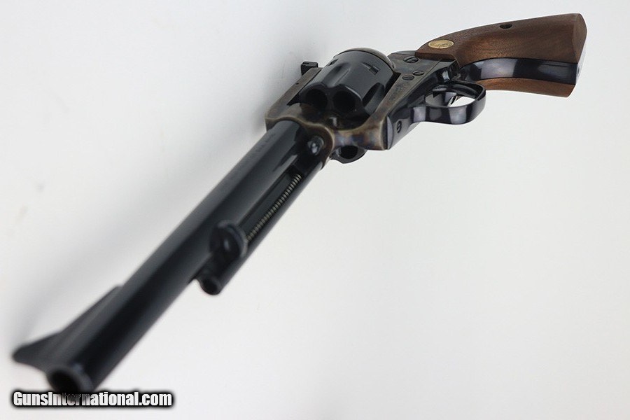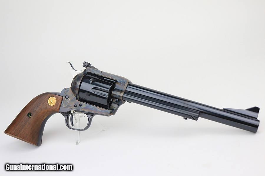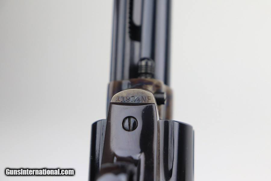 Description: This is a mint example of a 3rd generation Colt New Frontier Single Action Army revolver manufactured in 1981. The gun is all matching, chambered in .44-40, and has a 7.5 inch barrel. It comes with the original matching-numbered box and owners manual. The gun is in beautiful, like-new condition with no signs of wear - there isn't even a roll mark on the cylinder. There is just one small spot of what looks like dried adhesive on the top edge of the frame. The frame features a gorgeous case-hardened finish. Comes with mint wood grips. The bore is mint. SOLD Curio/Relic: Yes Handgun Caliber: .44-40 Winchester (.44 WCF) Bore: 10/10 Condition: Mint |