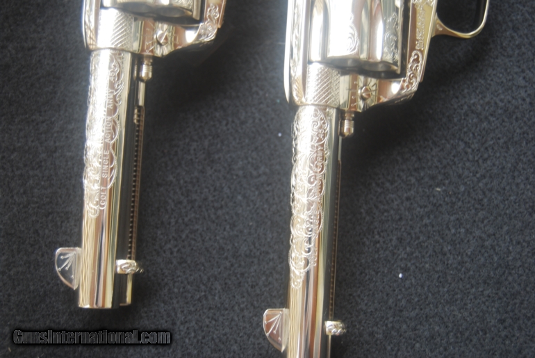 Description: Colt SAA 3rd generation. Nickel, .45 cal, desirable 4 3/4" bbl. NIB, unturn, unfired. Factory "B" engraved. consecutively numbered pair w/letter. W/box and papers. SOLD |