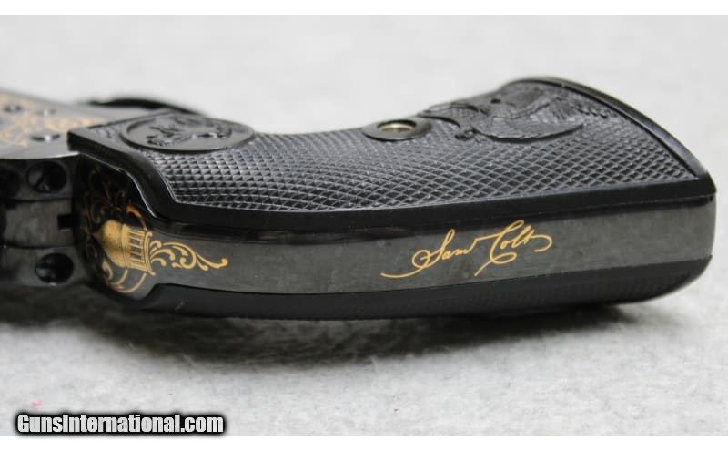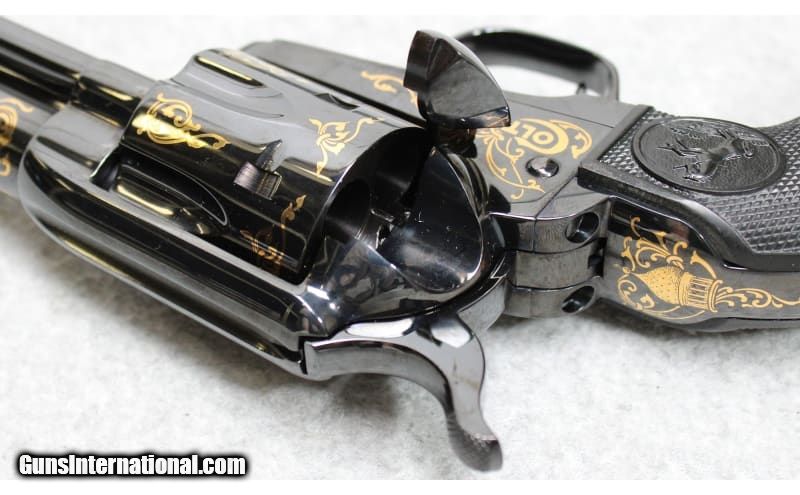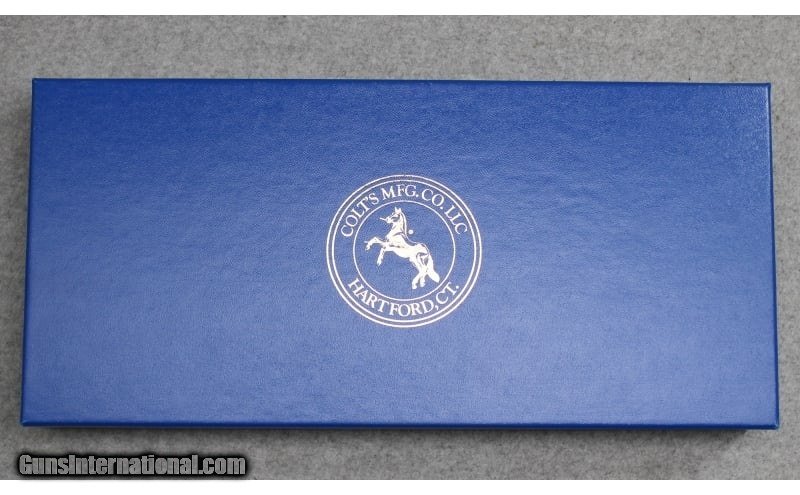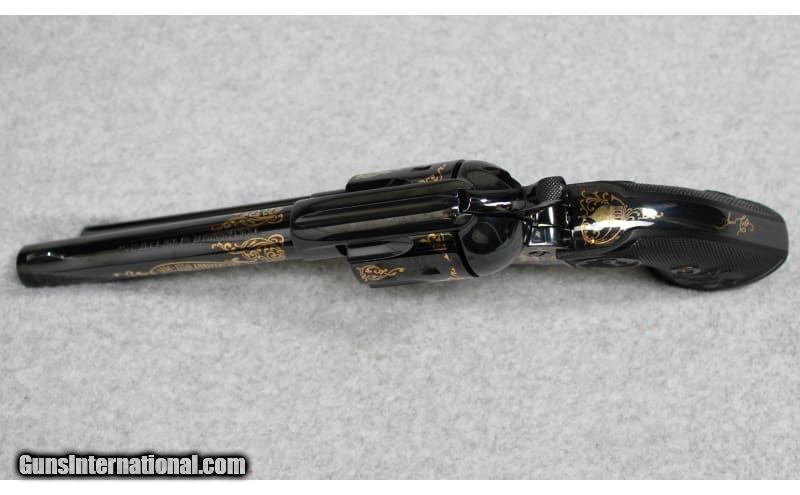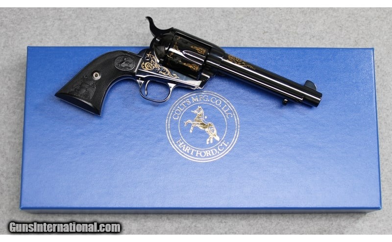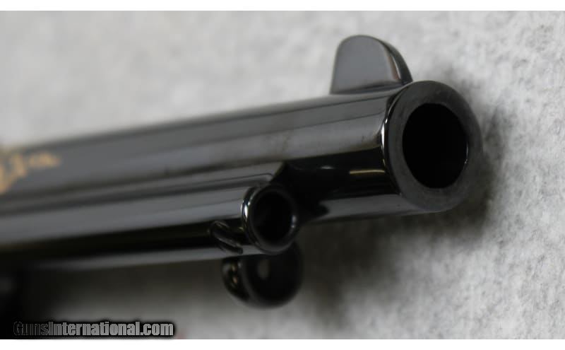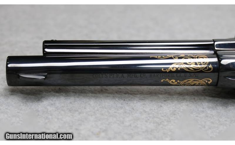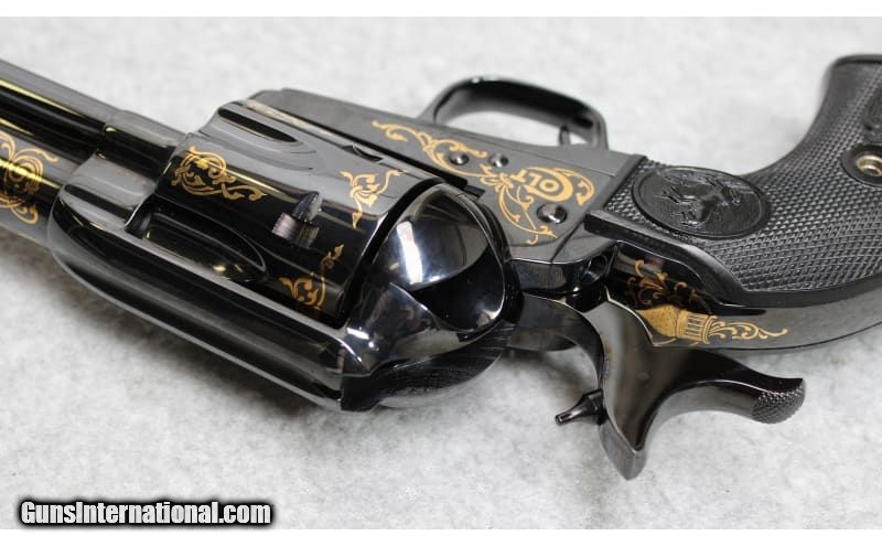 Description: This Colt 175th anniversary Single Action Army is chambered in .45 Long Colt. This gun's mirror like finish is adorned with gold accents celebrating the 175th anniversary of the company. The finish is excellent and there is no visible drag line on the cylinder. The hammer clicks perfectly, just as a Colt Single Action should. This item comes with it's blue box. .45 Long Colt SOLD Metal Condition: Very good with minor wear and handling marks Wood Condition: N/A Bore Condition: Bright and clear with no pitting Barrels: 5.5 inch Triggers: Single Action Butt Pad: Hard plastic grips Weight: 2 lb 4 oz Sights: Front blade sight Item Location: Fort Worth, TX |