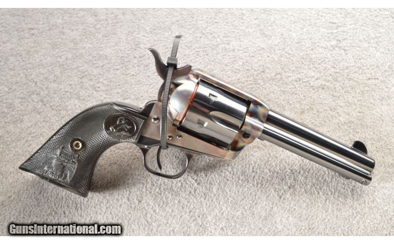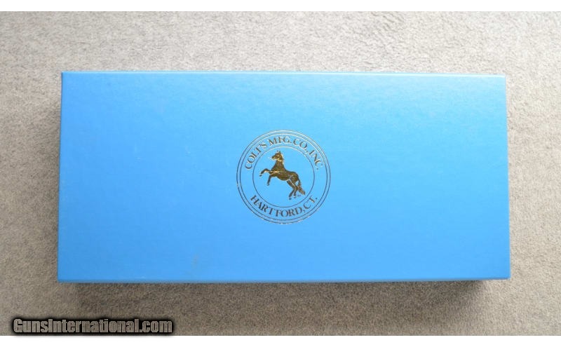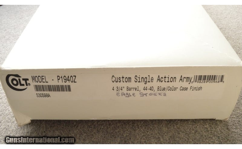 Description: Colt single action army 3rd gen, model – P1940Z. Manufactured in 2000 and chambered for 44-40 Winchester, the revolver has remained in unfired condition. The front sight is a quarter round blade fixed to the barrel. The rear sight is a square groove in the top strap. The grips are two-piece checkered black hard rubber with rampant colt in oval at the top and American Eagle at the bottom. The barrel, cylinder and grip frame are done in a polished blue, the frame is case colored. Comes in a blue Colt box with a white matching cardboard sleeve, cable lock and manual. This gun is serial "S30598A", we also have serial "S30599A" listed as SKU: 4071970. If interested in both please call to see if both are available. .44-40 Winchester SOLD Chambers: 6 shot revolver. Metal Condition: Like new. Wood Condition: Like new. Bore Condition: Like new. Triggers: Single action trigger. Weight: 2.25 lbs Sights: Fixed. Item Location: Owatonna, MN |