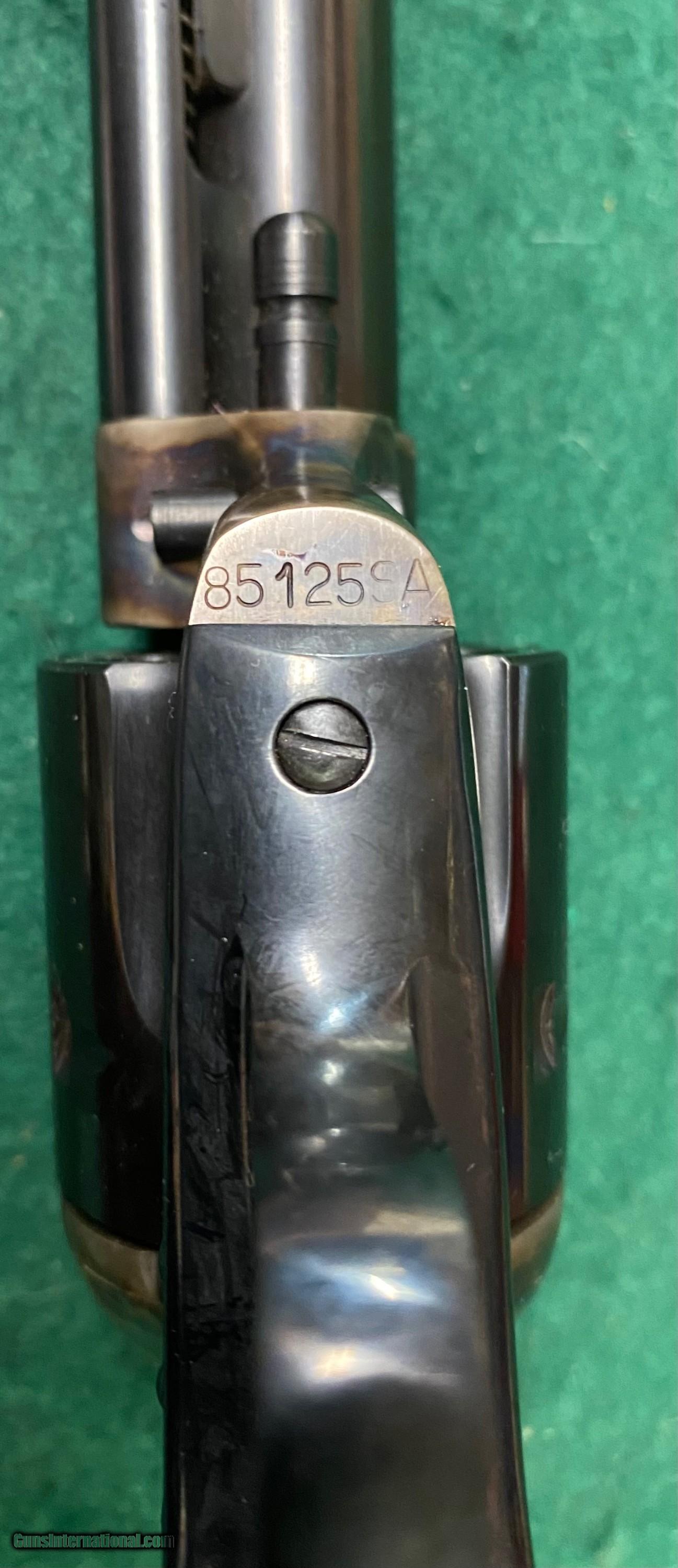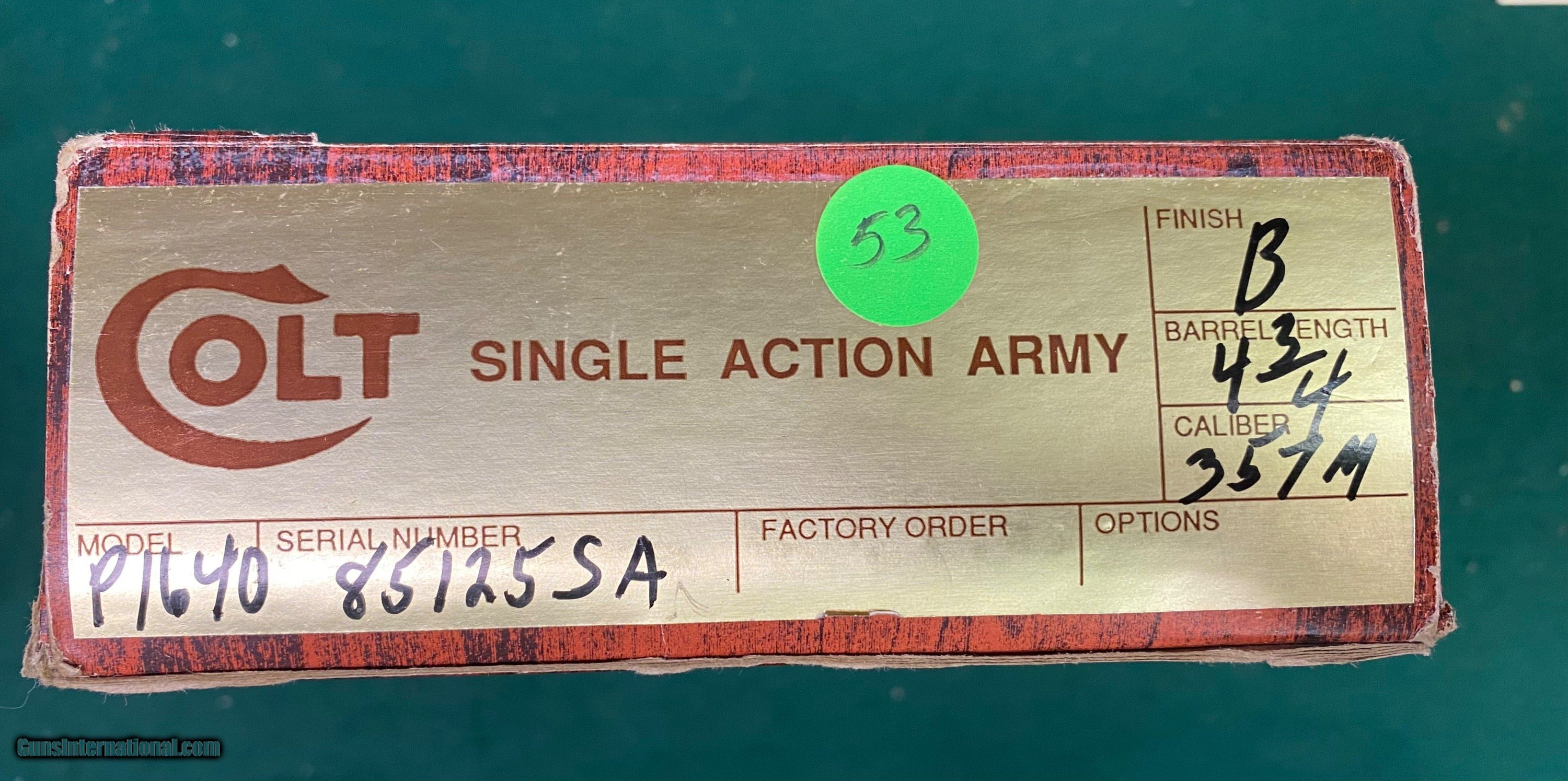 Description: Presenting another 3rd Generation Colt Single Action Army revolver in .357 Magnum for your consideration. Comes with the original styrofoam box and outer sleeve plus paperwork. Manufactured in 1977 according to the serial number (85125SA) & has a 4 3/4" barrel. Please see pictures for more details. We reserve the right to sell this item at our retail location until a firm offer is placed on Guns International. $2995 plus $30 shipping. Major credit cards accepted with a 4% fee. Personal checks are also welcome (no additional fee added) however, we do not ship the item until your check clears our bank. Business hours are Tuesday through Saturday, 9 AM to 5 PM. Closed on Sunday and Monday. If you're ever in the Waynesboro, PA area, stop on by and browse our extensive selection of vintage and modern firearms as well as accessories at George Herold's Gun Shoppe. We look forward to seeing you! SOLD Handgun Caliber: .357 Magnum Manufacturer: Colt Model: 3rd generation Single Action Army Serial Number: 85125SA Barrel Length: 4 3/4” Condition: New Old Stock |