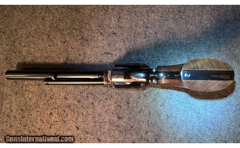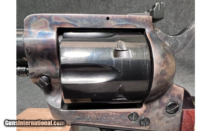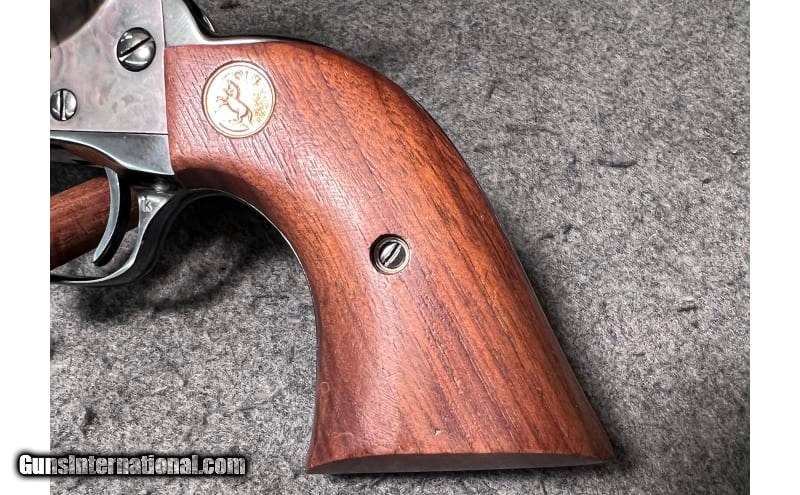 Description: This 1981 revolver is a Third Generation Colt New Frontier SAA chambered in .45 Colt. It has a blued blade front sight integral to a serrated base mounted to the barrel, a square notched leaf rear sight pinned to the top strap, adjustable for elevation and windage, a Colt emblem walnut stocks and a case color hardened frame. The left side of the barrel is marked "COLT NEW FRONTIER S.A.A. .45". The top of the barrel is marked "COLT'S PT.F.A. MFG. CO. HARTFORD, CT. U.S.A." The left side of the frame is marked "PAT. SEPT. 19, 1871 / JULY 2, 72 JAN. 19, 75" and a Rampant Colt logo. The bottom of the frame is marked with the serial number (16055NF), seen also, handwritten on the factory box. The left side of the trigger guard bow has the Verified Proof mark and a "K". The Colt Royal Blue is in very good condition overall, with some noticeable thinning to a small area on the left side of the muzzle and a couple of wear marks at the very top of the backstrap. The screw heads are sharp. The markings are crisp. The walnut stocks are in very good condition showing no discernable handling wear or marks. The bore is bright and shiny with very strong rifling intact. It comes with the original box, styrofoam inserts, owner's manual, Colt Letter, and other paperwork (see picture). .45 Long Colt SOLD Chambers: 6 round cylinder Metal Condition: "Bluing is in very good condition overall, with some noticeable thinning to a small area on the left side of the muzzle and a couple of wear marks at the very top of the backstrap Wood Condition: The walnut stocks are in very good condition showing no discernable handling wear or marks Bore Condition: Bright and shiny with strong rifling Barrels: 7½" Colt Royal Blue barrel Triggers: Smooth Colt Royal Blue trigger Stock Dimensions: 13" overall length Butt Pad: Walnut stocks with Gold Colt emblems Weight: 2 lb 8 oz Sights: "The front sight is a blued blade integral to a serrated base mounted to the barrel. The rear sight is a square-notched leaf pinned to the top strap, adjustable for elevation and windage. Item Location: Wichita, KS |
