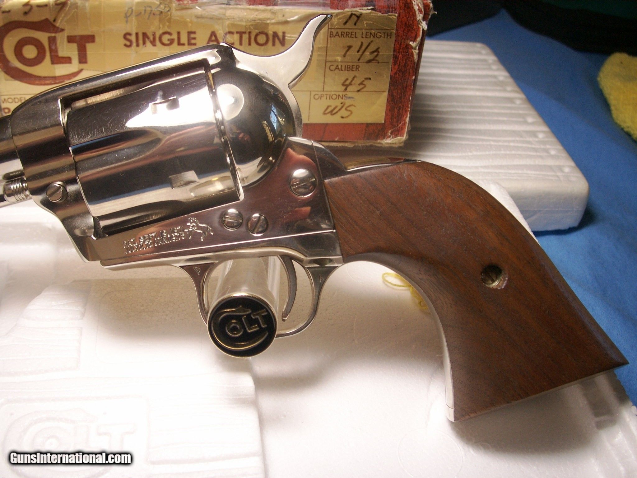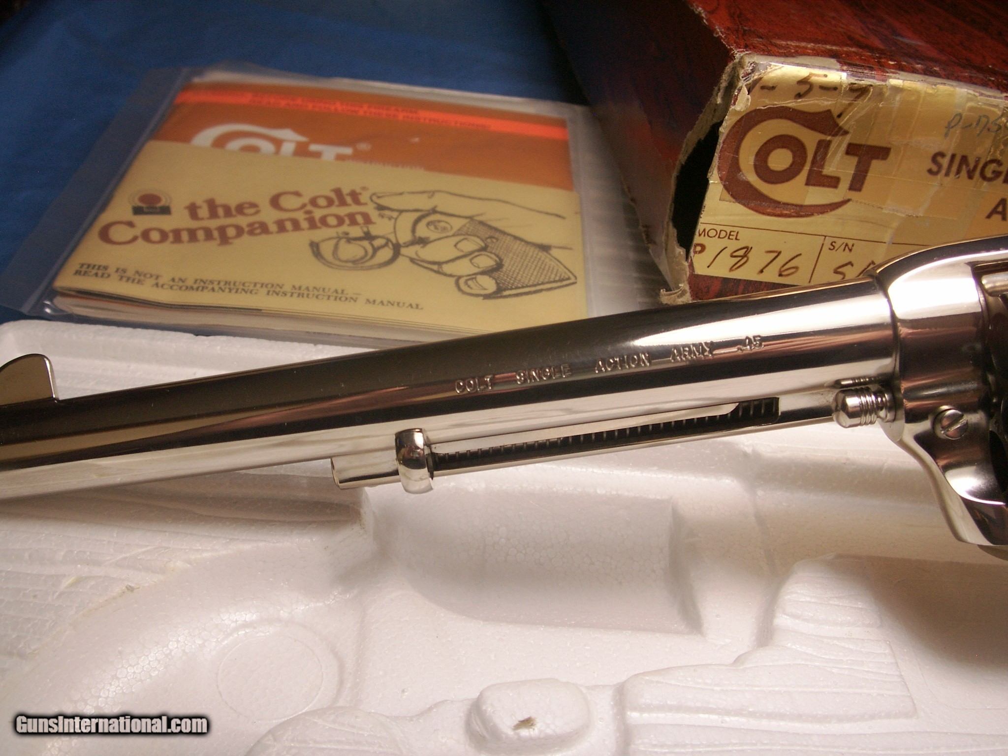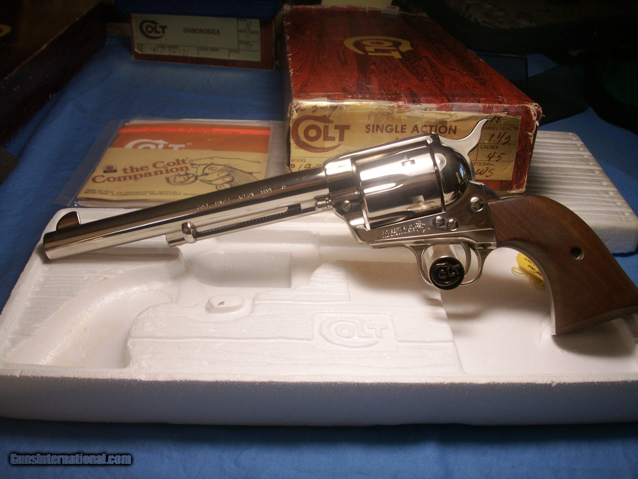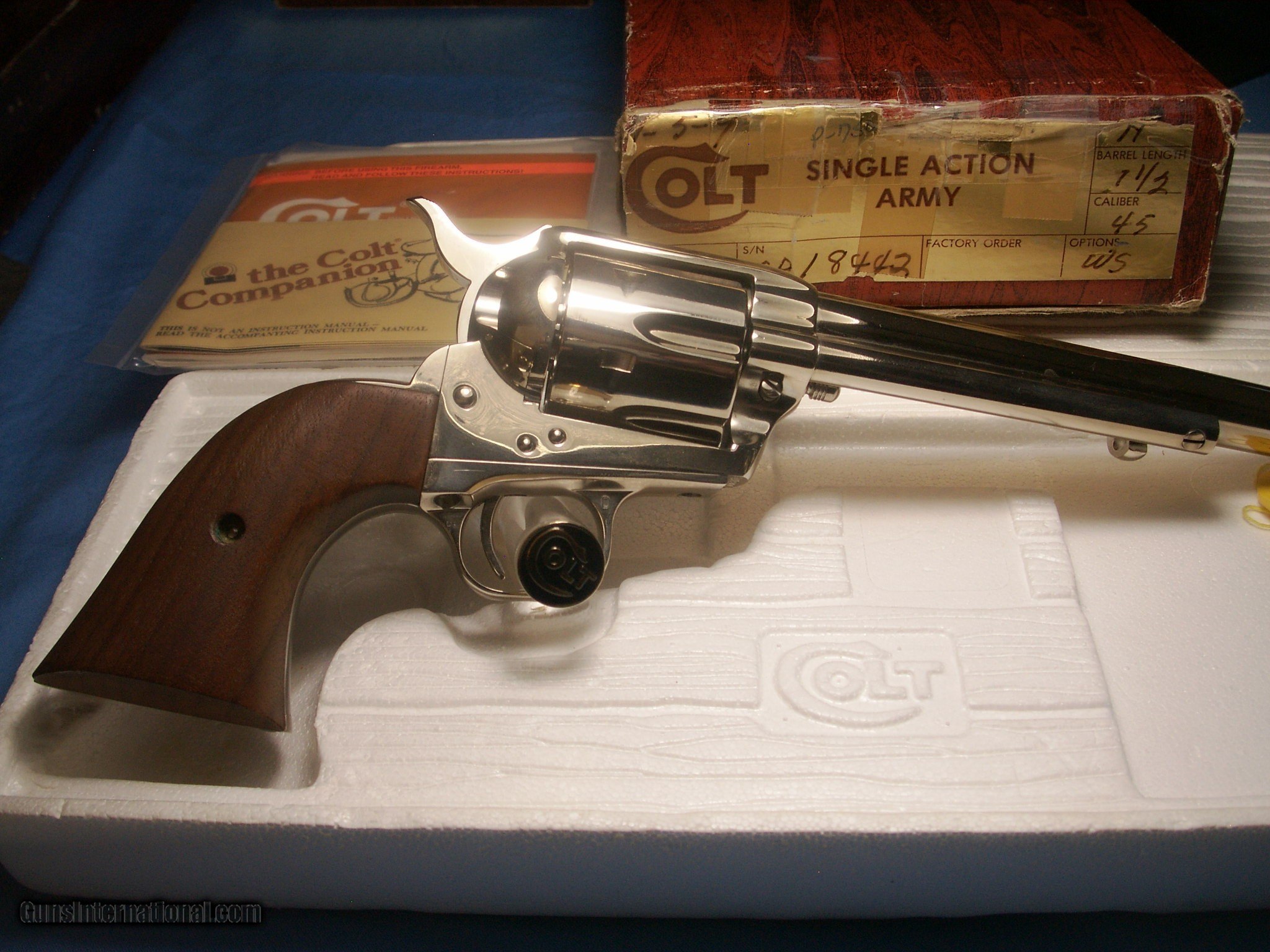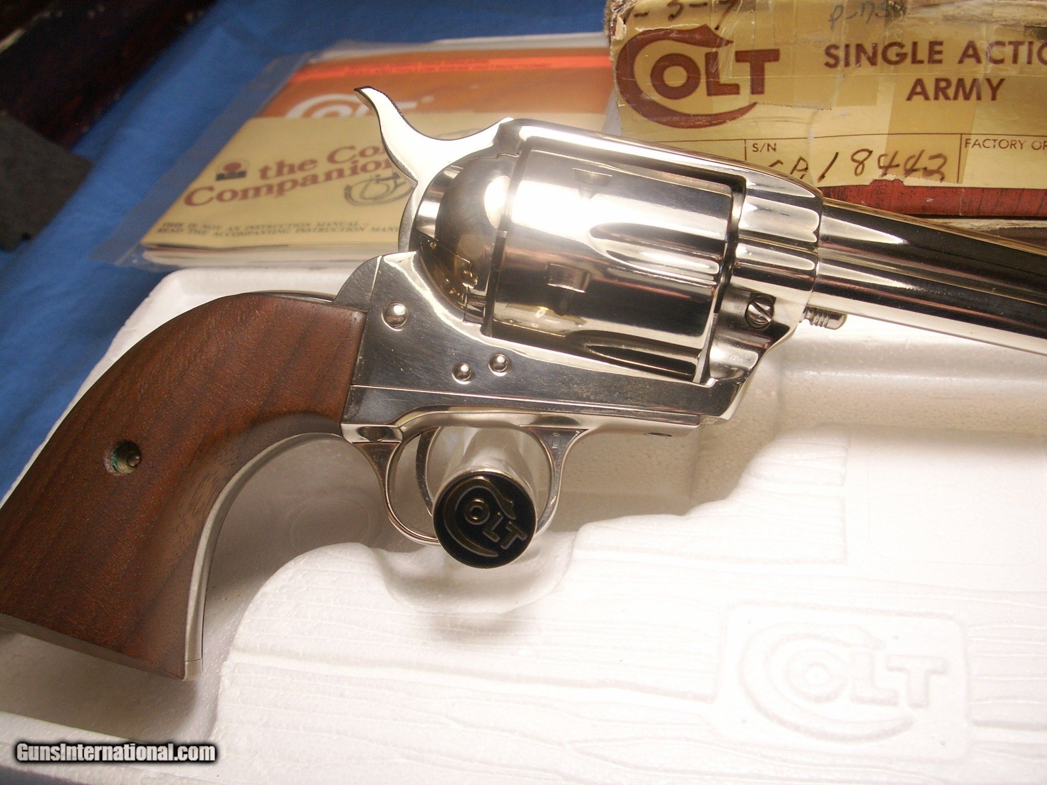Description: Sold Pending Funds: Colt 3rd Generation SAA Revolver. This is in .45 LC caliber with a 7.5" barrel and was manufactured in 1978. This is NIB (new in box) condition with the original Nickel finish. It has all (manual, papers, hang tag, everything with factory Walnut wood stocks. No cylinder turn line and perfect mirror bright bore and mechanics. A great investment in a firearm icon. Please see my other listings for more collectable firearms. SOLD |