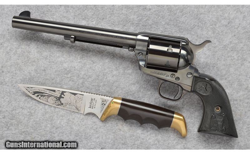 Description: Colt 3rd generation Single Action Army c.1978, Trans Alaskan Pipeline Commemorative, Issue number 581 of 801 Excellent condition includes matching engraved Kershaw knife, presentation case. .45 Colt SOLD Metal Condition: Blued Barrels: 7 1/2 Inch BBL Triggers: Single Action Weight: 43 oz. Sights: "Notched Frame, Blade Front Item Location: Buda, TX |