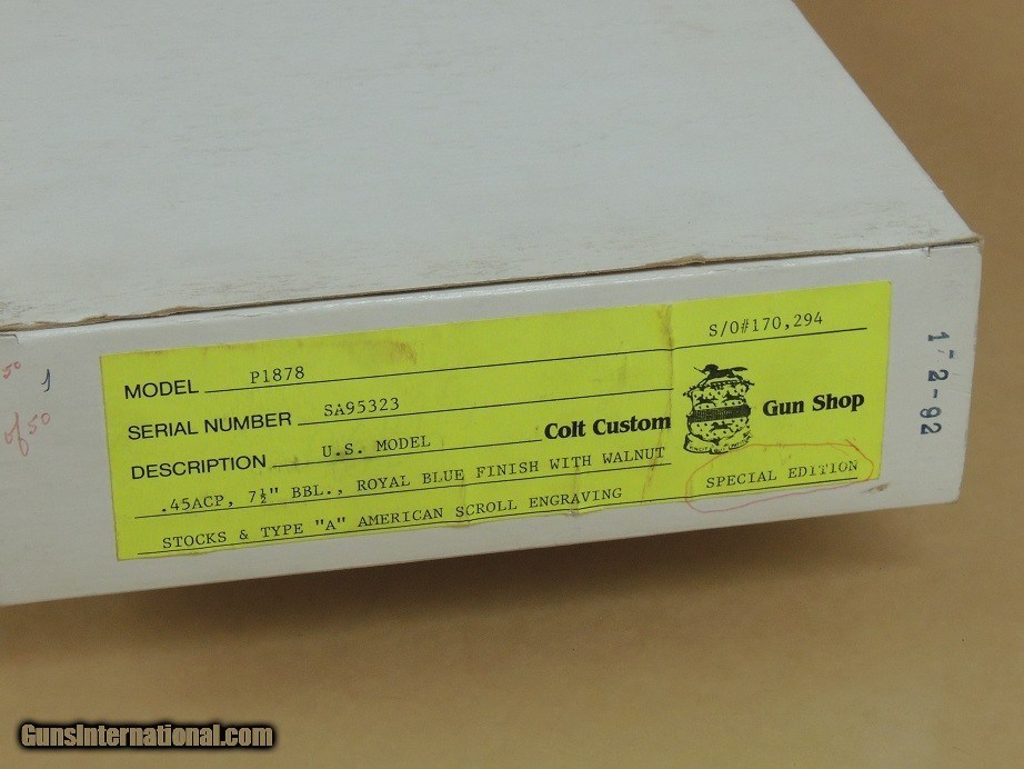 Description: Colt Factory Engraved .45 Acp Single Action Army in the Box, 7 1/2" Barrel, Full Blue Finish, Walnut Stocks, Third Generation, Factory Engraved in A coverage, appears factory test fired in the Box with extras as shown $4950 *Please make sure to include our inventory number and or Item description in any and all text messages * No Sales to California *Please Use Our Inventory Number for Inquiries* Payment Options *Postal Money Order* Cashiers Checks *Personal Checks (Item held until Check Cleared* Layaway 120 days*No Interest*Pay any way, any time you like over the term *Deposit required *Credit Cards Visa or Master Card 3.5% fee added to total sale* GA residents 7% sales Tax Applies *Best Phone Number for Calls or Text 229-424-8450* Shipping & Insurance $50.00 SOLD |