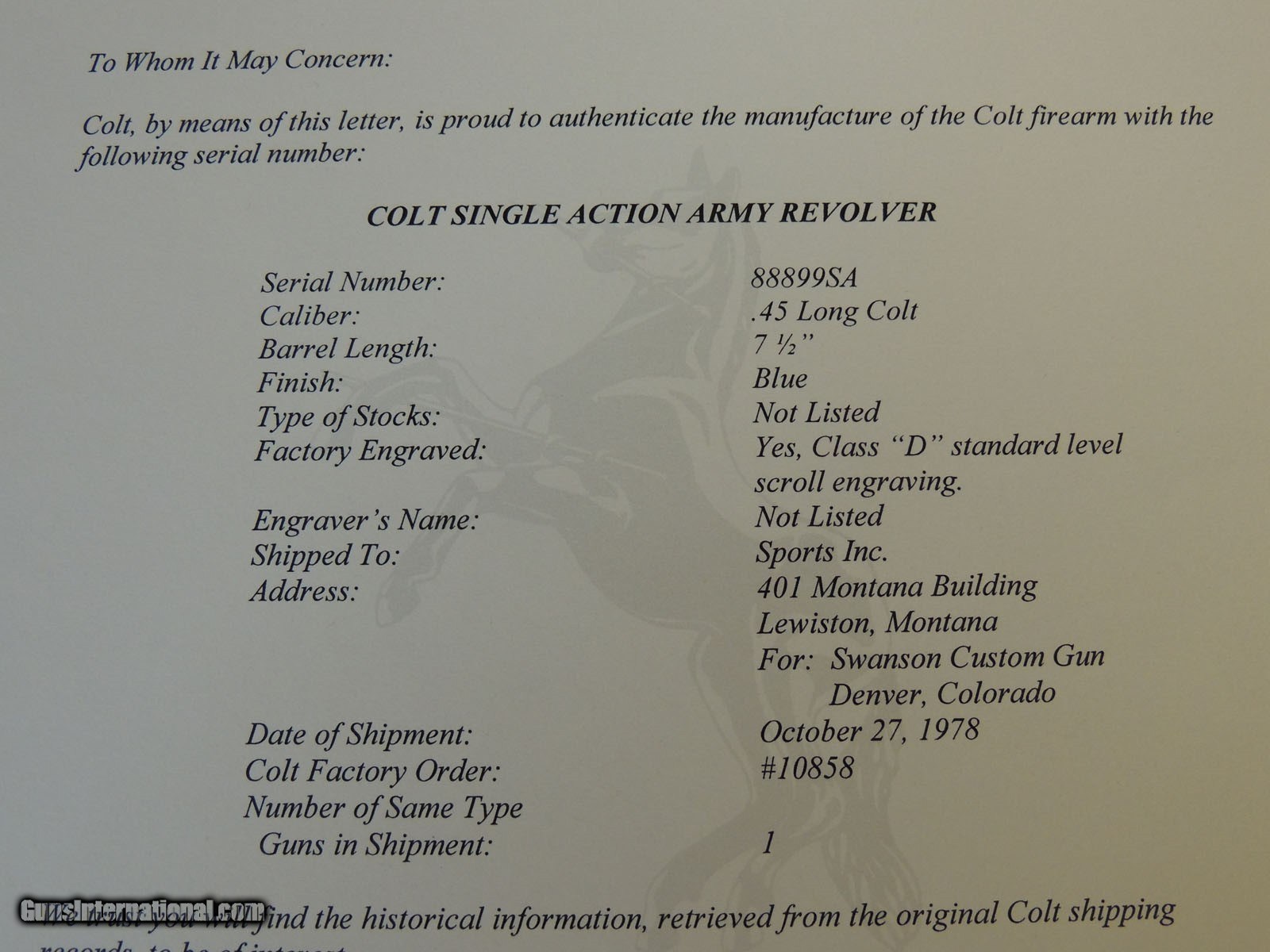 Description: COLT FACTORY ENGRAVED SINGLE ACTION ARMY .45LC, 7 1/2" BARREL, BLUE/CASE COLOR, WALNUT STOCKS, UNFLUTED CYLINDER, EARLY THIRD GENERATION, APPEARS UNFIRED, COLT LETTER, COLT CUSTOM SHOP CASE $5999 ******* (PLEASE REFERENCE OUR INVENTORY NUMBER) (PAYMENT OPTIONS) (Postal Money Order) (Cashiers Checks) (Personal Checks (Item held until Check Cleared) ***(Layaway 120 days-(No Interest)-(Pay any way, any time you like over the term) -(Deposit required)*** (Credit Cards Visa or Master Card 3% fee added to total sale) (GA residents 7% sales Tax Applies) (FAX 888-597-1394) (BEST PHONE/TEXT 229-424-8450) (Shipping $35.00) SOLD |