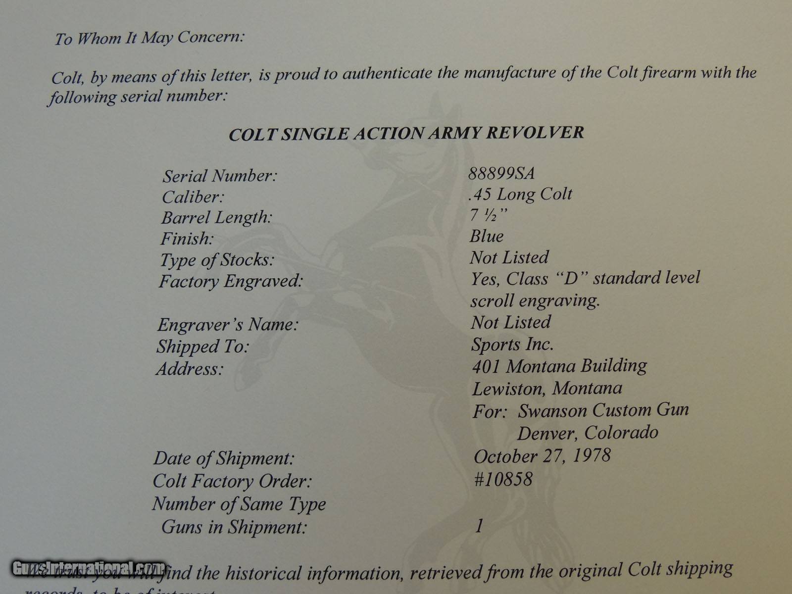Description: COLT FACTORY ENGRAVED SINGLE ACTION ARMY .45LC, 7 1/2" BARREL, BLUE/CASE COLOR, WALNUT STOCKS, UNFLUTED CYLINDER, EARLY THIRD GENERATION, APPEARS UNFIRED, COLT LETTER, COLT CUSTOM SHOP CASE $5999 ******* (PLEASE REFERENCE OUR INVENTORY NUMBER) (PAYMENT OPTIONS) (Postal Money Order) (Cashiers Checks) (Personal Checks (Item held until Check Cleared) ***(Layaway 120 days-(No Interest)-(Pay any way, any time you like over the term) -(Deposit required)*** (Credit Cards Visa or Master Card 3% fee added to total sale) (GA residents 7% sales Tax Applies) (FAX 888-597-1394) (BEST PHONE/TEXT 229-424-8450) (Shipping $35.00) SOLD |