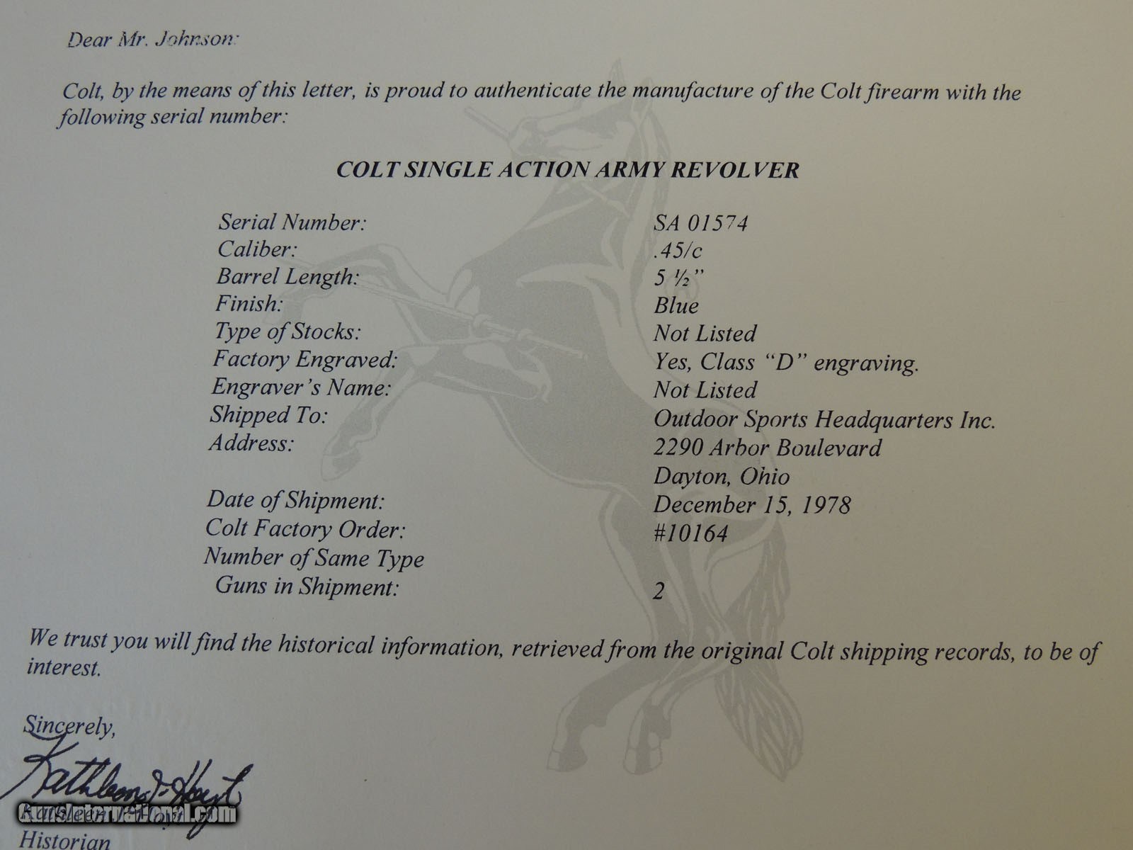 Description: COLT FACTORY ENGRAVED SINGLE ACTION ARMY .45LC, 5 1/2" BARREL, BLUE/CASE COLOR, EAGLE STOCKS, "D" ENGRAVING COVERAGE, EARLY THIRD GENERATION, COLT CUSTOM SHOP CASE, APPEARS UNFIRED $5999 ******* (PLEASE REFERENCE OUR INVENTORY NUMBER) (PAYMENT OPTIONS) (Postal Money Order) (Cashiers Checks) (Personal Checks (Item held until Check Cleared) ***(Layaway 120 days-(No Interest)-(Pay any way, any time you like over the term) -(Deposit required)*** (Credit Cards Visa or Master Card 3% fee added to total sale) (GA residents 7% sales Tax Applies) (FAX 888-597-1394) (BEST PHONE/TEXT 229-424-8450) (Shipping $35.00) SOLD |