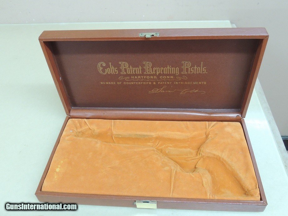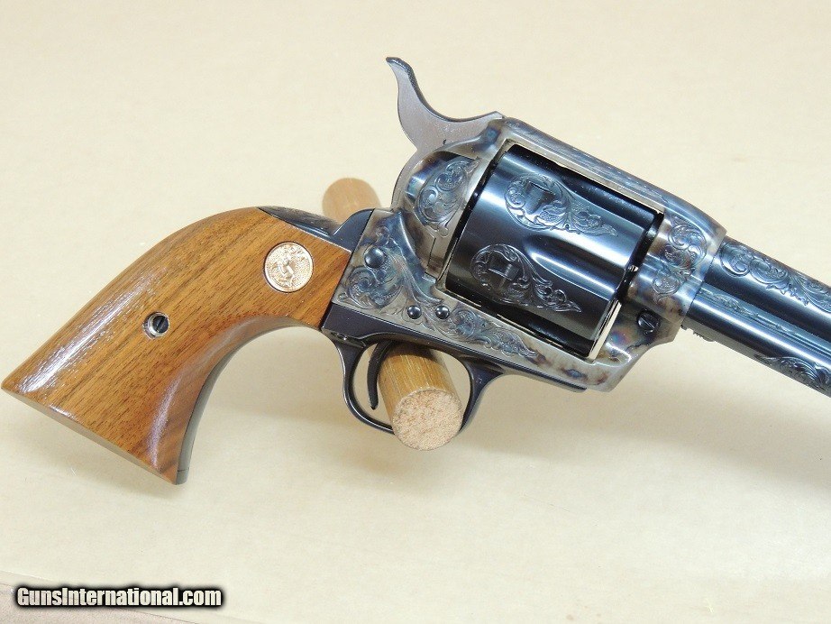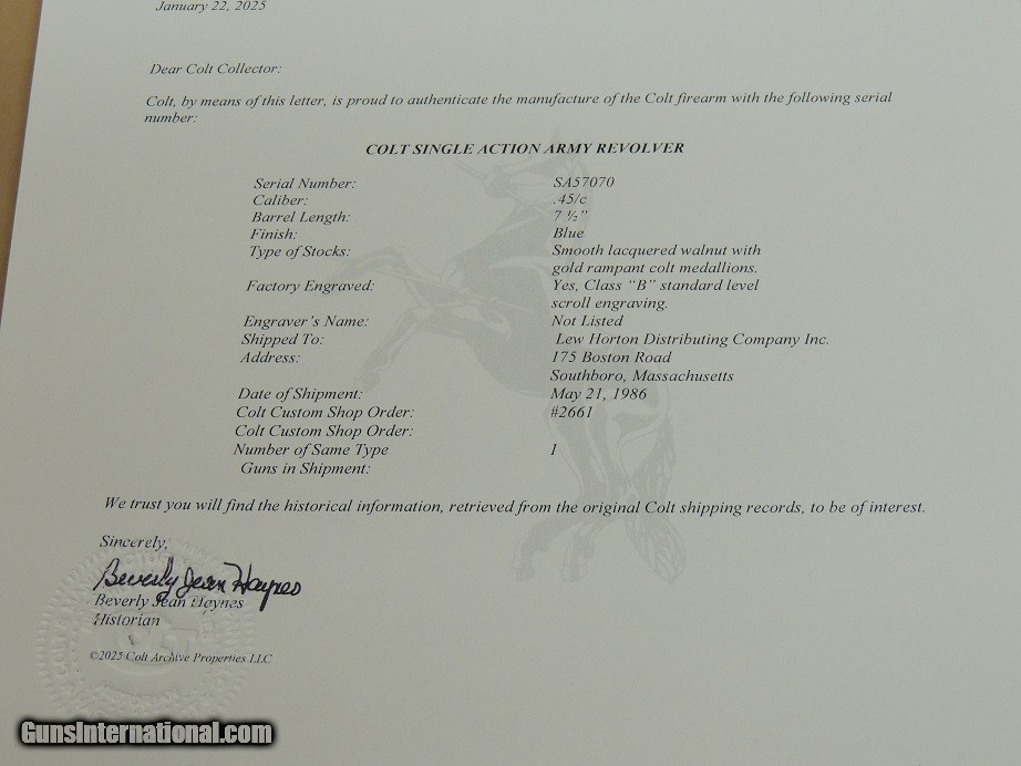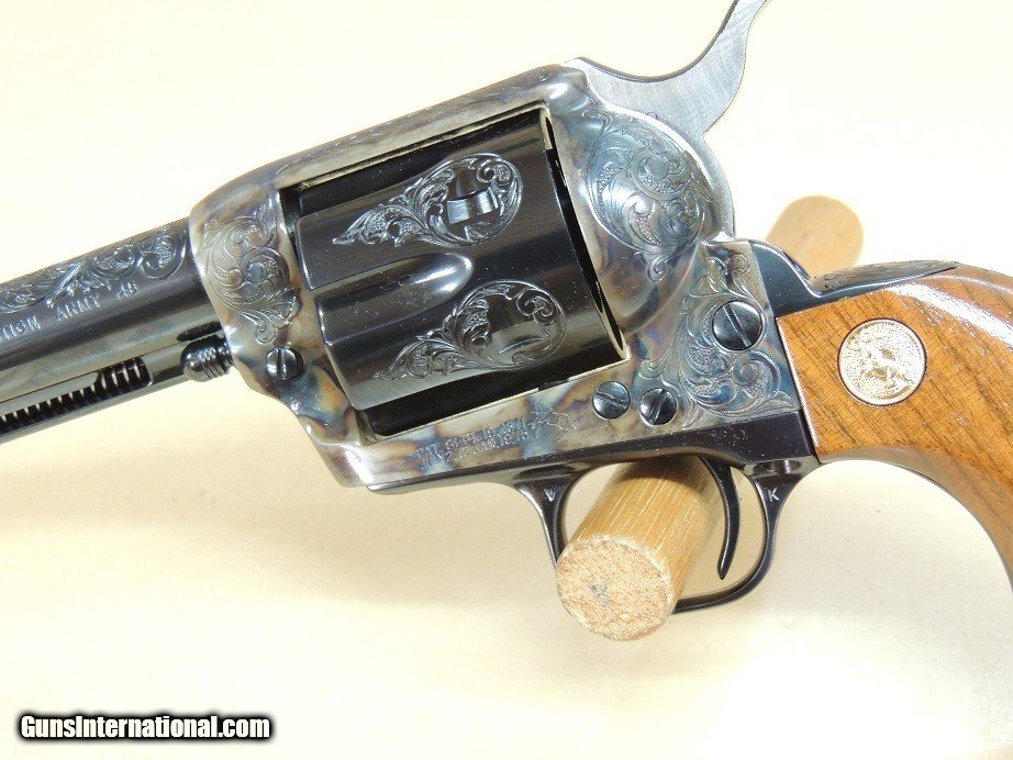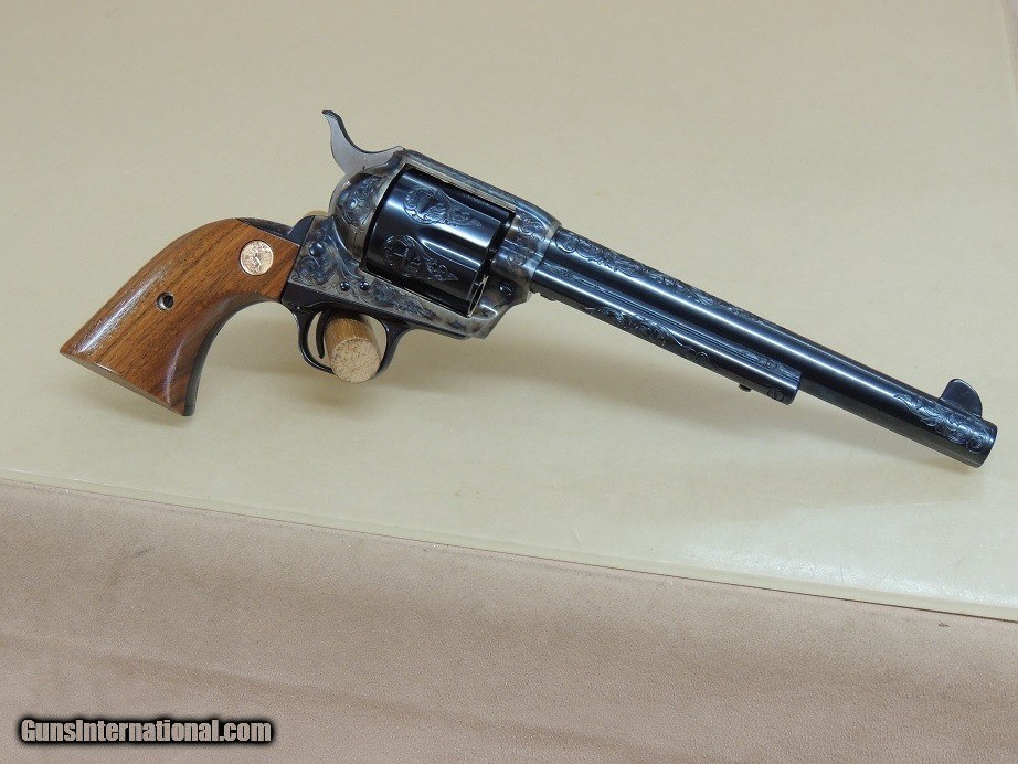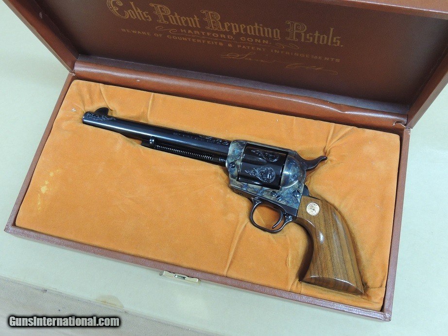 Colt Factory Engraved Single Action Army 45lc, 7 1/2" Barrel mint bore, Blue Case Color, rare feature: smooth walnut stocks with internal escutcheon, Third Generation shipped 1986', Colt Custom Shop Case, Colt Factory Letter, as new condition,