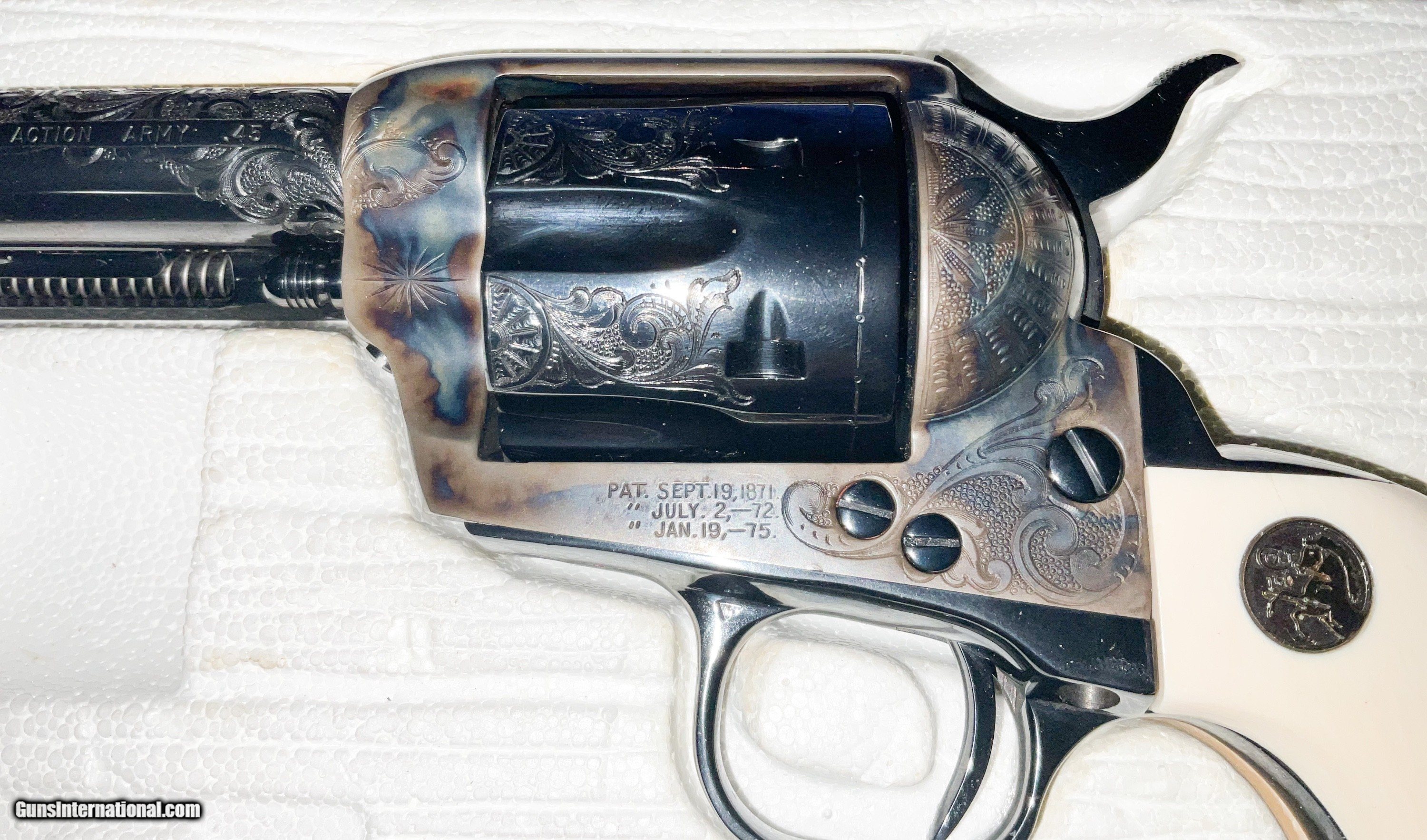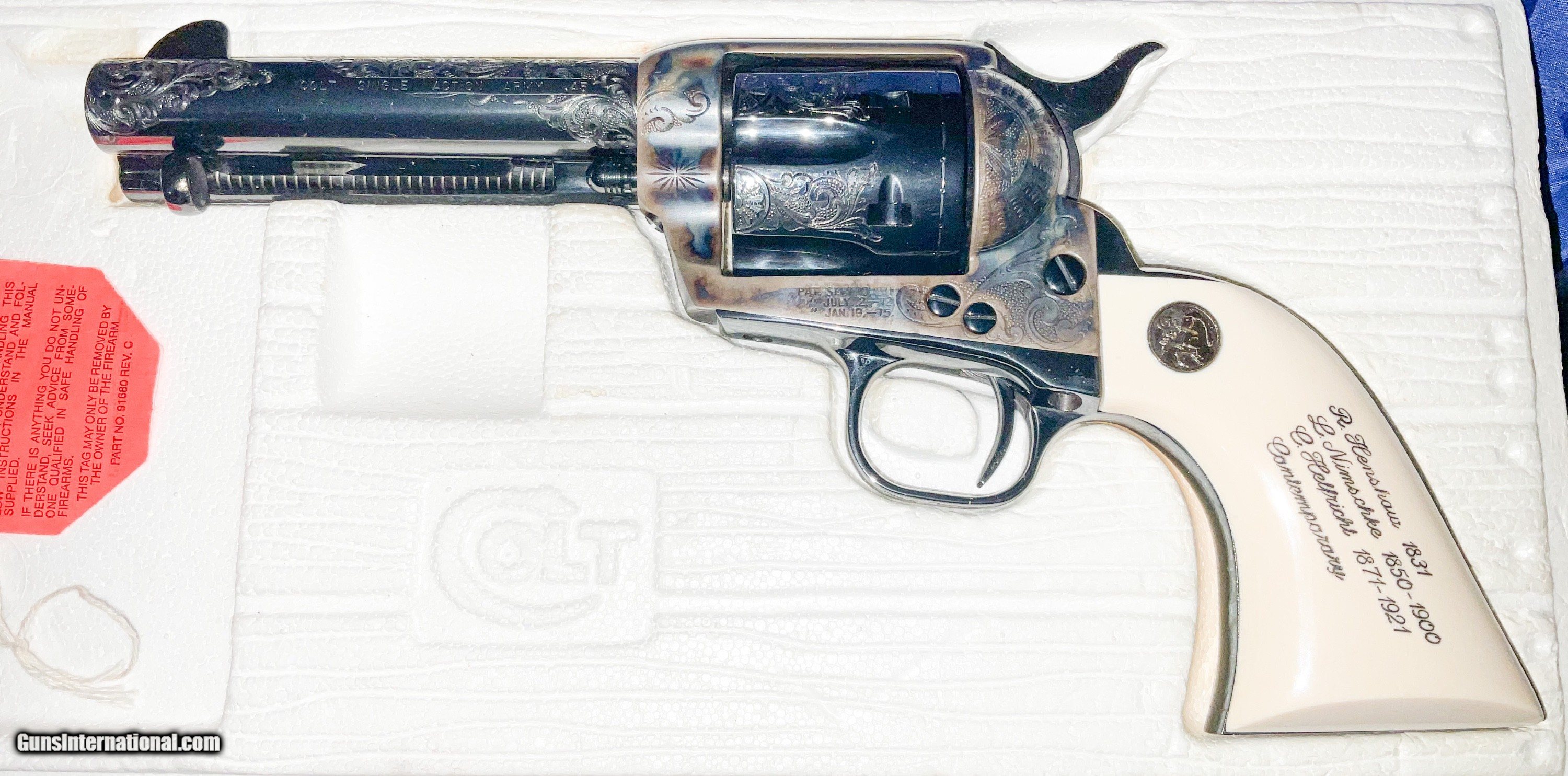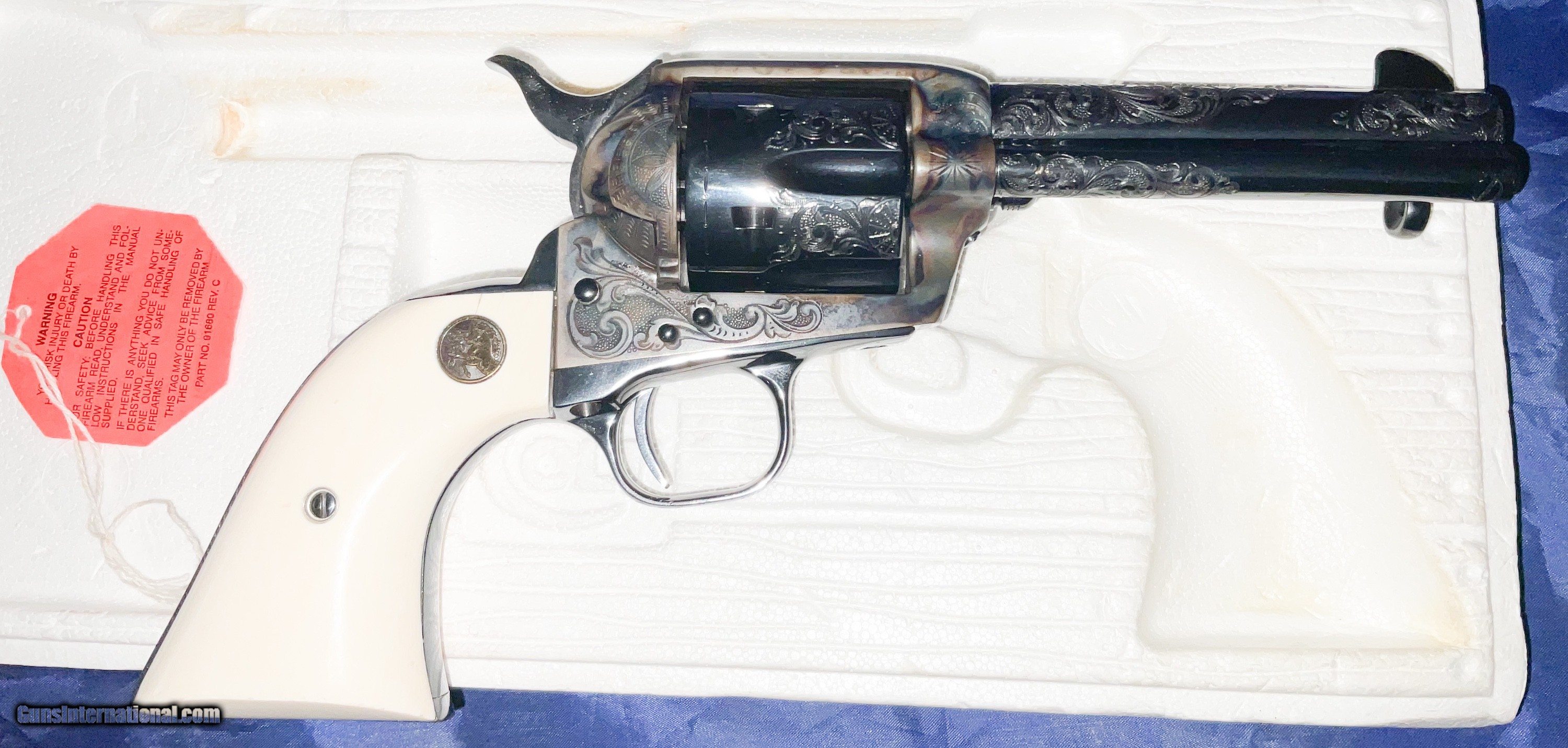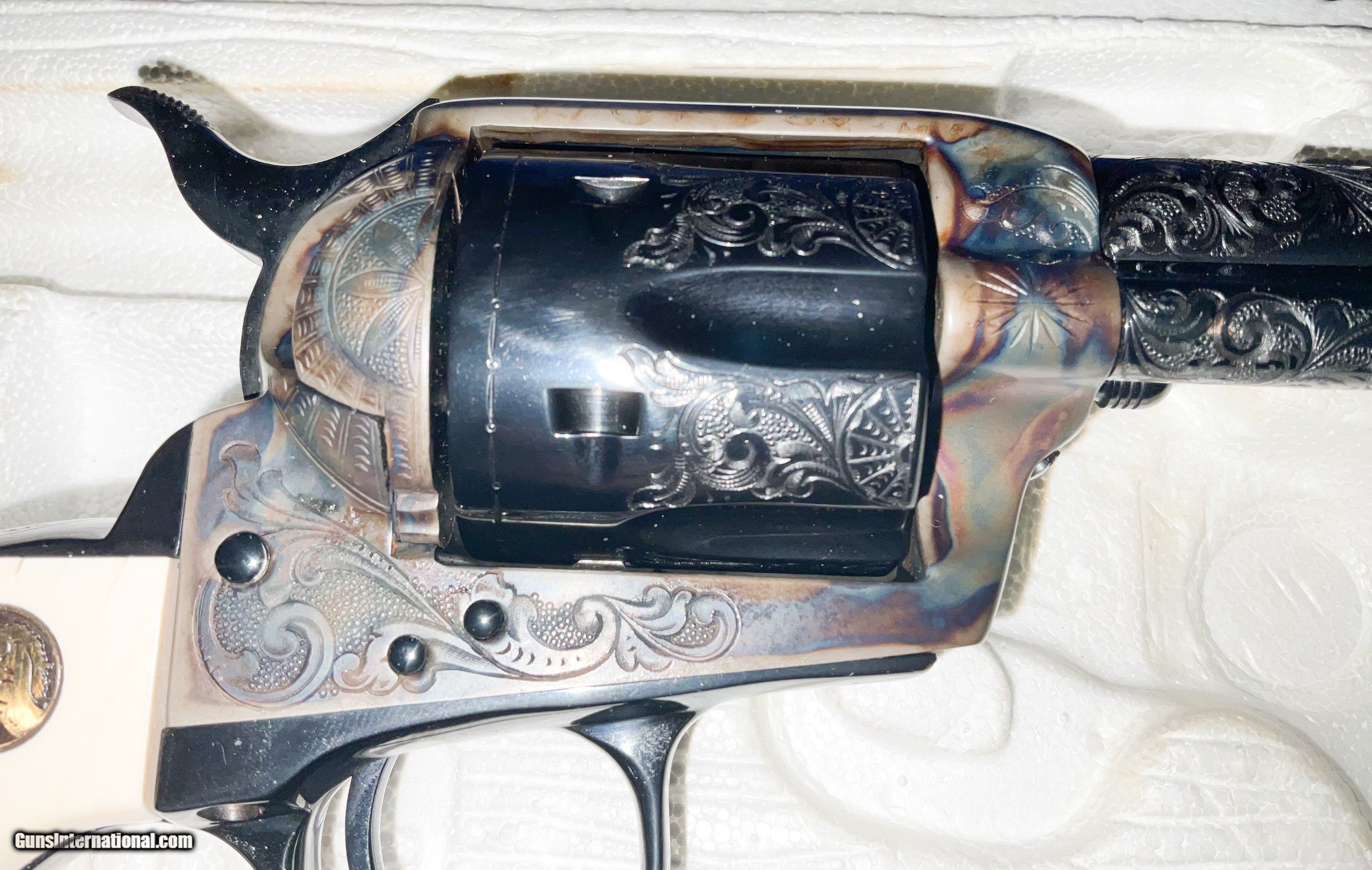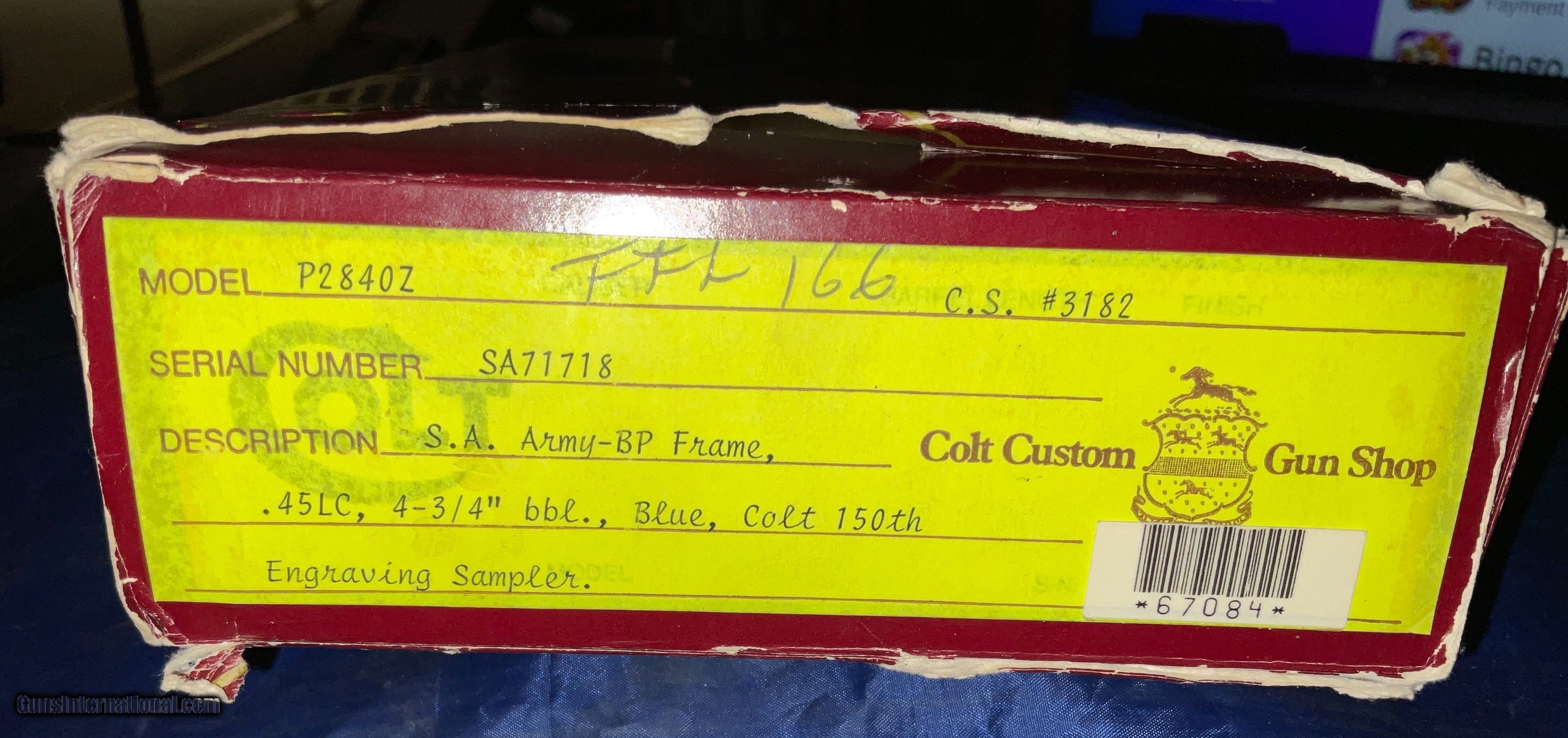 Description: ///////SOLD///// COLT ENGRAVIING SAMPLER 3rd Generation Colt Custom Shop Single Action Army, "Engraving Sampler" . Nickel plated with 4 - 3/4" barrel. Chambered in .45 LC. Features four classic styles of hand engraving in the tradition of Henshaw, Nimschke, Helfricht, and contemporary patterns. 2 piece ivory grips with Colt 150th anniversary medallions. Grips are scrimshawed with names of engraving masters. Backstrap engraved with Rampant Colt and marked in script "Colt Engraving Sampler". Complete with label matching correct Colt marked box no paperwork. CONDITION: new with all the factory nickel finish remaining. Cylinder never turned New old stock.This particular gun dates to 1988 SERIAL SA71718 . Very few Case Color/Blue 4 3/4" models were made. The majority were nickeled. These have been SELLING on GB for 6500+ and taxed! i will consider a reasonable offer, just contact me.best way is by phone email from Gunsinternational isn't making it through to me. If you contact me and agree to buy please follow through. Otherwise you waste my time and yours! I accept Cashier checks, money orders, Zelle and personal checks(held 10 days for bank clearance). I am not a dealer so must ship to your dealer. I need to ship from my dealer and he charges $110 to ship. Please feel free to ask questions and thanks for looking. NO SALES TO CA, NY, NJ OR IL SOLD Handgun Caliber: .45 Colt Manufacturer: Colt Model: SAA Barrel Length: 4 3/4 Condition: EXCELLENT Metal Condition: EXCELLENT Bore Condition: EXCELLENT Engraving: COLT |