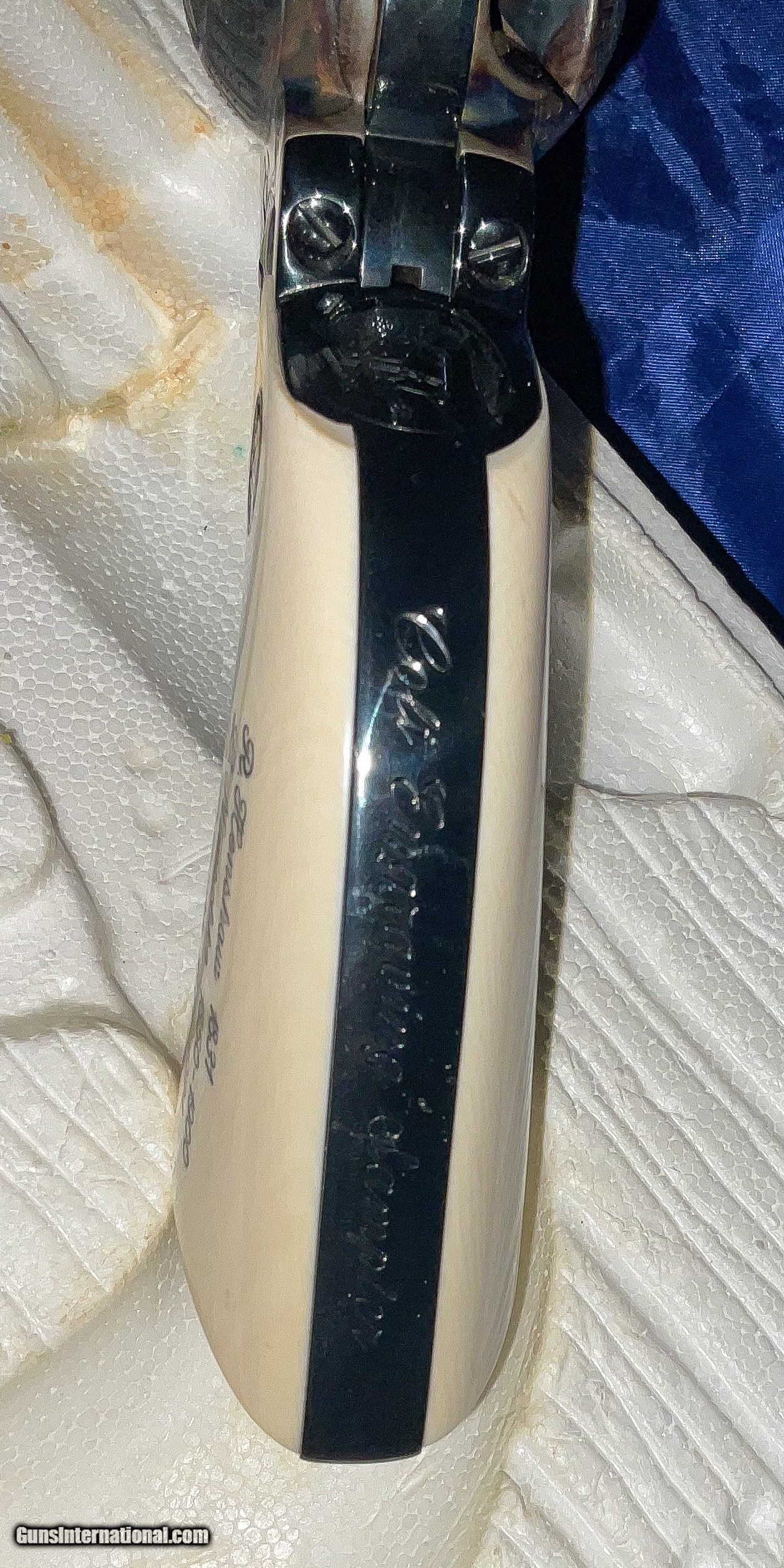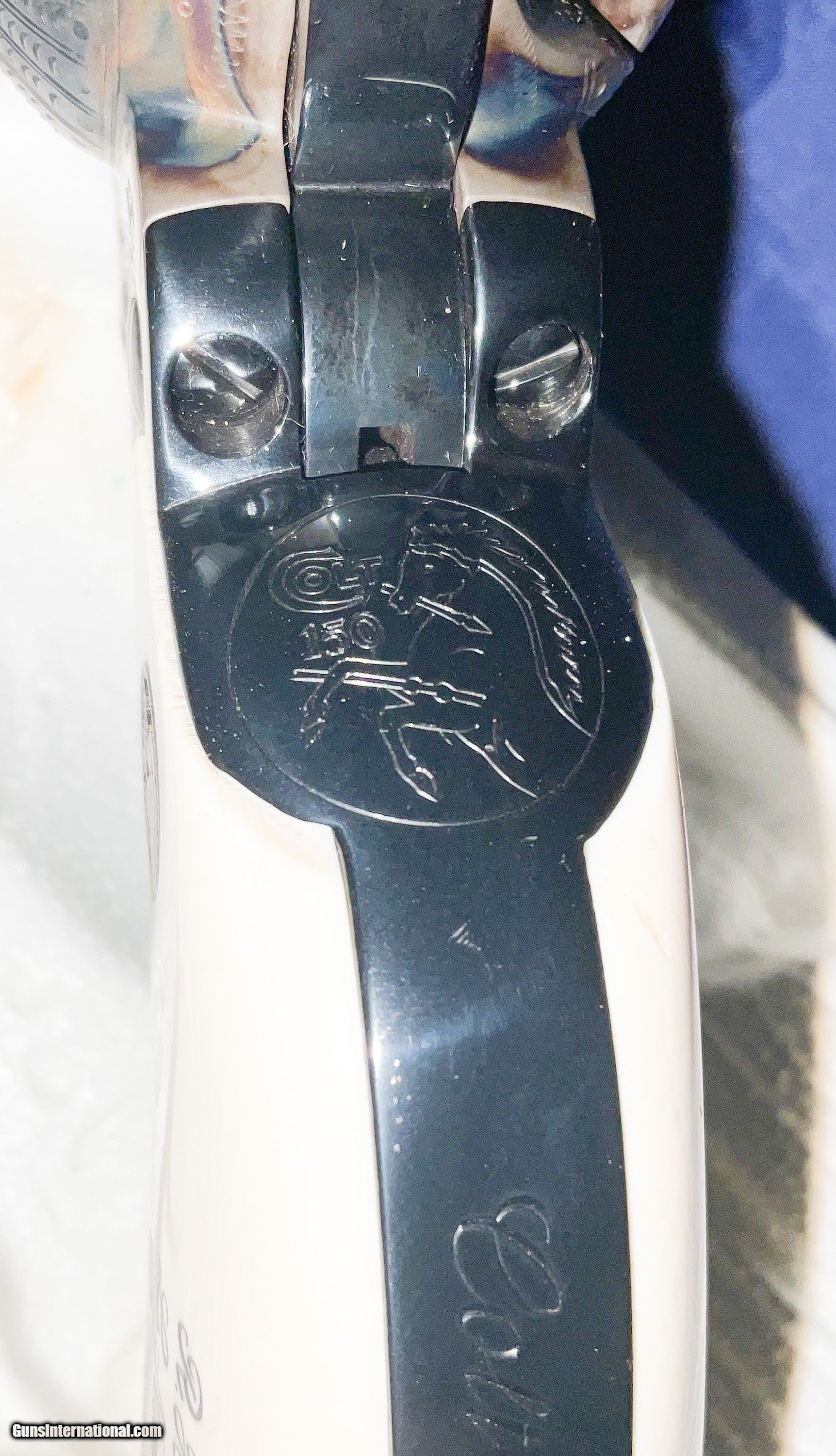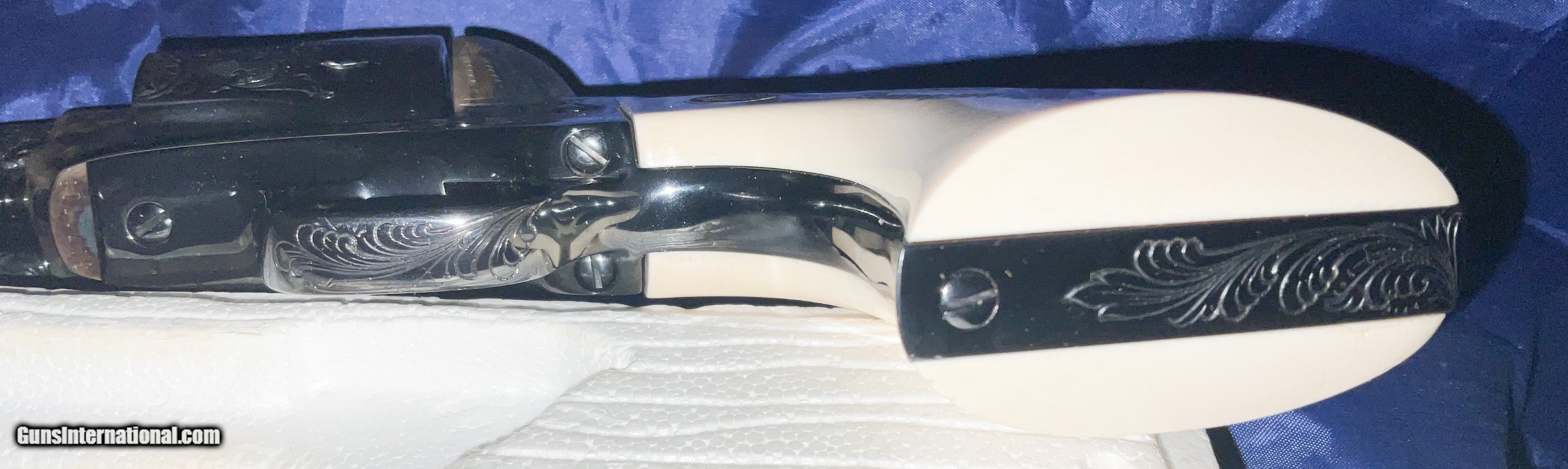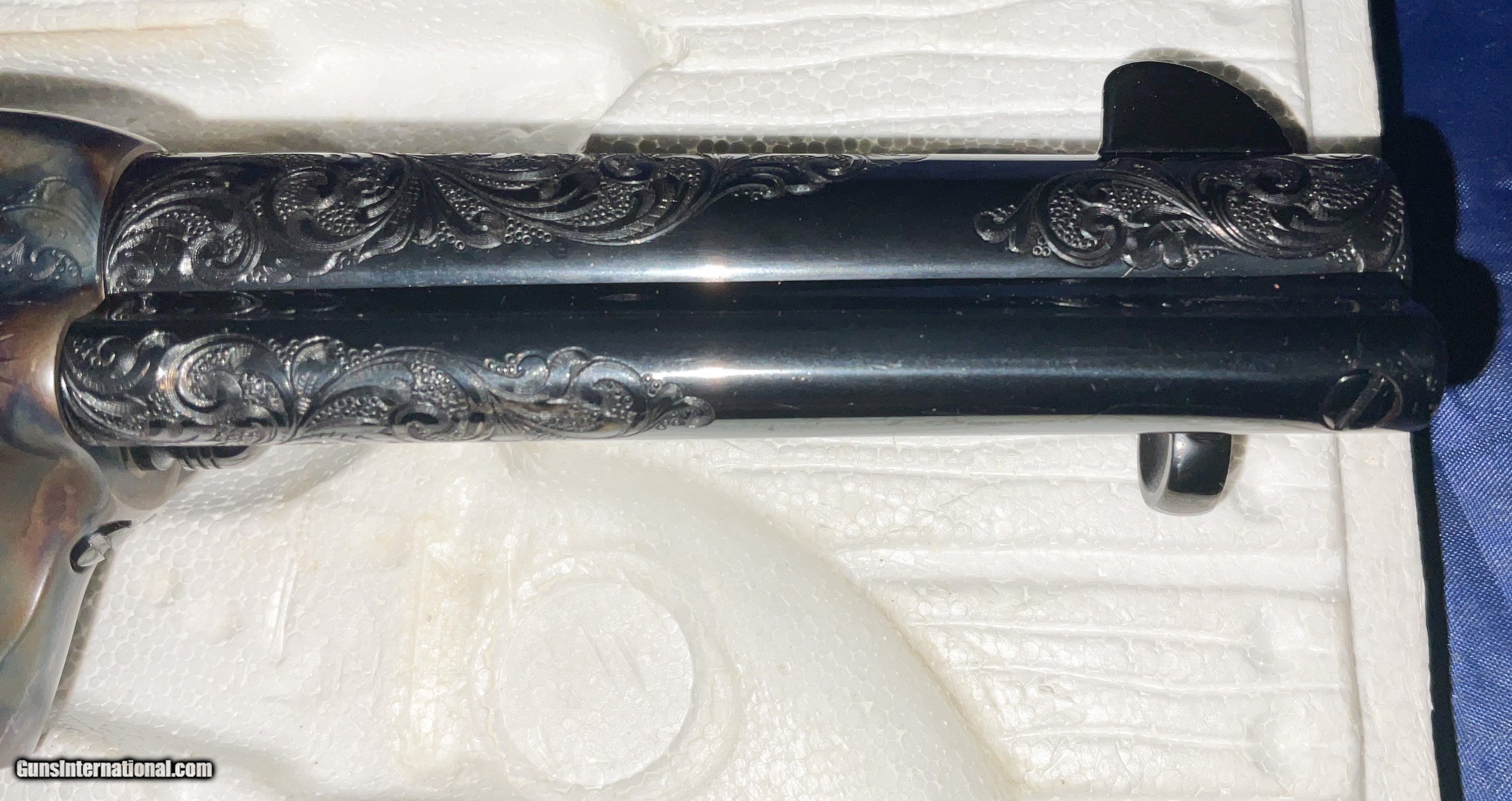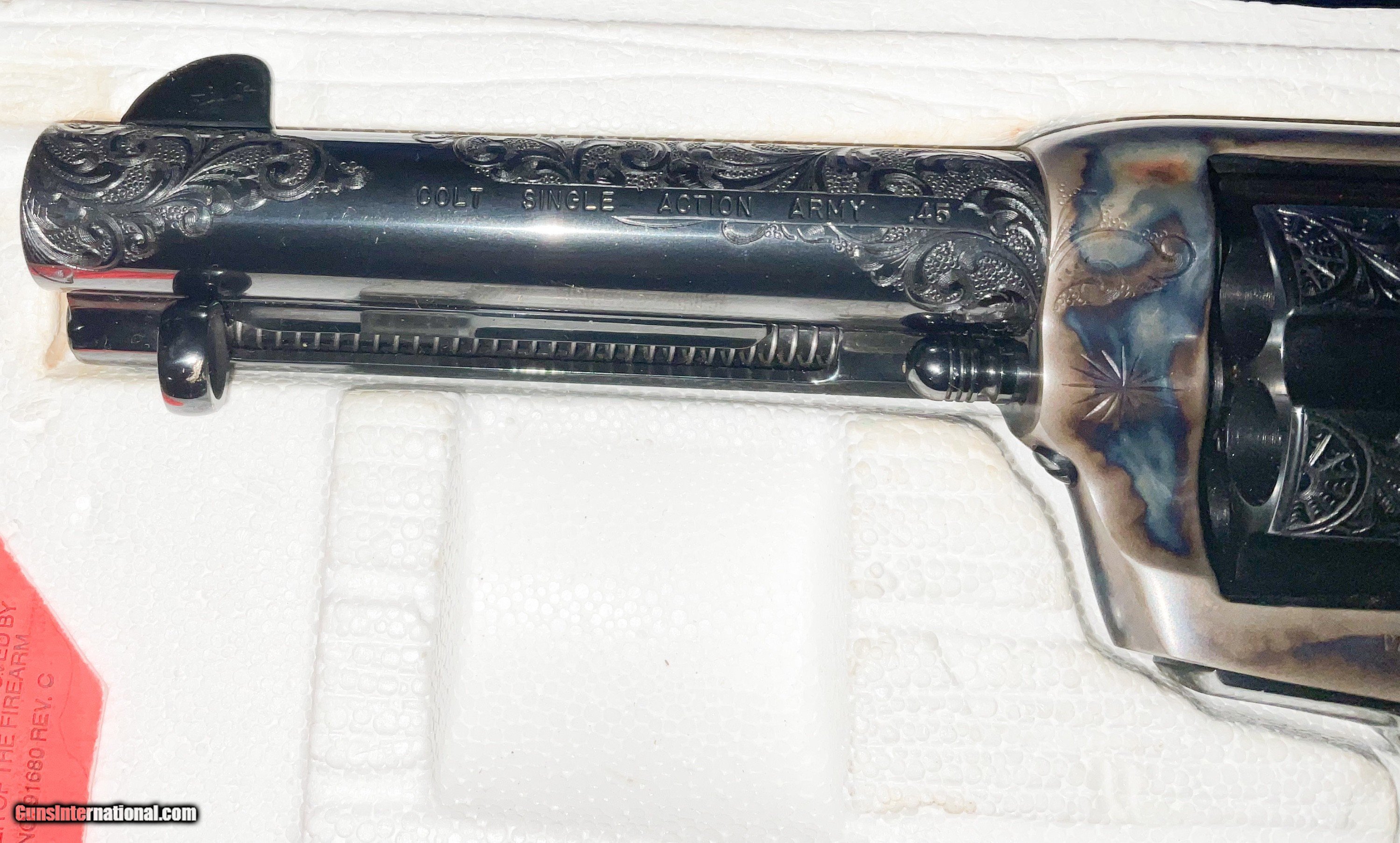 Description: ///////SOLD///// COLT ENGRAVIING SAMPLER 3rd Generation Colt Custom Shop Single Action Army, "Engraving Sampler" . Nickel plated with 4 - 3/4" barrel. Chambered in .45 LC. Features four classic styles of hand engraving in the tradition of Henshaw, Nimschke, Helfricht, and contemporary patterns. 2 piece ivory grips with Colt 150th anniversary medallions. Grips are scrimshawed with names of engraving masters. Backstrap engraved with Rampant Colt and marked in script "Colt Engraving Sampler". Complete with label matching correct Colt marked box no paperwork. CONDITION: new with all the factory nickel finish remaining. Cylinder never turned New old stock.This particular gun dates to 1988 SERIAL SA71718 . Very few Case Color/Blue 4 3/4" models were made. The majority were nickeled. These have been SELLING on GB for 6500+ and taxed! i will consider a reasonable offer, just contact me.best way is by phone email from Gunsinternational isn't making it through to me. If you contact me and agree to buy please follow through. Otherwise you waste my time and yours! I accept Cashier checks, money orders, Zelle and personal checks(held 10 days for bank clearance). I am not a dealer so must ship to your dealer. I need to ship from my dealer and he charges $110 to ship. Please feel free to ask questions and thanks for looking. NO SALES TO CA, NY, NJ OR IL SOLD Handgun Caliber: .45 Colt Manufacturer: Colt Model: SAA Barrel Length: 4 3/4 Condition: EXCELLENT Metal Condition: EXCELLENT Bore Condition: EXCELLENT Engraving: COLT |