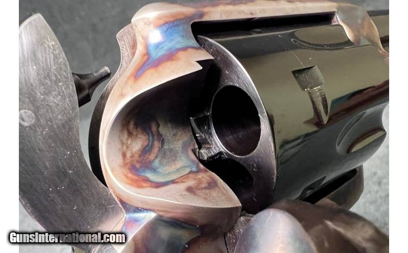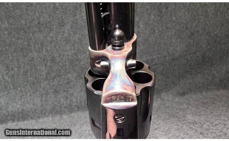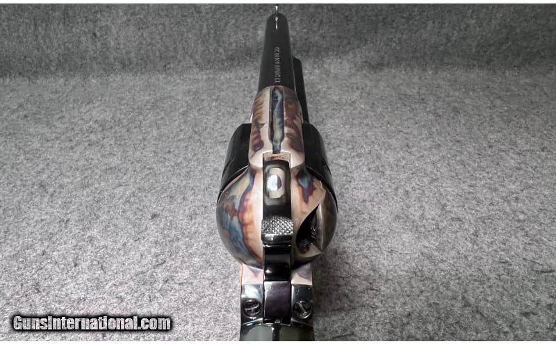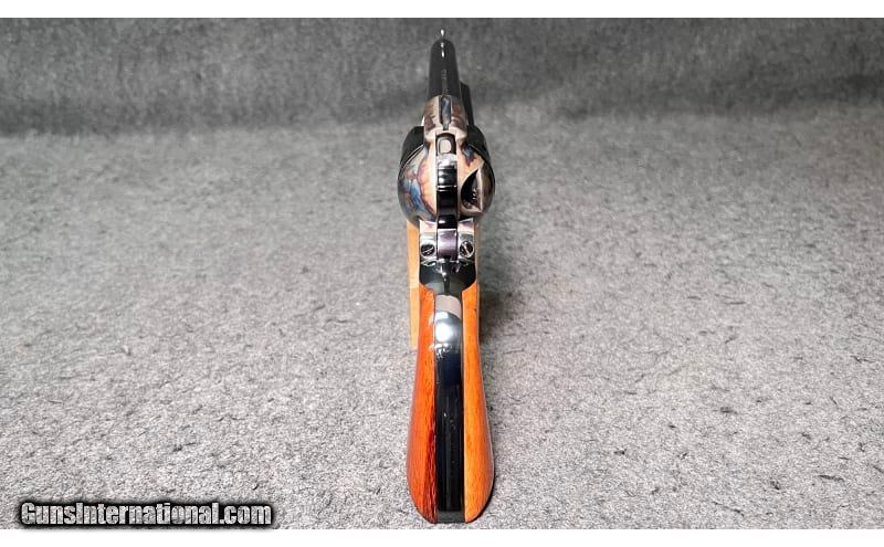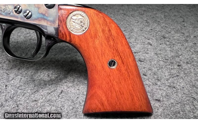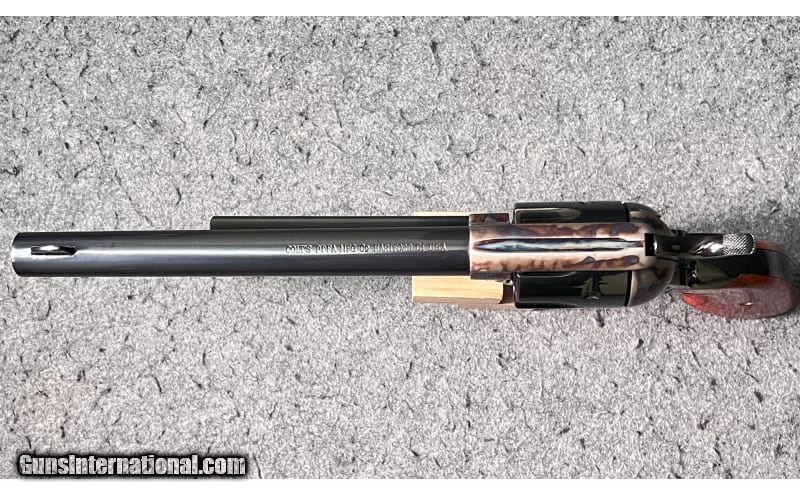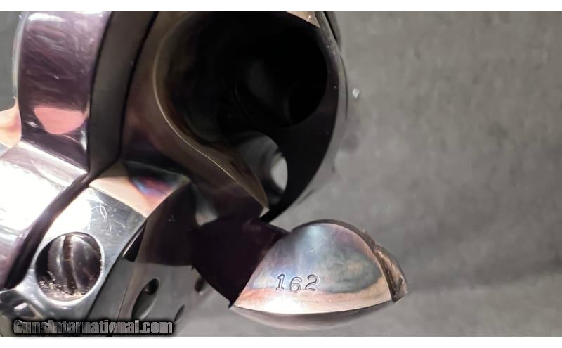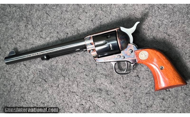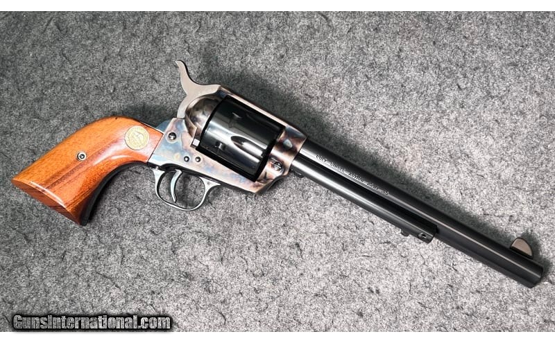 Description: This 1871 NRA Centennial 1971 Single Action revolver is a Colt Single Action Army chambered in .45 Colt. It has a fixed blade front sight, a rear grooved receiver sight, a 7½" blued barrel, a case color hardened frame, a stainless/blued checkered hammer, and gold Colt/NRA medallion grip panels. The left side of barrel is inscribed "1871 NRA Centennial 1971". The left side of the frame is marked "PAT. SEPT. 19, 1871 / JULY 2, 72 JAN.19,75" adjacent to the Rampant Colt Logo. The bottom of the frame has the three digit serial number: NRA397. The top of the barrel is marked "COLT'S PT.F.A. MFG. Co HARTFORD CT. U.S.A." The right side of the barrel is marked "COLT SINGLE ACTION ARMY .45". The Bluing is in excellent condition; firearm appears to be unfired; only a very faint turn line is visible on the cylinder. The wood grip panels are likewise in excellent condition with no marks, chips, cracks, or wear whatsoever. The bore is bright and shiny; firearm appears to be unfired. The wooden display case has a small glass window in the center of the lid with a commemorative medallion and has yellow felt padding inside. .45 Colt SOLD Chambers: 6-round cylinder Metal Condition: Bluing is in excellent condition; firearm appears to be unfired; only a very faint turn line is visible on the cylinder Wood Condition: "Wood grip panels are likewise in excellent condition with no marks, chips, cracks, or wear whatsoever Bore Condition: Bore is bright and shiny; firearm appears to be unfired Barrels: 7½" blued barrel Triggers: "Thin, curved blued trigger Stock Dimensions: 13" overall length Weight: 2 lbs 5 oz Sights: "Fixed blade front sight, rear grooved receiver sight Item Location: Wichita, KS |