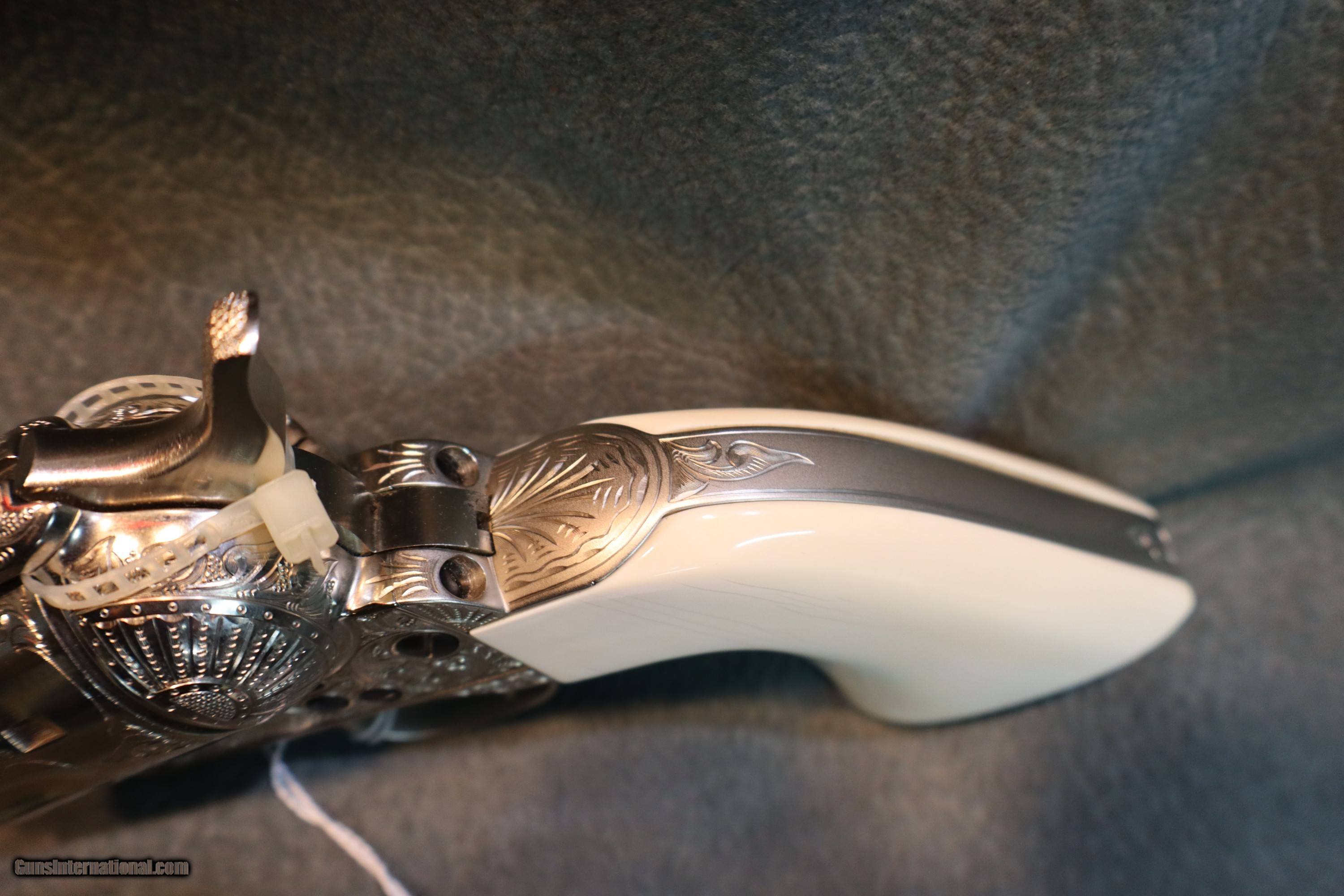 Description: Colt SAA 357Mag 4 3/4" barrel,fully engraved signed by Barnard.one piece Ivory grips,serial #SA35810,as new condition,looks unfired. GUN COLLECTIONS WANTED FOR CASH! We buy, sell, consign and trade new and used firearms. This is our 49th year in business. We offer 90 day layaways with 20% down. No return on layaways. Firearms will need to be transferred through a FFL dealer. Prices reflect a cash discount. There will be 3% added to credit card sales. We trade for gold and silver. THANK YOU! SOLD |