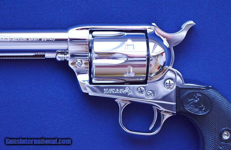 Description: Colt Single Action Army 3rd Generation Model P3851 in .38-40, S20XXXA manufactured 1997. Features Nickel Plated finish with 5 ½” barrel, fitted with black checkered eagle grips. Condition is as new, complete with Colt factory blue hard case with matching end label numbered to the revolver, hang tag & papers. Big Iron Firearms & Collectibles is a family owned & operated business. We are a licensed FFL Dealer & stand behind all of our listings. We try to replicate all aspects of the firearm in our photos & if you’re not completely satisfied, we will refund 100% of the purchase price during the 3 day inspection period. We Do Not Charge credit card fees, all major credit cards are accepted. We offer a 2% discount on sales price for items purchased with a money order, cashier or personal check, with item held until cleared. Will M. at 260-319-6961 SOLD |