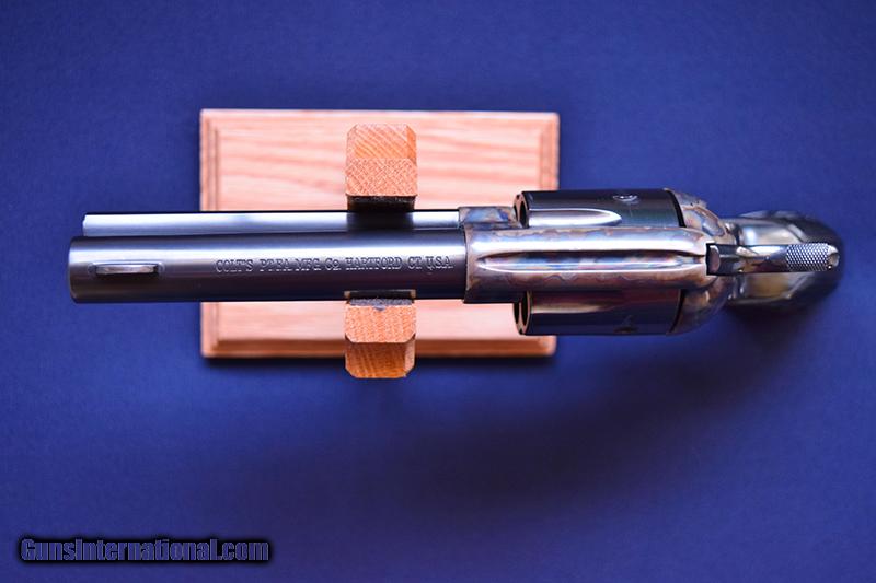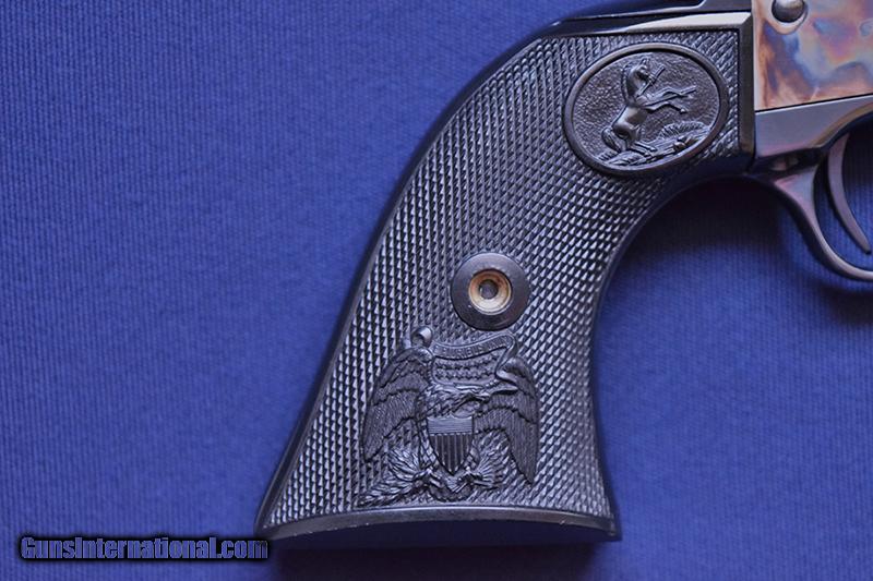 Description: Colt Single Action Army 3rd Generation .45LC, SA25XXX manufactured 1979. Features 4 ¾” blued barrel with color casehardened frame, fitted with black checkered eagle grips. Condition is excellent with vibrant case colors, showing light edge wear on cylinder with a light drag line & little muzzle wear. Complete with Colt Factory woodgrain box with matching label numbered to the revolver & papers. Box shows wear with torn end flaps. This Colt would make a nice shooter. Big Iron Firearms & Collectibles is a family owned & operated business. We are a licensed FFL Dealer & stand behind all of our listings. We try to replicate all aspects of the firearm in our photos & if you’re not completely satisfied, we will refund 100% of the purchase price during the 3 day inspection period. We Do Not Charge credit card fees, all major credit cards are accepted. We offer a 2% discount on sales price for items purchased with a money order, cashier or personal check, with item held until cleared. Will M. at 260-319-6961 SOLD |